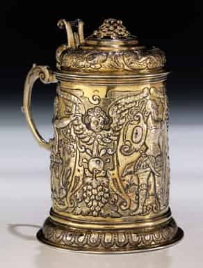 Silber, getrieben, gegossen, punziert und vergoldet. Profilierter Stand mit zylindrischem, sich leicht verjüngendem Korpus mit barockem Treibdekor: offene Kartuschen mit Kriegerdarstellungen durch Cherubine getrennt. S-Henkel mit Rollwerkdaumenruh und Steckdeckel in gedrückter Haubenform mit wohl ergänztem Aufsatz in vegetabilen Formen. Vergoldung stellenweise berieben. (961903)