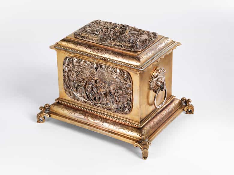 Rechteckige Schatulle mit drei Reliefdekoren von Bacchanten. Seitlich applizierte Widderköpfe, im Inneren die eingesetzten Silberdosen mit gravierten Deckeln. (7808323)