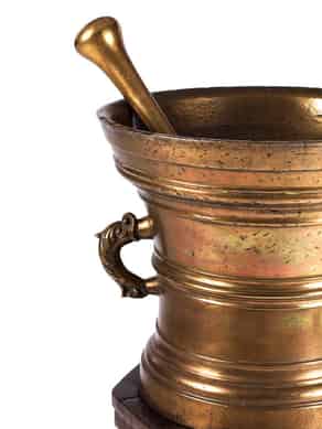 Der Mörser in Gelbguss, mit seitlichen Henkeln in Form von Delfinen, deren Leib blattförmig ausgearbeitet ist. An der Wandung glockenförmig eingezogen mit umlaufenden, kräftigen Profilbänderungen und antreppendem glattem Grundprofil. Nach oben sich weitend mit glattem, geradem Lippenband. Zugehöriges großes Pistill. Der Holzstand in Eiche, in Form eines achtseitigen Pfeilers mit kräftigen Sockelprofilen und einem umziehenden, wulstförmigen, mittleren Profil, dunkelbraun gebeizt.