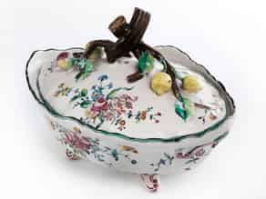 Ovale Gefäßform, der Deckel gewölbt, mit naturalistisch gestaltetem Griff in Form zweier verschlungener Apfelzweige und Zitronen. Auf dem Deckel und an der Wandung polychrome Blumenmalerei. Bemalung in Muffeltechnik. Längerer, in Schwingung einziehender Setzriss, durch Klebeinjektion gesichert.