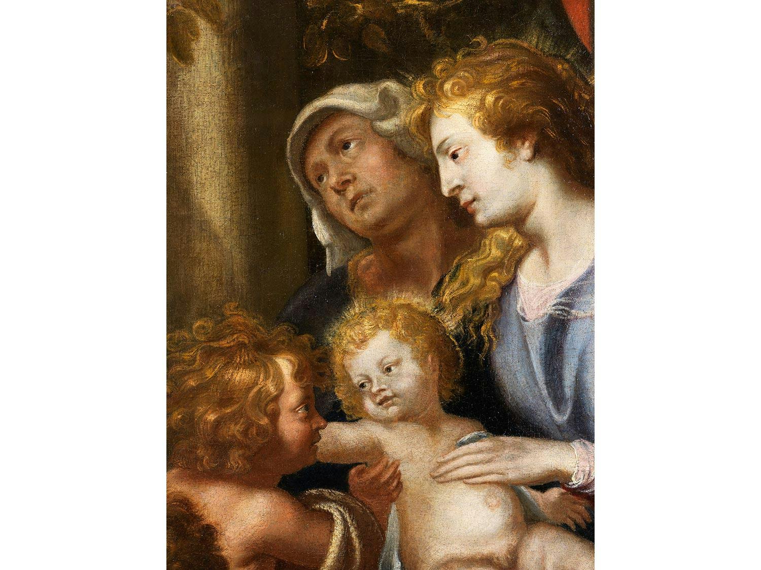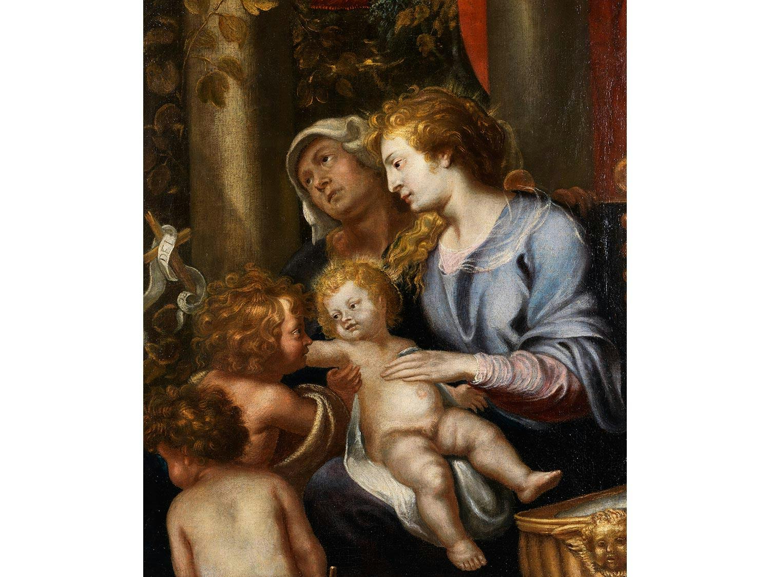 Unter einer Veranda, von der linksseitig im Hintergrund eine blattumrankte Säule und rechtsseitig eine weitere Säule vor einem roten herabhängenden Vorhang zu sehen ist, die sitzende Maria mit langen gold-blonden Haaren und einem kleinen Strahlennimbus hinter ihrem Haupt. Sie trägt ein Gewand in Zartrosa und Hellblau und hält in ihrem Schoß den nackten, auf einem weißen Laken sitzenden Jesusknaben mit goldglänzendem Haar, erneut hinterfangen von einem Strahlennimbus. Jesus wendet sich mit ausgestrecktem rechtem Arm und Blick dem neben ihm stehenden Johannesknaben zu, der durch sein ihm attributiv zugeordnetes Stabkreuz mit herabhängendem Rotulus gekennzeichnet wird. Am rechten unteren Rand ist wohl als Verweis auf Johannes zudem ein goldenes Taufbecken zu sehen. Hinter Jesus die stehende Heilige Anna, die Mutter Mariens, mit ergeben nach oben gerichtetem Blick. Am unteren linken Rand, in Rückenansicht, ein weiteres Kind. Malerei in überwiegend zurückhaltenden weichen Farbtönen, wobei insbesondere das helle, fast weiße Antlitz Mariens und das des Jesuskindes besonders herausgestellt werden. (1441252) (18)