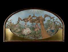 1850 München - 1912 Eglfing/Murnau GALANTE TANZSZENE IM ROKOKO-PARK Querovales Dekorationsstück mit Darstellung eines höfischen in Rokoko-Kostüm gekleideten Paares mit seitlichen, weiteren Figuren durchzogen von Rocaille-Ornamentik und tuchhaltenden Putten. Im Hintergrund ein antiker Tempel im Park. Tempera/Mischtechnik/Karton. 48 x 89 cm. Durch Passepartout an der Unterseite oval eingefasst. Im korbbogig gewölbtem Rahmen. Verso Sign. des Künstlers. (560334)