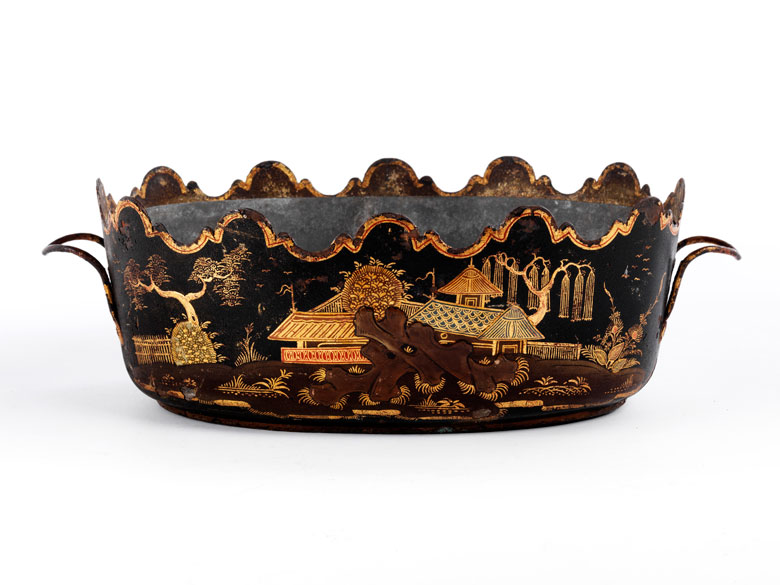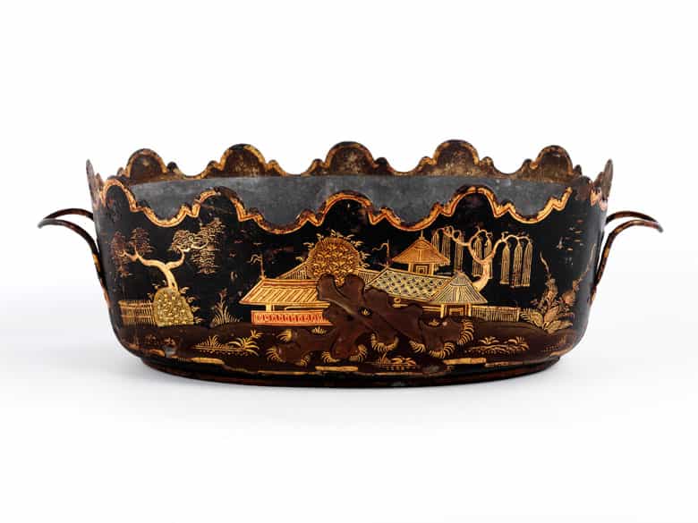 Metalljardinière mit Zinkeinsatz. Ringsum dekoriert mit feinem Chinoiserie-Lackdekor von Landschaften, Bäumen und Architektur auf schwarzem Fond. Seitlich Griffe. Guter Erhaltungszustand. (780805)