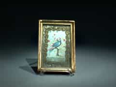 Mit Darstellung eines Papageis auf einem Baum, umgeben von Gold- und Silberborten. Mit Inschrift:"Was lieblich ist, ist Liebenswert darumbend ich mein Hertz verehrt." Im Waschgoldrahmen. Verso in altdeutscher Schrift Widmungstext mit persönlichen Daten von 1797 und später sowie Ortsangabe Tirschenreuth. 16 x 11 cm. (4012310)