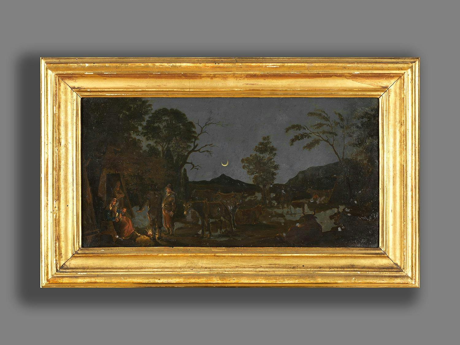 In weiter bergiger Landschaft unter nächtlichem Himmel mit Mondsichel eine Hirtenfamilie mit aufgestellten Hütten, die sich linksseitig an einem offenen Feuer wärmt, darunter eine sitzende Mutter mit Kind, auf die der Feuerschein fällt. In der Bildmitte die zum Teil sitzenden Kühe und Rinder, sowie ein neugierig die um das Lagerfeuer versammelten Figuren betrachtendes Maultier. (1440486) (3) (18)