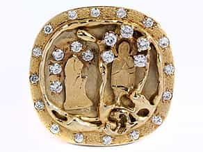 Massiver, in 14 kt Gelbgold gearbeiteter Ring, mit Brillanten besetzt. Darstellung der Maria im Strahlenkranz. Brillanten zusammen ca. 1,6 ct. Bezeichnet "Lourdes". (880081)