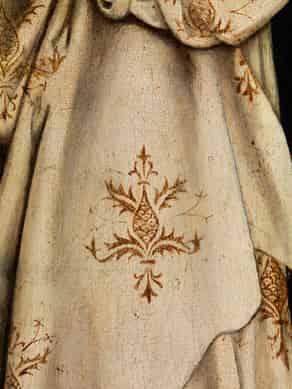 Wohl rechter Flügel eines mehrflügeligen Altares, in dem der bislang nicht eindeutig identifizierte Heilige im Zentrum stehend wiedergegeben ist. Er steht in einer gotischen Loggia vor dem Hintergrund einer Landschaft mit Mauerbögen, Mauertor und Befestigungstürmen sowie blauen Bergen am fernen Horizont und rechts hochziehendem, baumbestandenem Hügel. Die Hauptfigur in schwarzem Kleid trägt darüber einen weißen Mantel mit goldener Ornamentik in Art von stilisierten Distelblüten, in der Art von Brokatstickerei. Am Revers eine medaillonförmige, goldene Agraffe. Der Heilige steht leicht nach links, das Gesicht jedoch geradeaus aus dem Bild heraus blickend, gerahmt von seitlichen, dunkelblonden, feinen Locken, die zu den Schultern herabführen, darüber eine rote Kappe. Die rechte Hand in einer innehaltenden Geste erhoben, der Blick nachdenklich. Rechts drei Herren im Gespräch einander zugewandt, in schwarzer bzw. grüner Kleidung, ebenfalls mit der Zeitmode entsprechenden Kappen. Links drei kniende, junge Männer, die die offenen Hände dem Heiligen entgegenhalten. Das Paviment zeigt eine Marmorverplattung, die perspektivisch leicht nach links hinten zieht. Im Mittelgrund der Wasserlauf eines Befestigungsgrabens mit darüber gelegter Holzbrücke, an deren Geländer ebenfalls eine weiß gekleidete Figur mit roter Kappe steht, wohl synchronoptische Wiedergabe aus dem Leben des Heiligen. Die Loggia überwölbt den linken Teil der Darstellung, die Tonnenwölbung wird getragen von vier flachen Pfeilern, die durch das gotische Maßwerk miteinander verbunden sind, goldene Kapitellkämpfer tragen die Querbalken. Rechts wird die Loggiaöffnung durch ein Maßwerk überwölbt. Der Figurenstil, die Wiedergabe der Gesichter vor allem aber auch die Gebäude im Hintergrund zeigen sich völlig charakteristisch für den französischen Malstil der Schule von Touraine, wie wir sie auch im Werk des Nicolas Froment finden, beispielsweise in "Die Heilige Martha verkündet Jesus den Tod des Lazarus" von 1461, das Teil eines Triptychons ist und sich in den Uffizien in Florenz befindet. Auch bei Jean Fouquet finden wir eine gleichförmige Architektur in den Schlossgebäuden, u. a. in den Miniaturen "Heilige Anna und die Drei Marien" in dem Stundenbuch des Estienne Chevalier. Guter Erhaltungszustand.