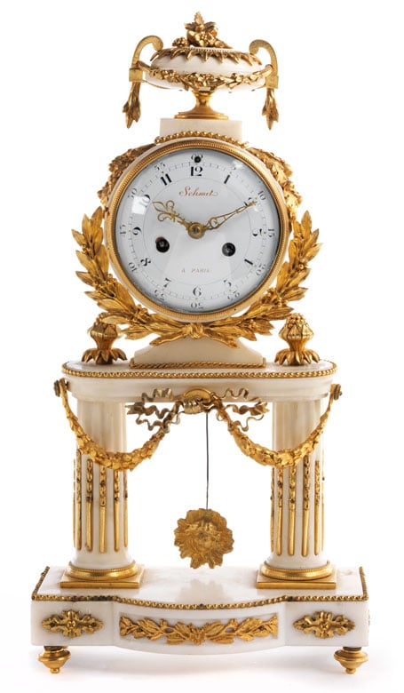 Über vier gestauchten Kugelknäufen mit Reliefnodus, rechteckiger Marmorsockel mit hervorspringendem Rund. Davor zwei kannelierte Säulen, einen rechteckigen Architrav mit abgerundeten Ecken tragend, darüber das zentrale Zifferblatt mit Lorbeerblättern umrahmt und gestauchter, antikischer Vase bekrönt.