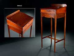 Vier hohe, gerade Vierkantbeine mit Stegverbindung, Absatzkasten mit schräger Pultplatte. Inneneinbau durch kleine Schübe. H.: 120 cm. B.: 57 cm T.: 53 cm. Anfang 19. Jhdt. (560282)