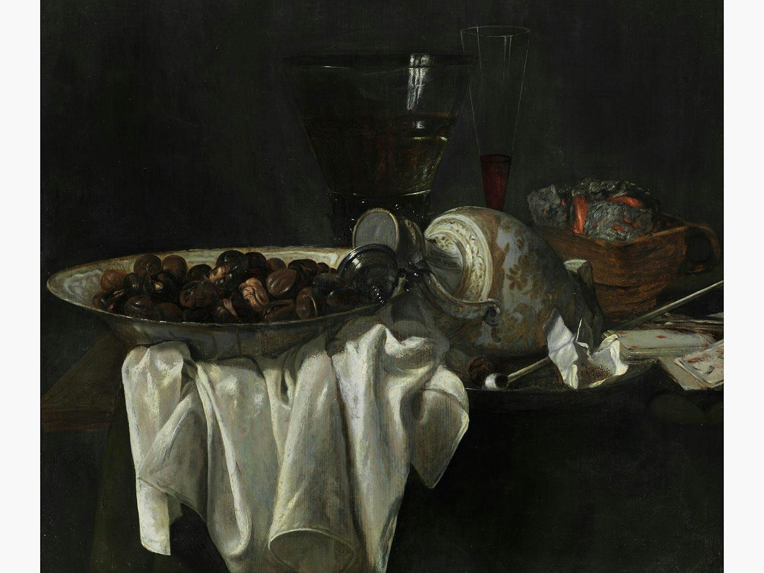 Auch in diesem Bild überwiegt der für den Maler und seine Werke typische Eindruck einer monochromen dunkeltonigen Auffassung in höchster Eleganz. Dabei hat der Maler auch die Gegenstände in einen hell-dunklen Gegensatz gestellt, wie etwa das weiße Tuch, die Meerschaumpfeife, Papierstücke oder die liegende Vase gegenüber den dunklen Kastanien und dem dunkelfarbigen großen Glasbecher, dessen grüner Glaston im Hintergrund Entsprechung findet. Rest. Das vorliegende Werk lässt sich gut mit erhaltenen Werken Trecks in der National Gallery in London und dem Museum in Budapest besonders hinsichtlich des bläulichen Grundes vergleichen. Weitere markante Gemälde des Malers sind auch im Rijksmuseum in Amsterdam, in Berlin und in Kassel zu finden.