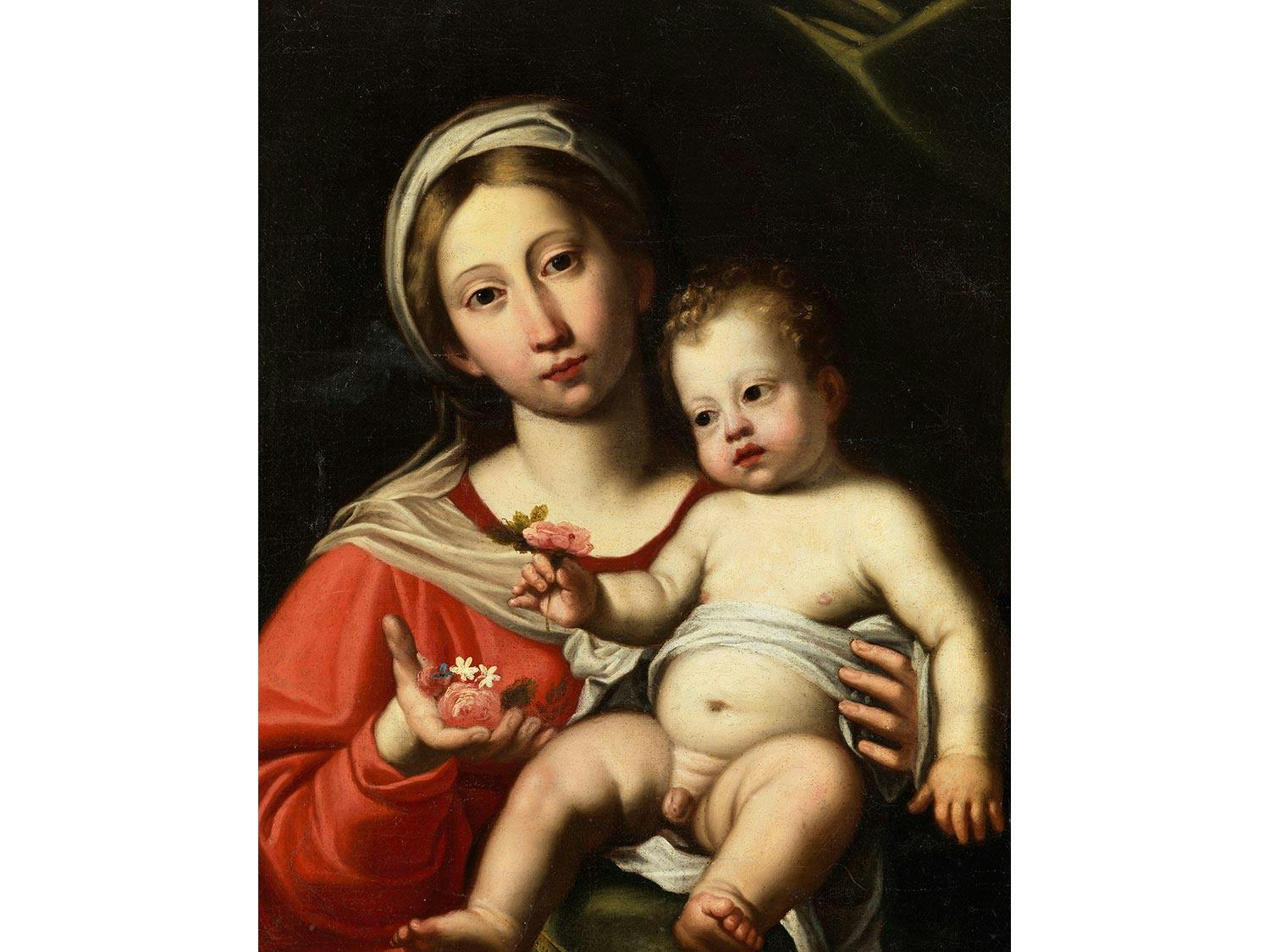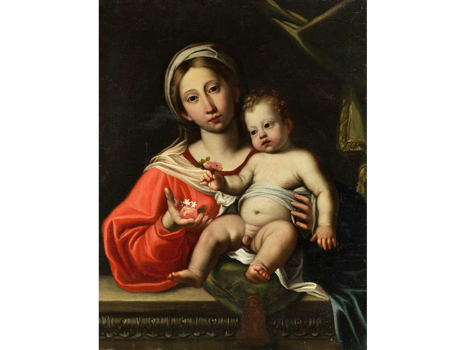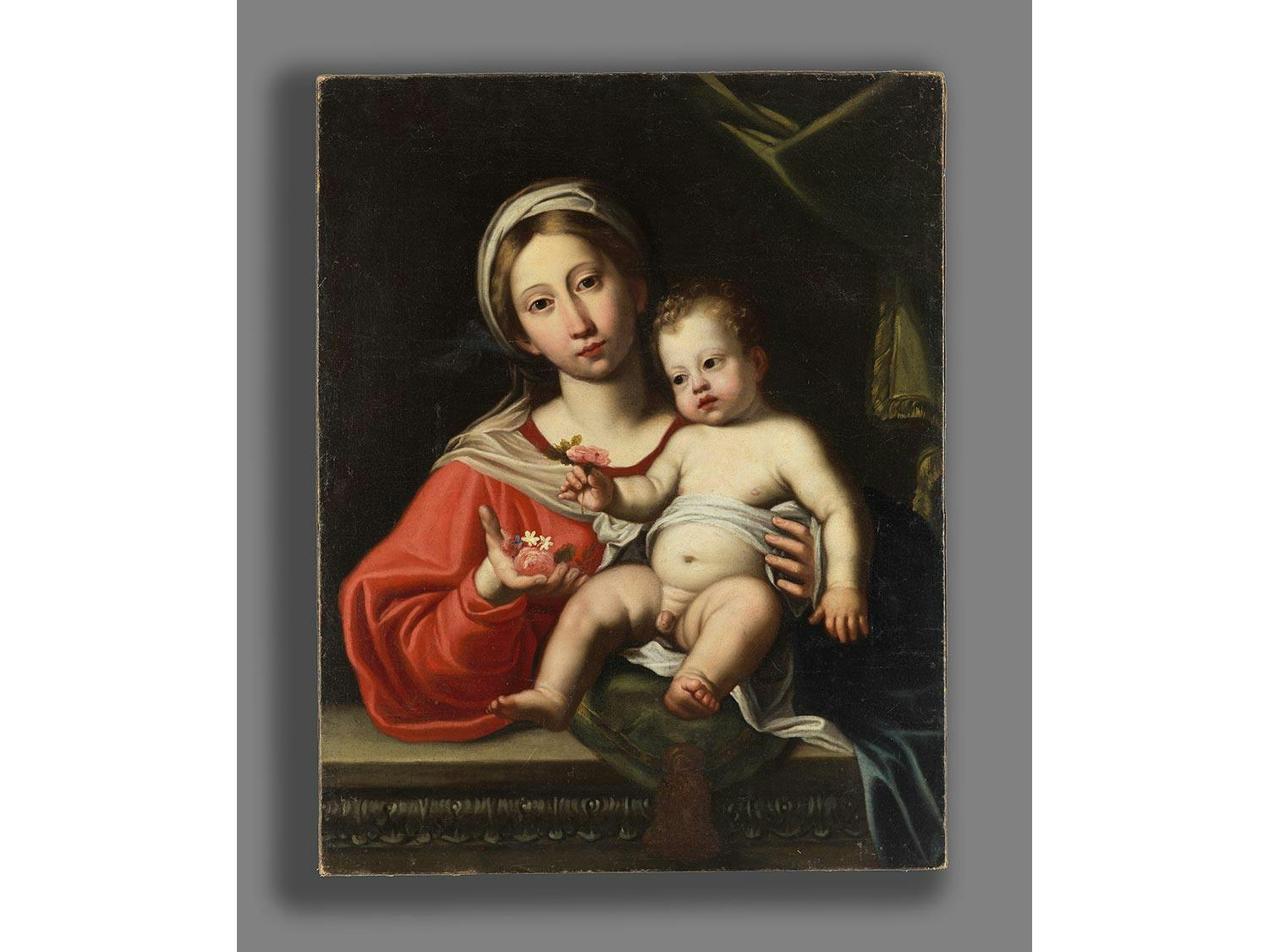 Vor dunklem Hintergrund mit zur rechten Seite gezogenem Vorhang das Halbbildnis der Madonna hinter einer Steinbrüstung, auf der sie den auf einem grünen Samtkissen mit herabhängender Goldquaste sitzenden, fast nackten Jesusknaben mit ihrer linken Hand hält. Ihr Haupt ist mit einem weißen Tuch bedeckt, zudem trägt sie ein rotes Gewand und hat ihre rechte Hand nach vorn ausgestreckt, in der eine rote Rose und zwei kleine weiße Blüten zu sehen sind. Auch der Jesusknabe hält in seiner rechten Hand eine kleine Rose. Mit ihrem ovalen Gesicht mit rosafarbenen Teint und dem Mittelscheitel der Haare steht das Gesicht der Madonna der kumäischen Sibylle von Domenichino (Rom, Galleria Borghese) sehr nahe. Der Ausdruck der roten Münder und dunklen, fast schwarzen Augen von Maria und Jesus zeigen anschaulich die Meisterschaft in der Darstellung von Emotionen, die schon von den Zeitgenossen gelobt wurde. Teils Retuschen.