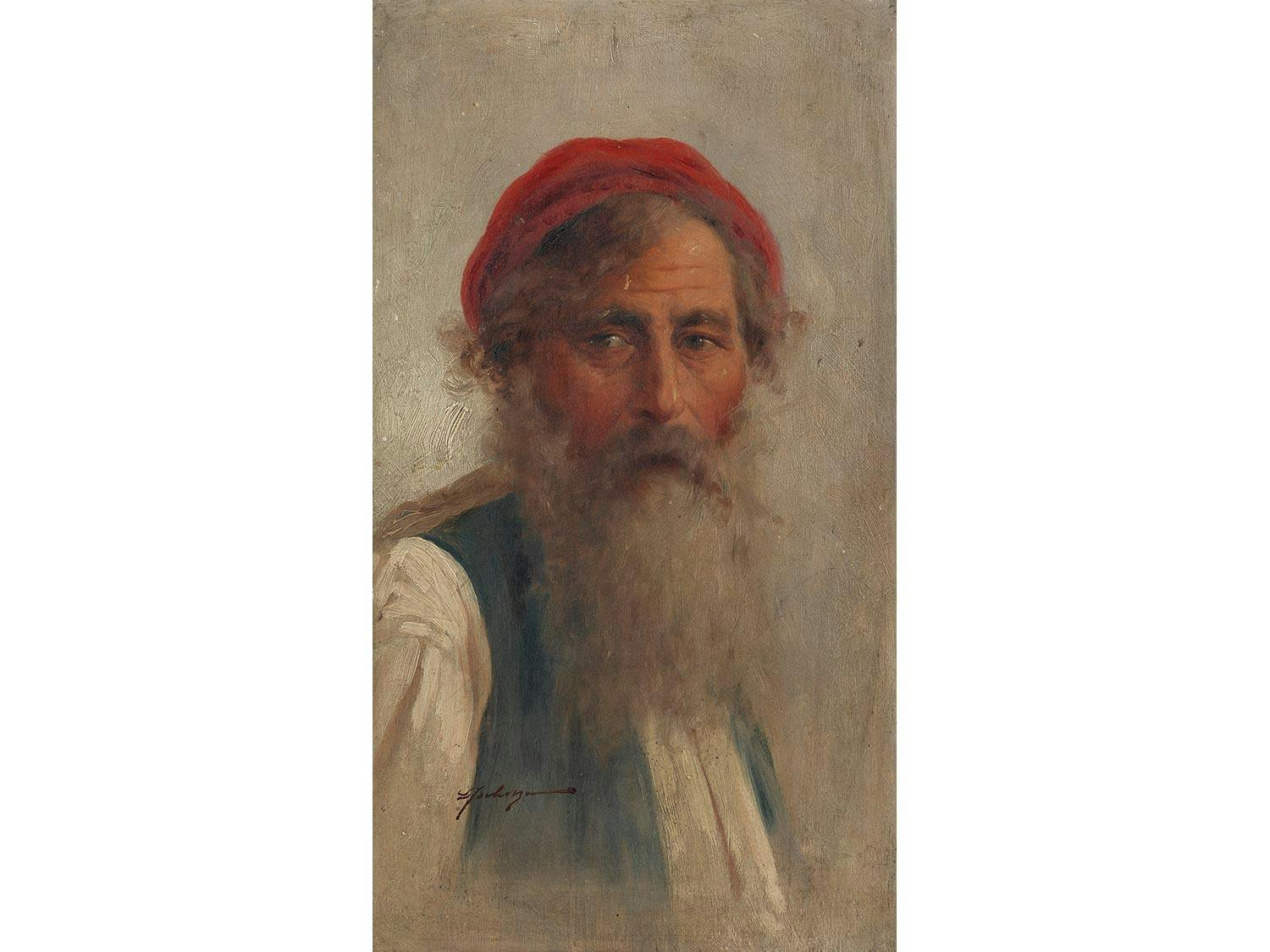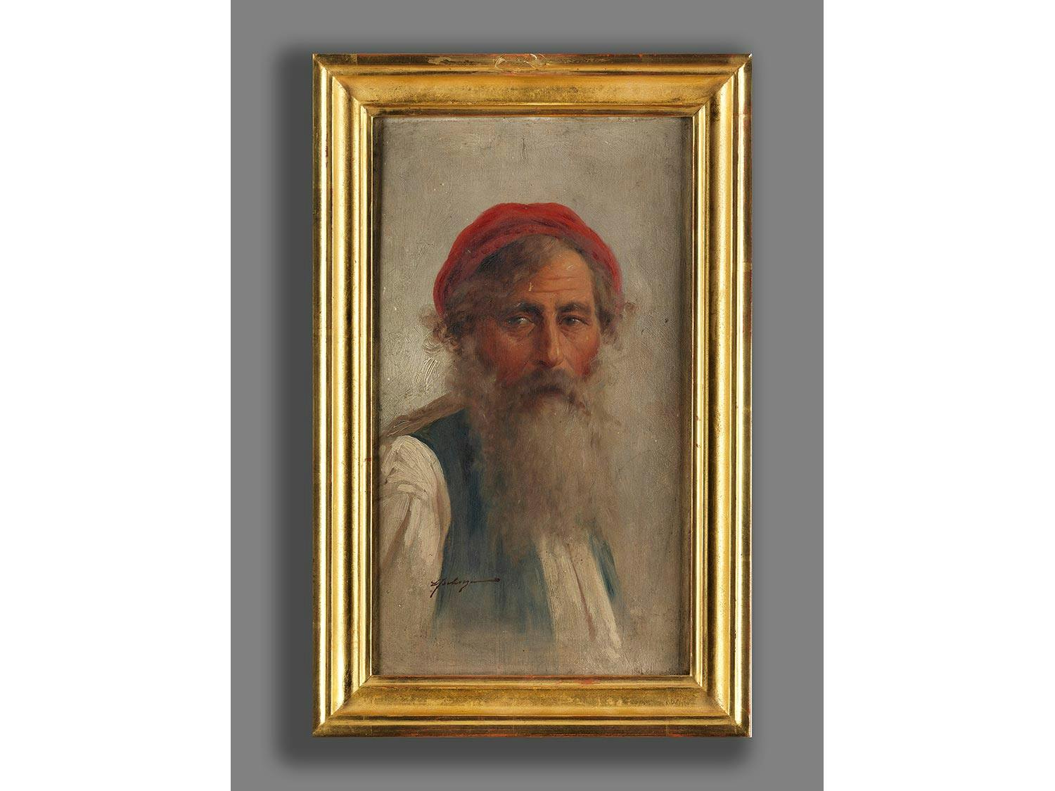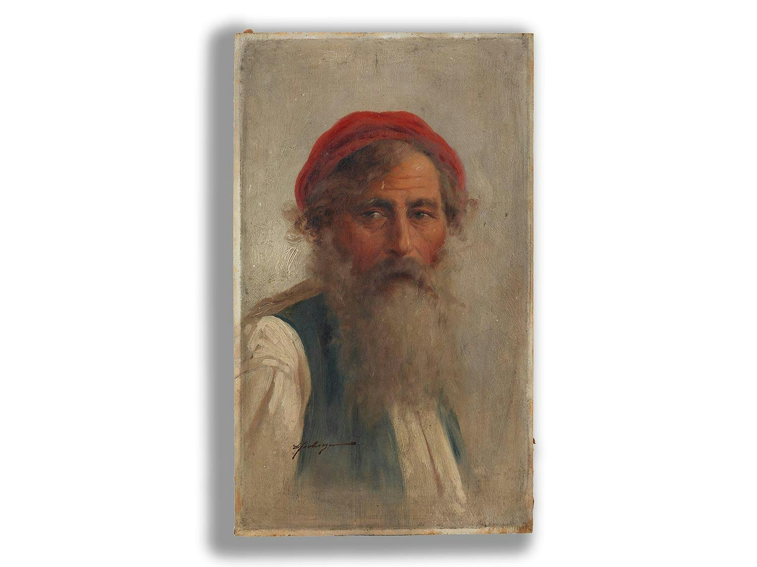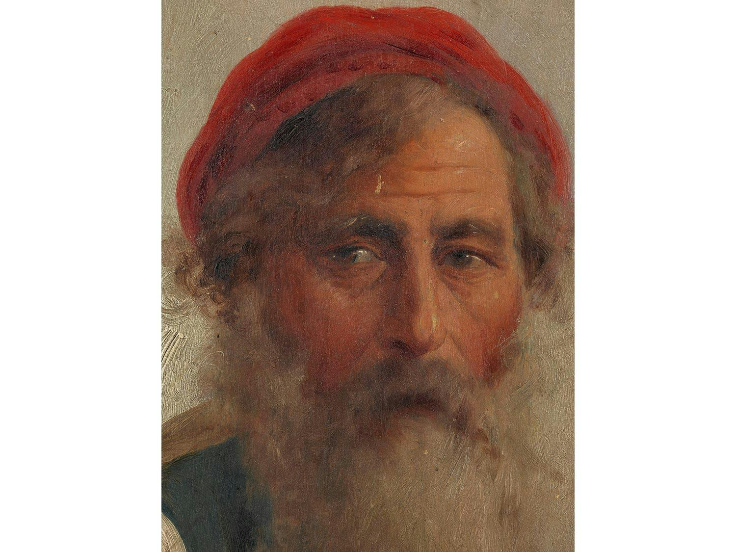 BÄRTIGER MANN MIT ROTER MÜTZEÖl auf Holz.