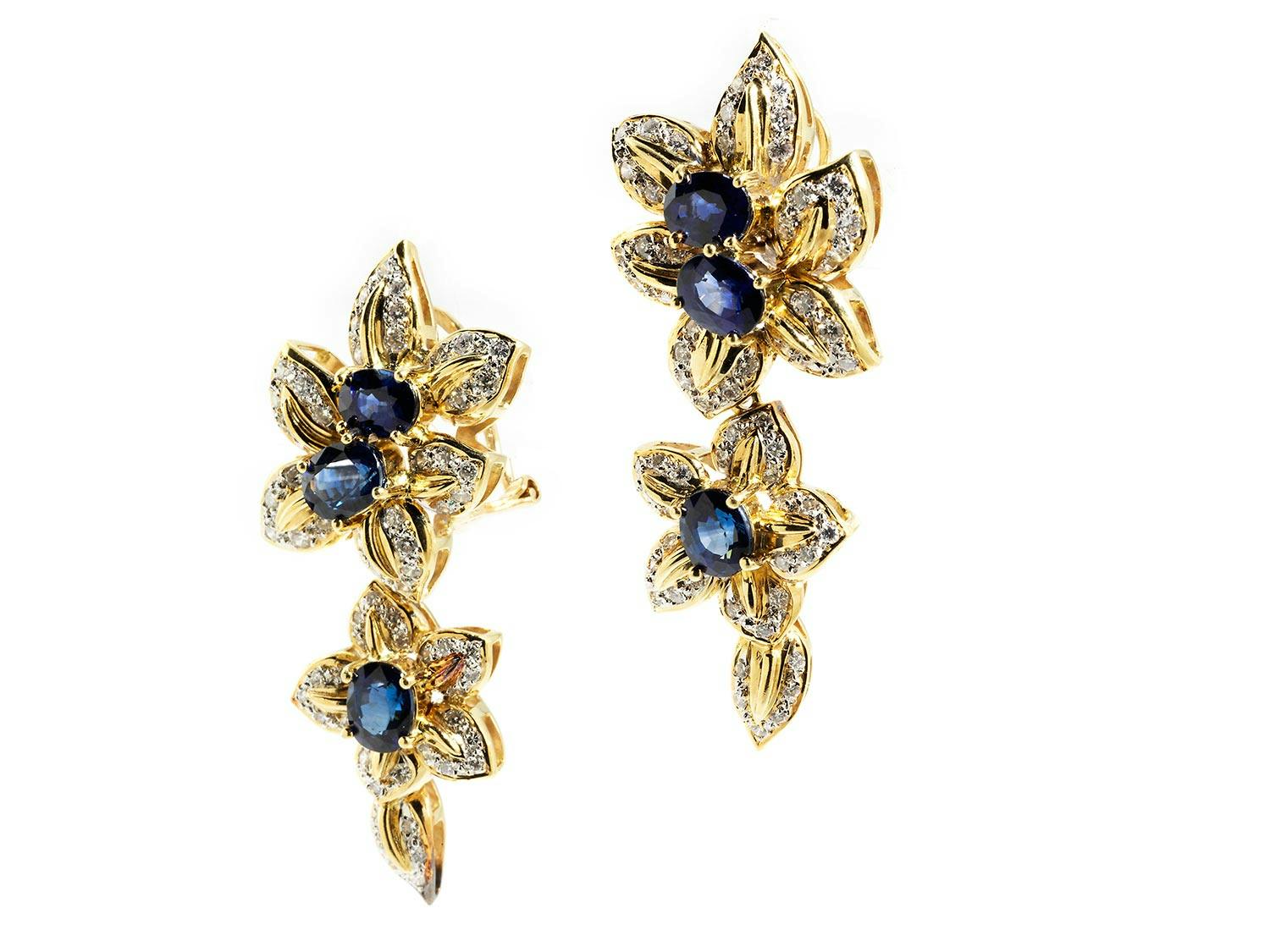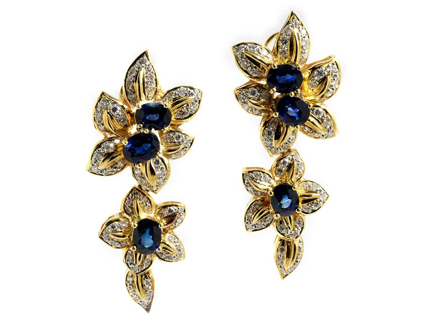 Aparte, florale beweglich montierte Ohrhänger, besetzt mit sechs oval facettierten leuchtend blauen Saphiren, zus. ca. 3,6 ct, und kleinen Brillanten, zus. ca. 1,5 ct H-I/VS-SI. Clipbrisur mit Stift.(14101028) (16)