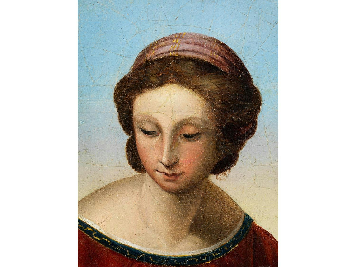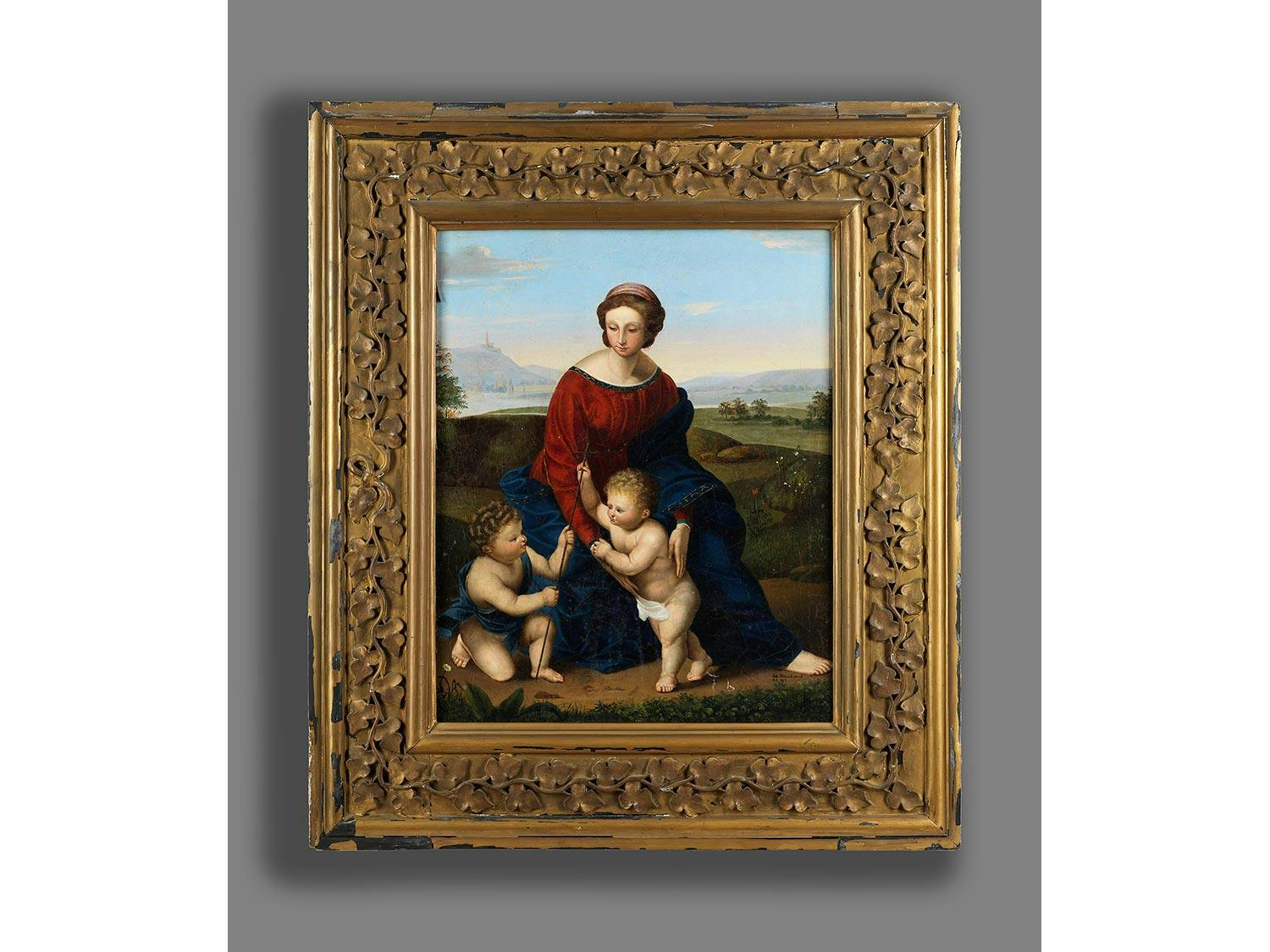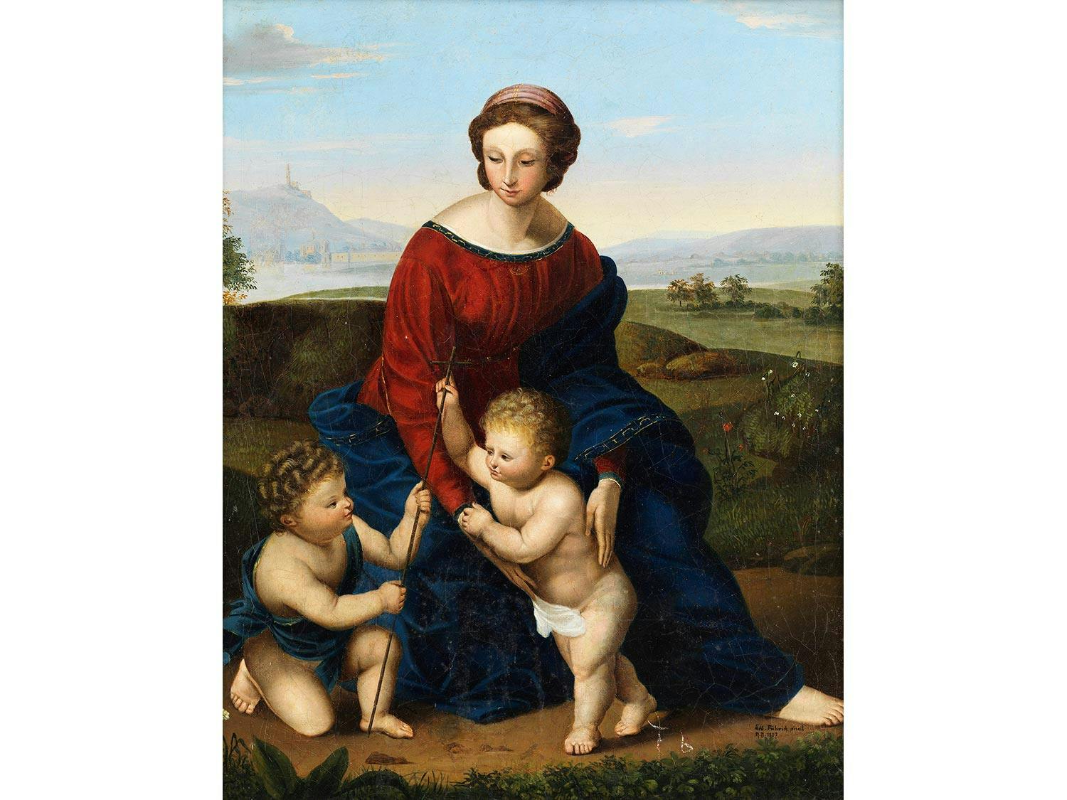In weiter Ideallandschaft mit Gebirgszug, Fluss und einer Stadt am Ufer vor gelblich-blauem Himmel, auf einem kleinen Grashügel sitzend die Madonna in rotem Gewand mit blauem Mantelüberwurf. Mit ihren Händen hält sie den stehenden Jesusknaben fest, der sich nach links dem halb knienden Johannes dem Täufer mit einem langen Kreuzstab in seinen Händen zuwendet. Stimmungsvolle qualitätvolle Wiedergabe mit feiner Linienführung. Das Gemälde orientiert sich an Vorbildern u.a. von Raphael.
