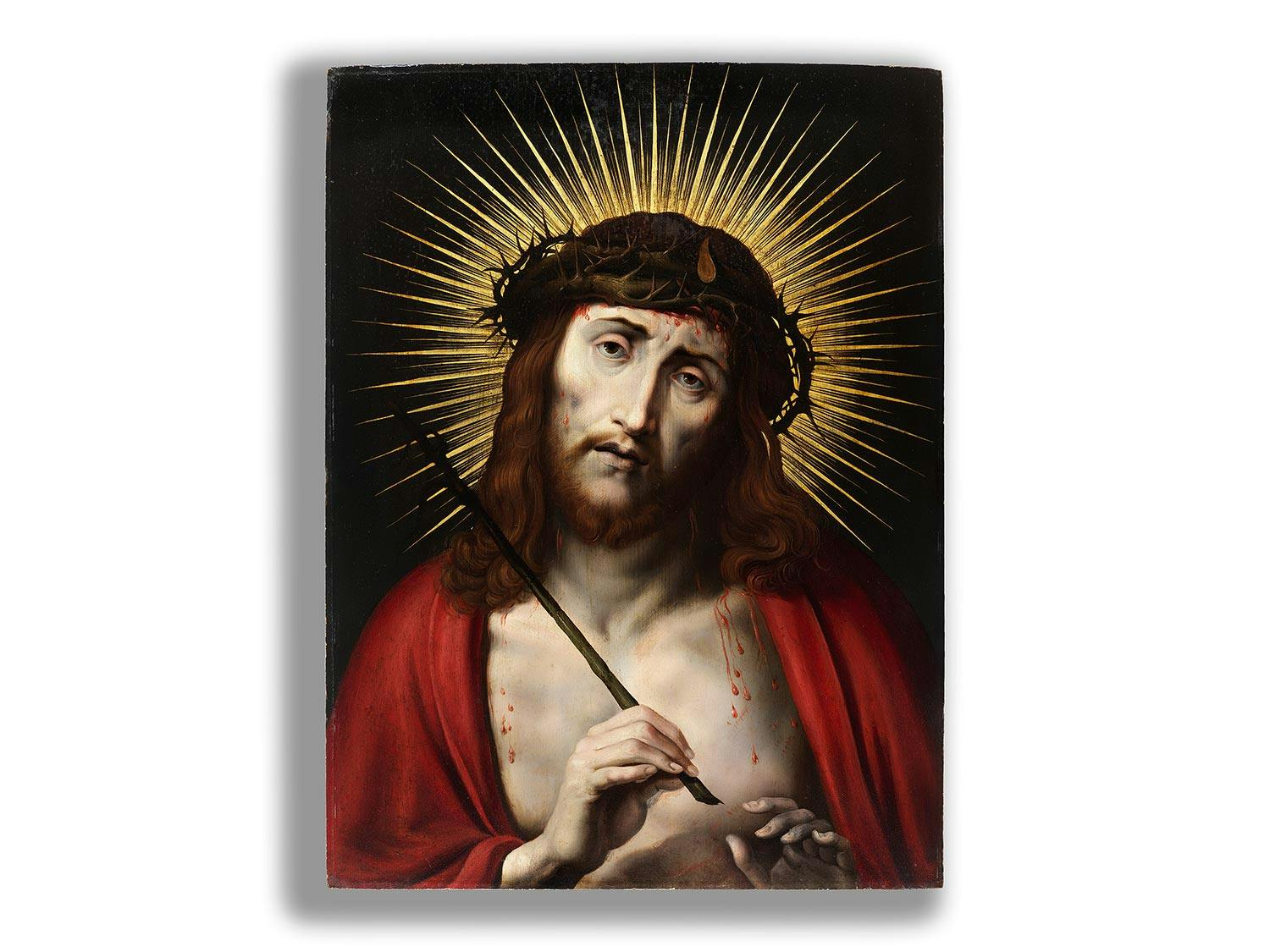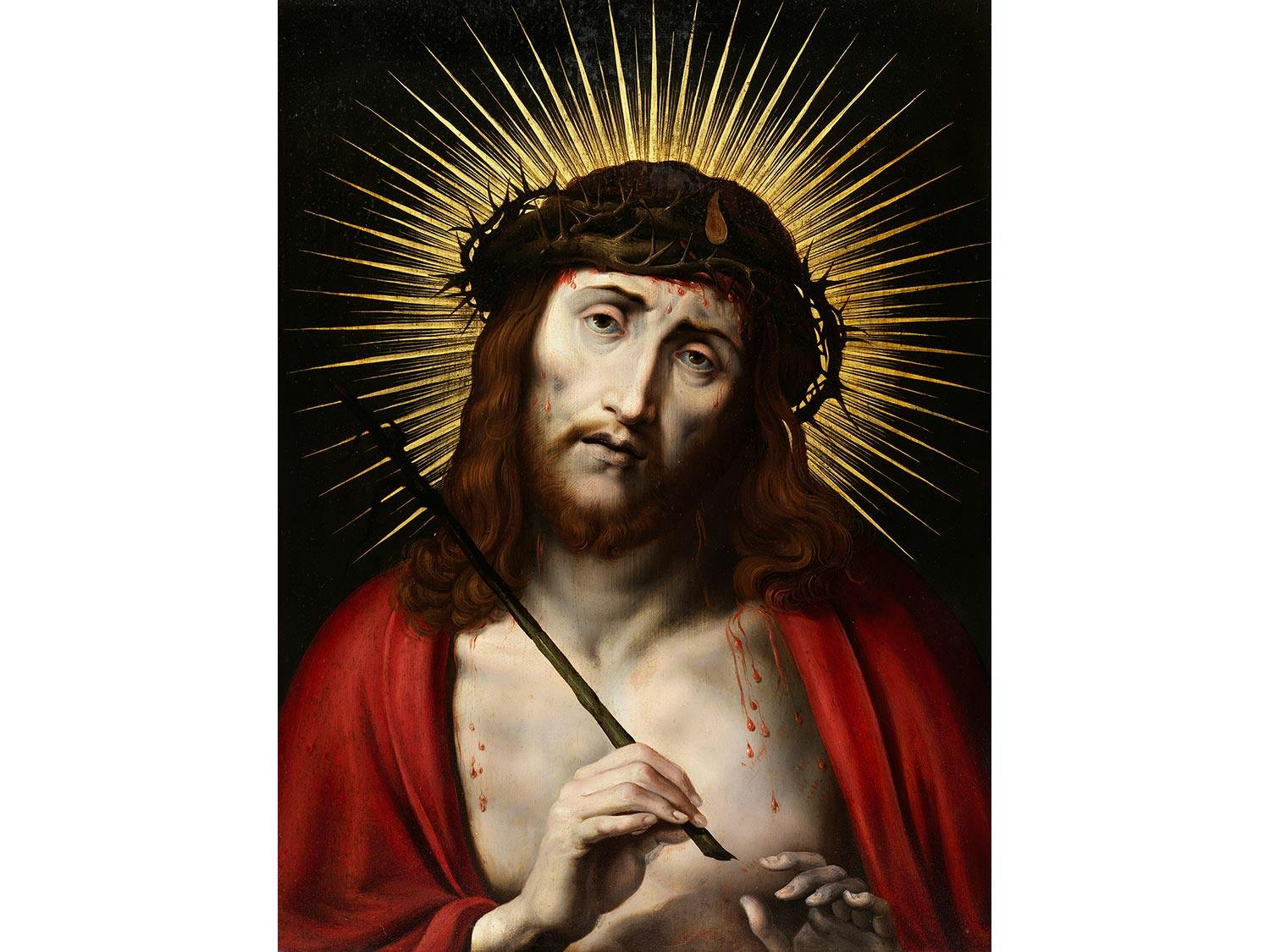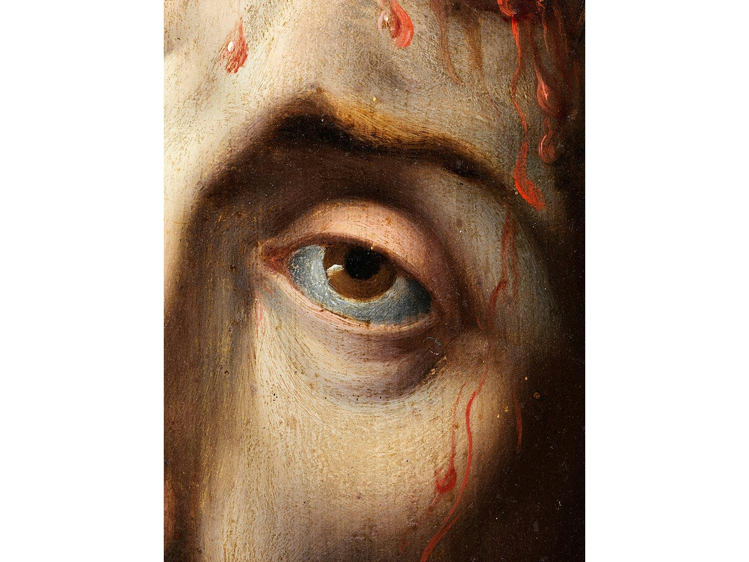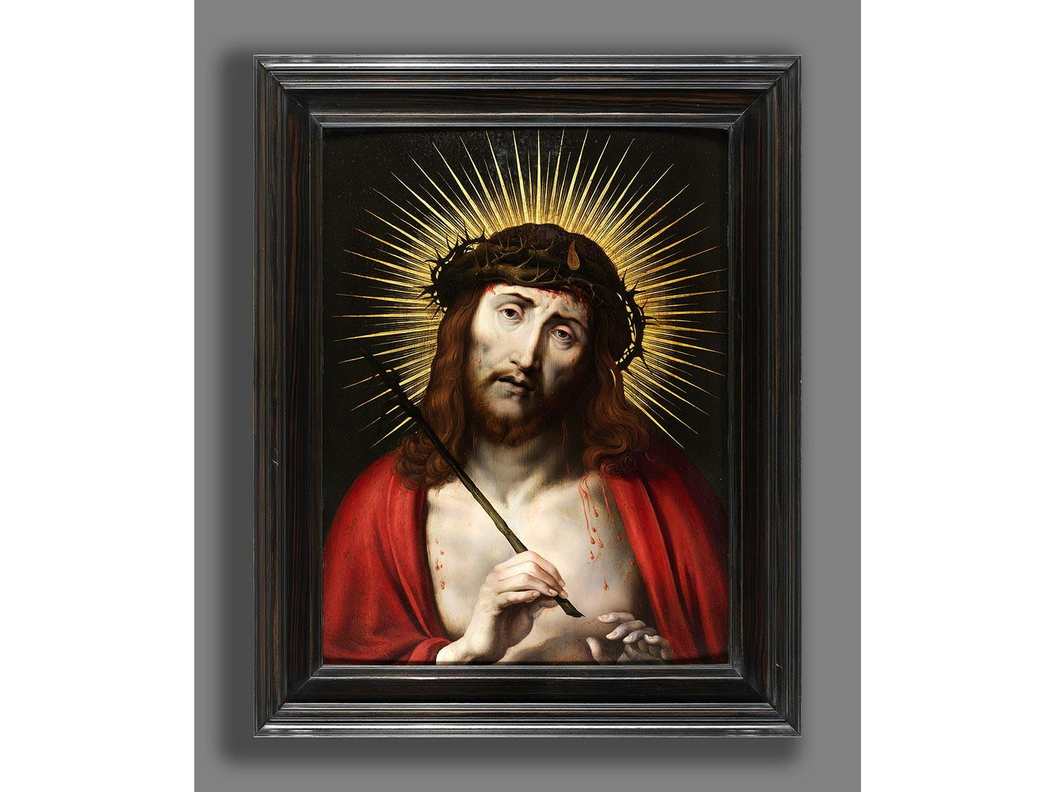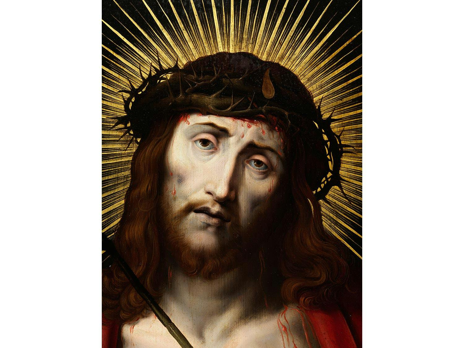Andachtsbild mit Darstellung Christi mit Dornenkrone, im roten Spottmantel und -zepter. Das Haupt radial hinterfangen von Strahlen in Vergoldung.