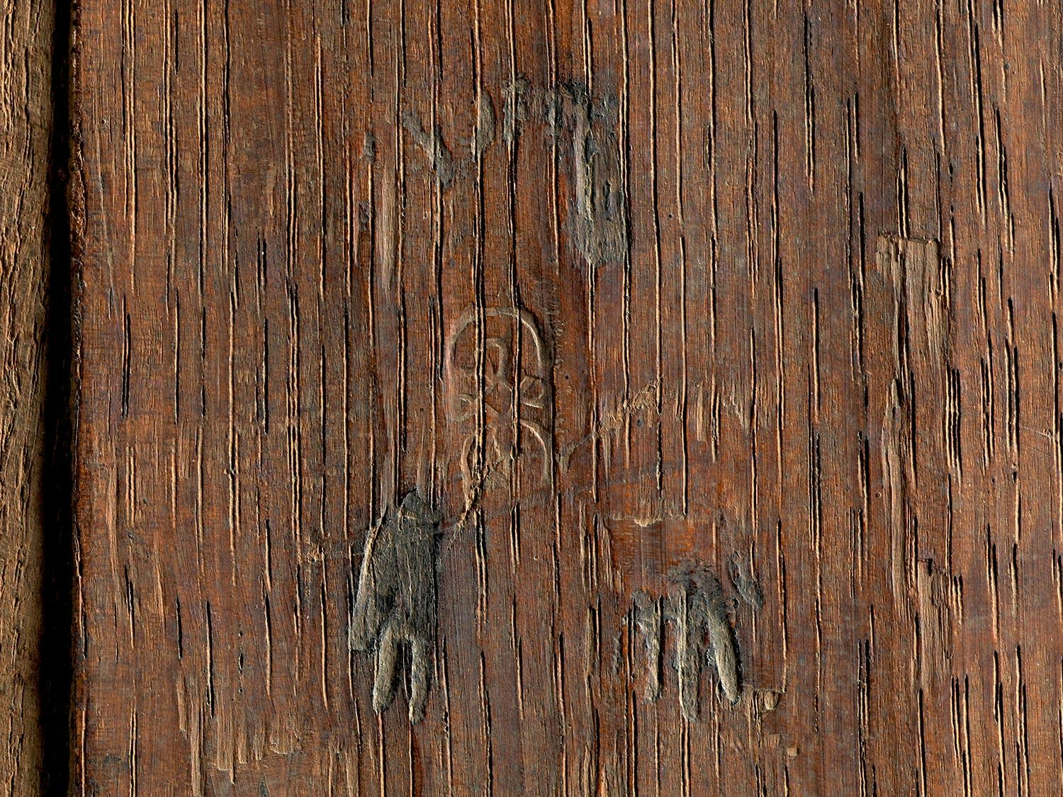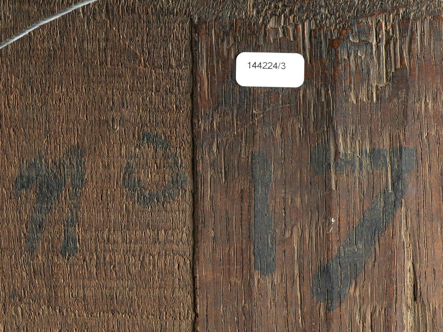 Platte verso mit der Prägemarke der Antwerpener Hand sowie von Guiliam Gabron. Ferner alte Inventarnummer in Schwarz „No 17“.