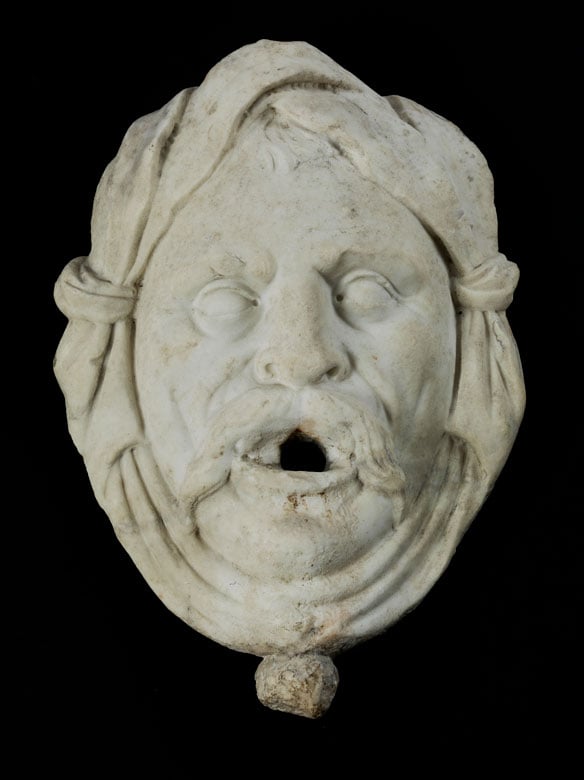 Männlicher Kopf im Hochrelief mit Lippenbart und geöffnetem Mund. Das Gesicht gerahmt von seitlich geknotetem Tuch, am Unterrand ein kugelförmiger Knoten. Qualitätvolle Bildhauerarbeit. (1160306) (11)