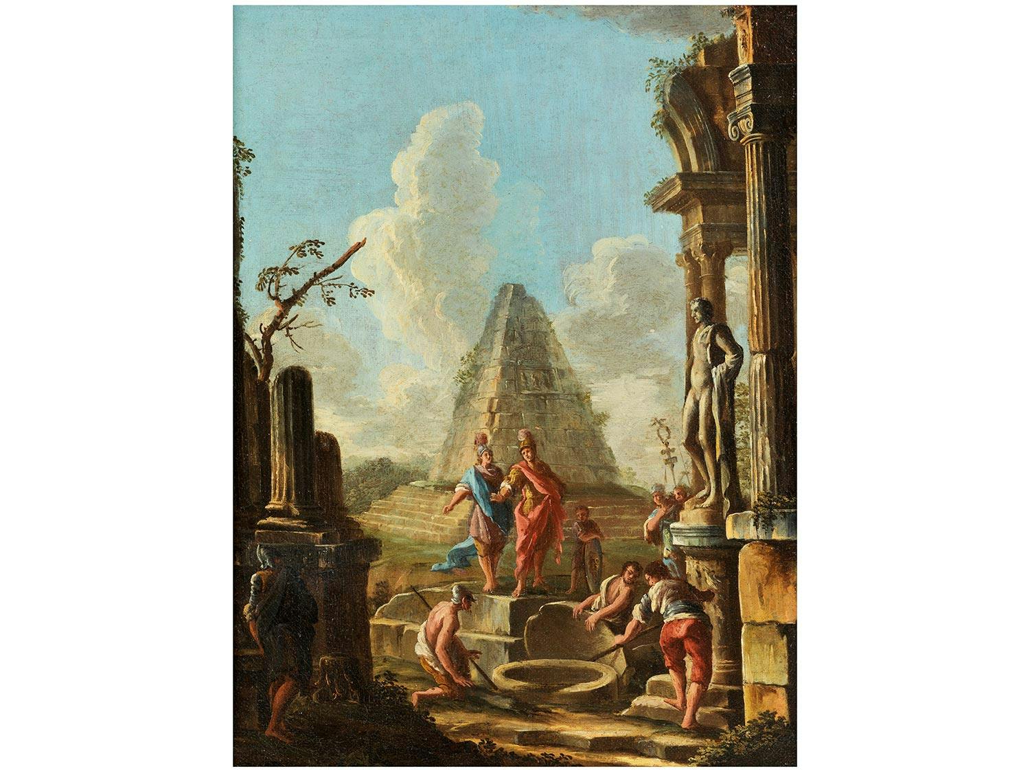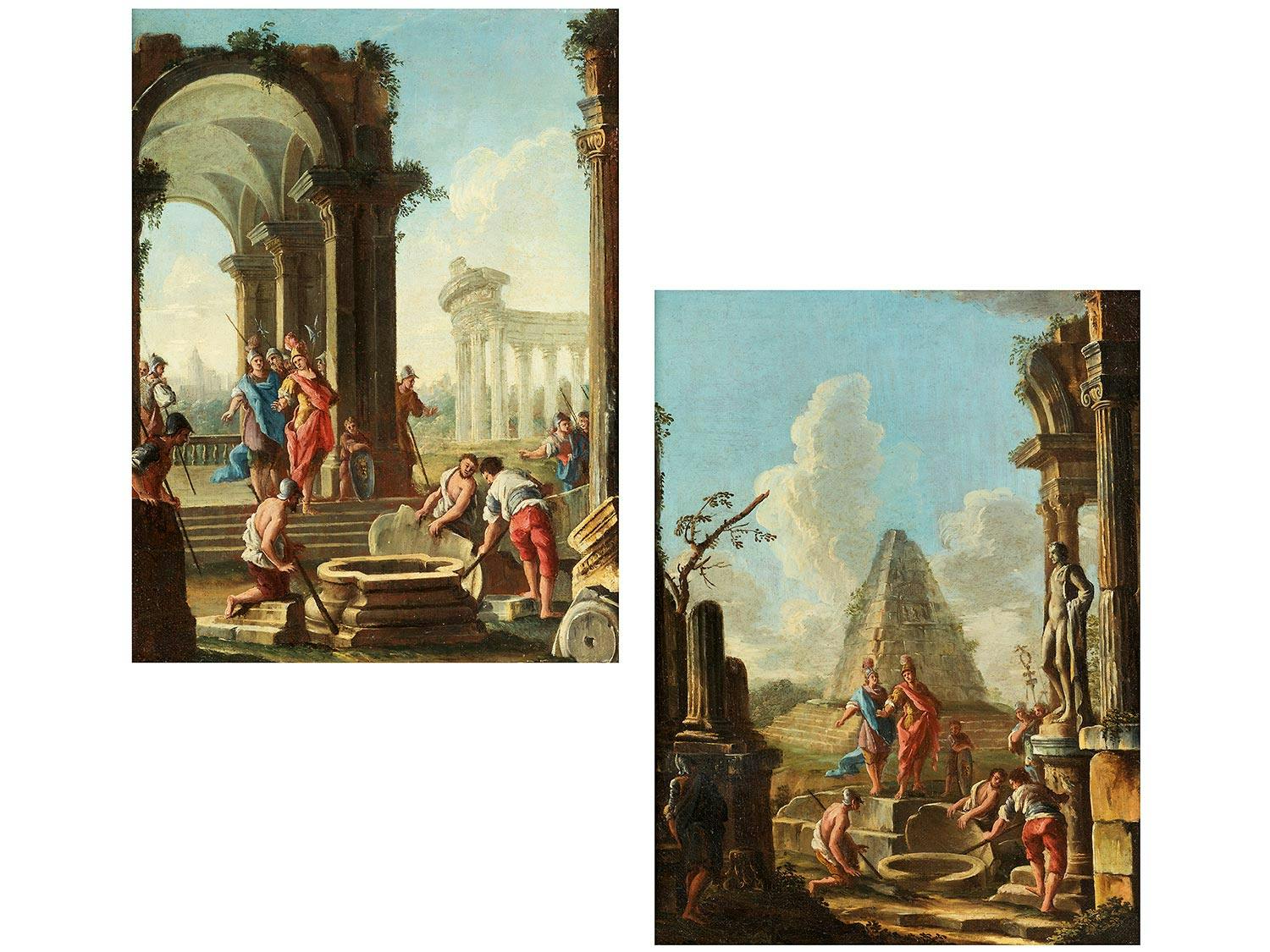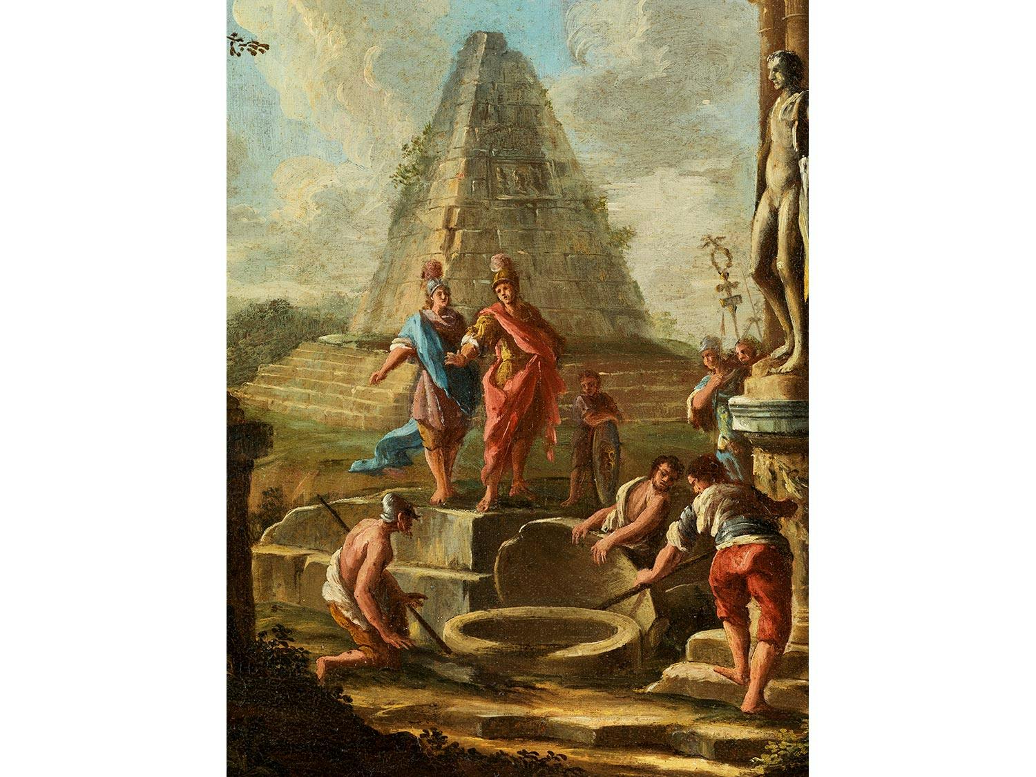 Vor hellblauem Himmel führen einige Stufen hinauf zu einer antiken, bewachsenen Loggia mit Rundbögen, unter der mehrere Soldaten mit Helm und Lanze stehen, die aufmerksam drei Männer bei der Arbeit an einer antiken Basis beobachten. Nach rechts wird der Blick auf die Ruine eines Rundtempels mit weißen Säulen gelenkt. Auch das andere Gemälde zeigt in Haltung und Kleidung fast identisch, zwei römische Soldaten bei der Aufsicht dreier Männer bei der Arbeit. In der Mitte des Hintergrundes steht jedoch ein pyramidenartiges Grab- oder Denkmal. Als Repoussoir sind am rechten Rand antike Überreste mit zwei Säulen und eine Standskulptur auf einem Sockel zu sehen, dahinter einige Figuren, einer die Standarte von Rom tragend, sowie am linken Rand weitere im Schatten stehende Säulenreste. Für den Künstler typische antike Architekturdarstellungen mit gekonnter Licht- und Schatteninszenierung. (1451193) (3) (18)