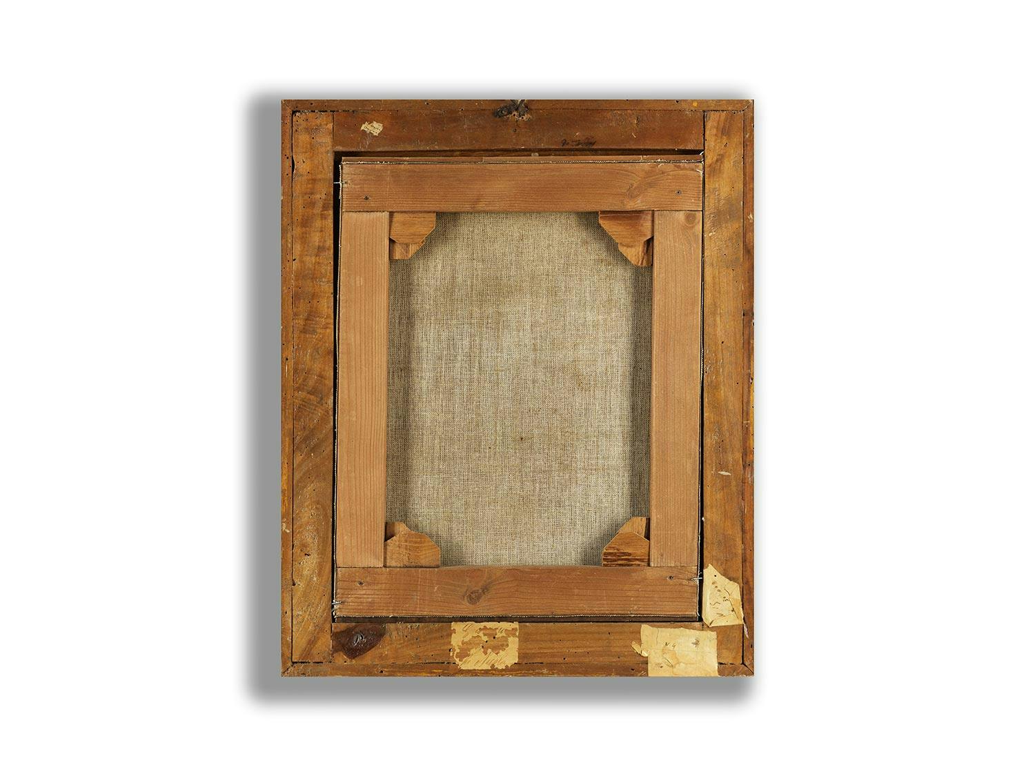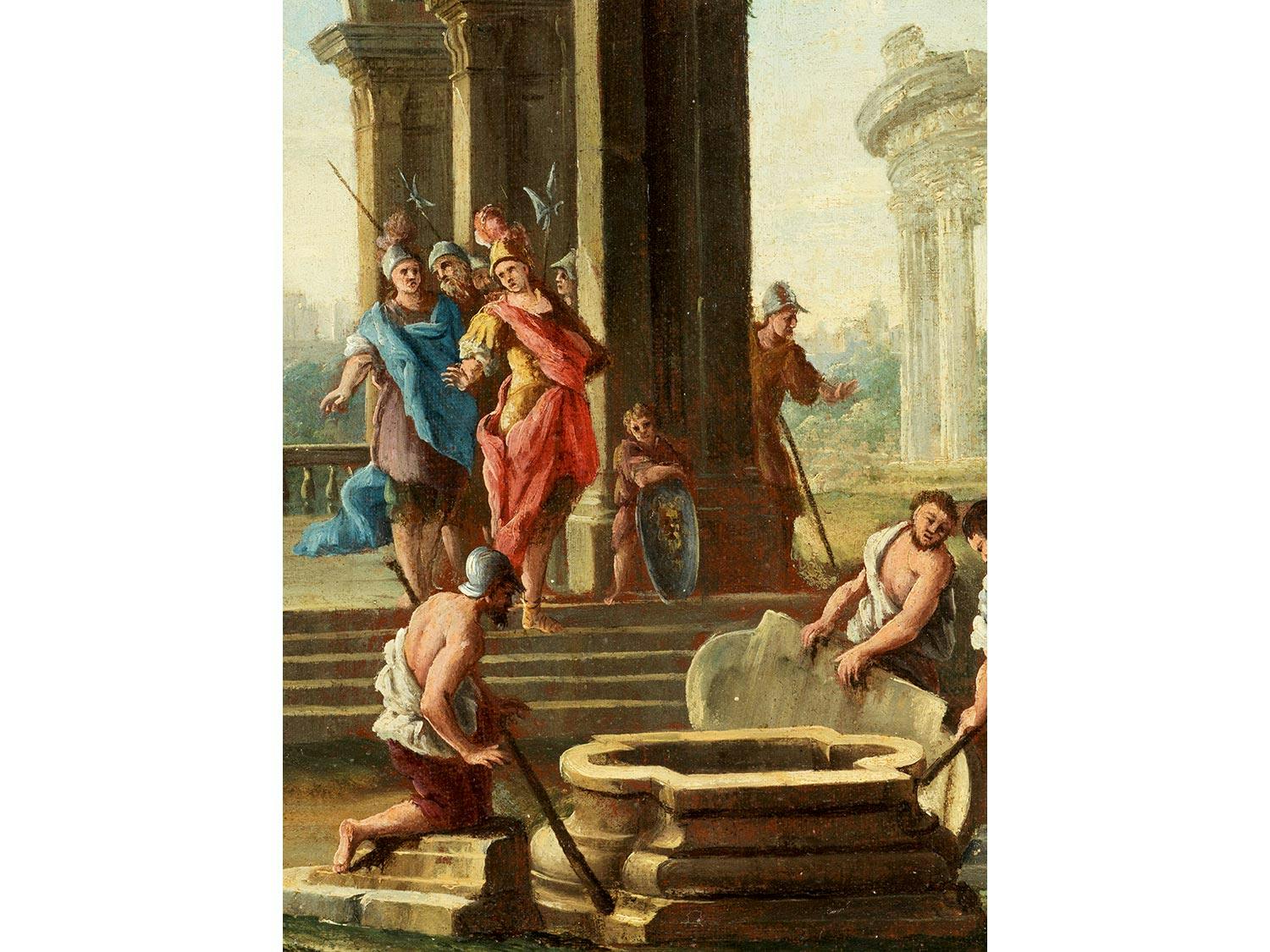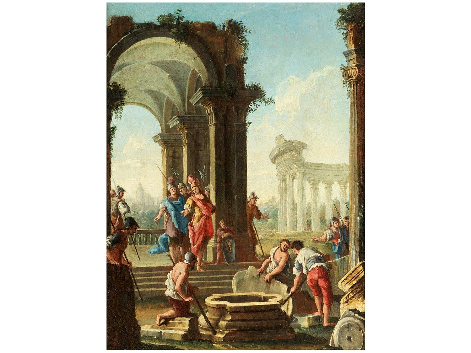 Vor hellblauem Himmel führen einige Stufen hinauf zu einer antiken, bewachsenen Loggia mit Rundbögen, unter der mehrere Soldaten mit Helm und Lanze stehen, die aufmerksam drei Männer bei der Arbeit an einer antiken Basis beobachten. Nach rechts wird der Blick auf die Ruine eines Rundtempels mit weißen Säulen gelenkt. Auch das andere Gemälde zeigt in Haltung und Kleidung fast identisch, zwei römische Soldaten bei der Aufsicht dreier Männer bei der Arbeit. In der Mitte des Hintergrundes steht jedoch ein pyramidenartiges Grab- oder Denkmal. Als Repoussoir sind am rechten Rand antike Überreste mit zwei Säulen und eine Standskulptur auf einem Sockel zu sehen, dahinter einige Figuren, einer die Standarte von Rom tragend, sowie am linken Rand weitere im Schatten stehende Säulenreste. Für den Künstler typische antike Architekturdarstellungen mit gekonnter Licht- und Schatteninszenierung. (1451193) (3) (18)