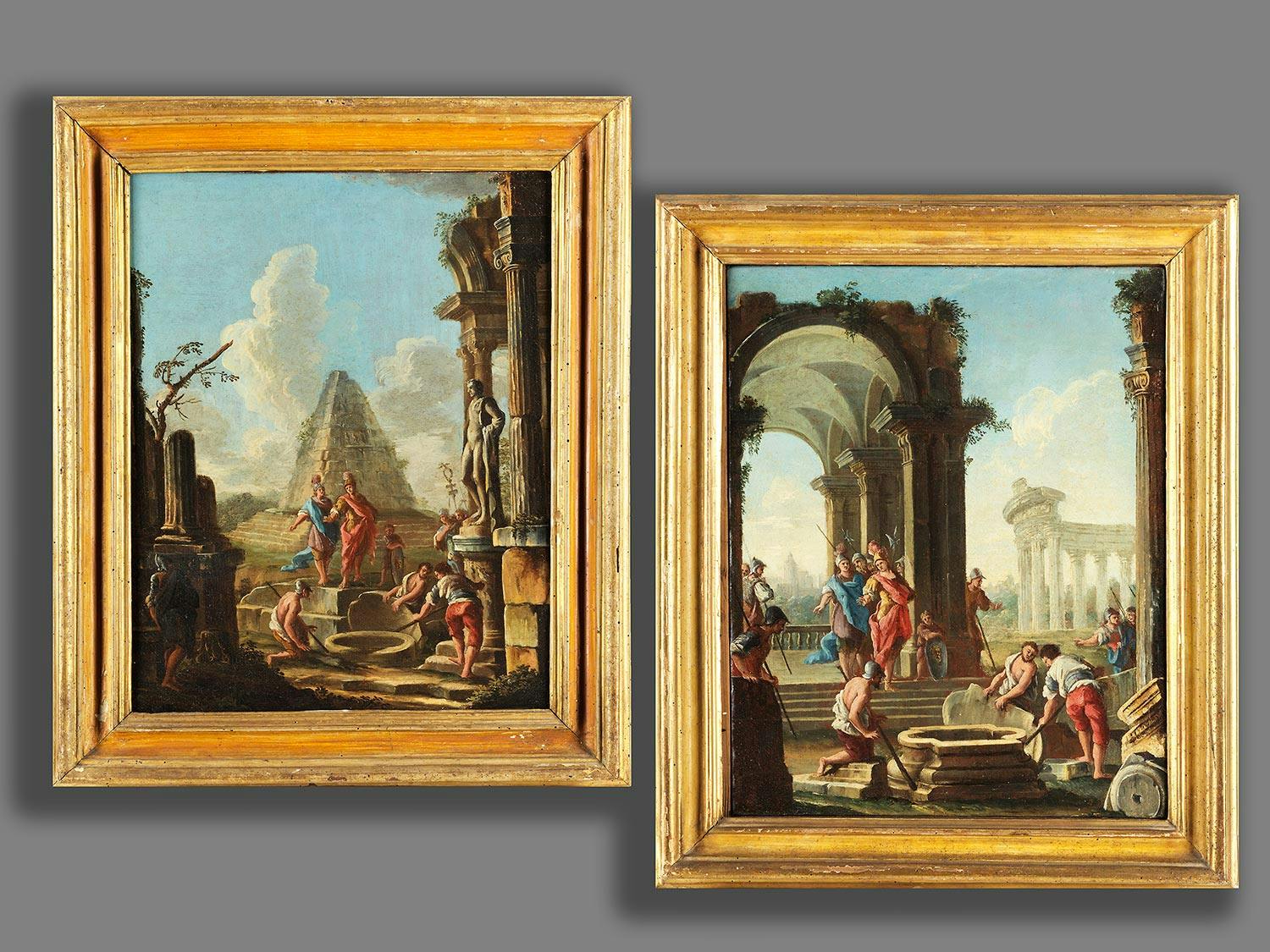 GemäldepaarRÖMISCHE ARCHITEKTURCAPRICCIOS MIT FIGURENÖl auf Leinwand. Doubliert.
