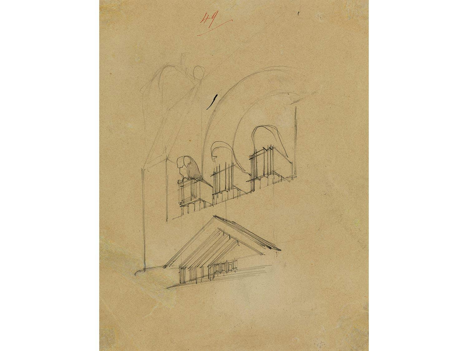 Das Blatt zeigt eine Studie für ein Gebäude. Blatt leicht gebräunt, kleine Falzspuren.Gerahmt beschrieben.