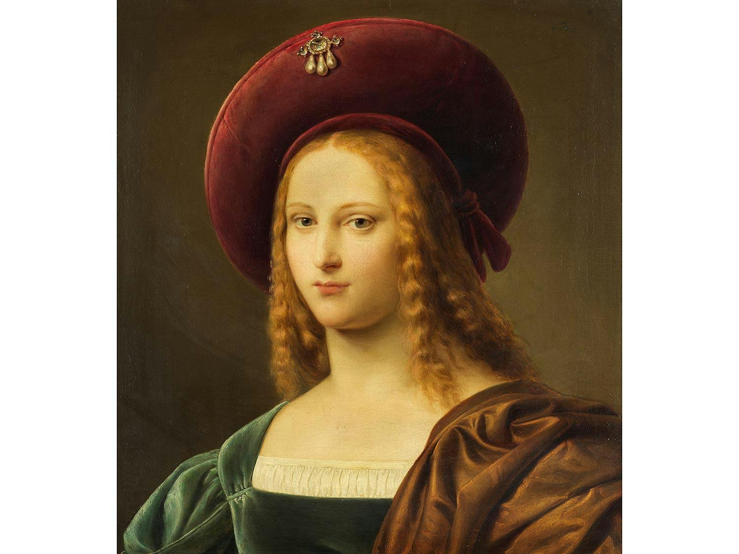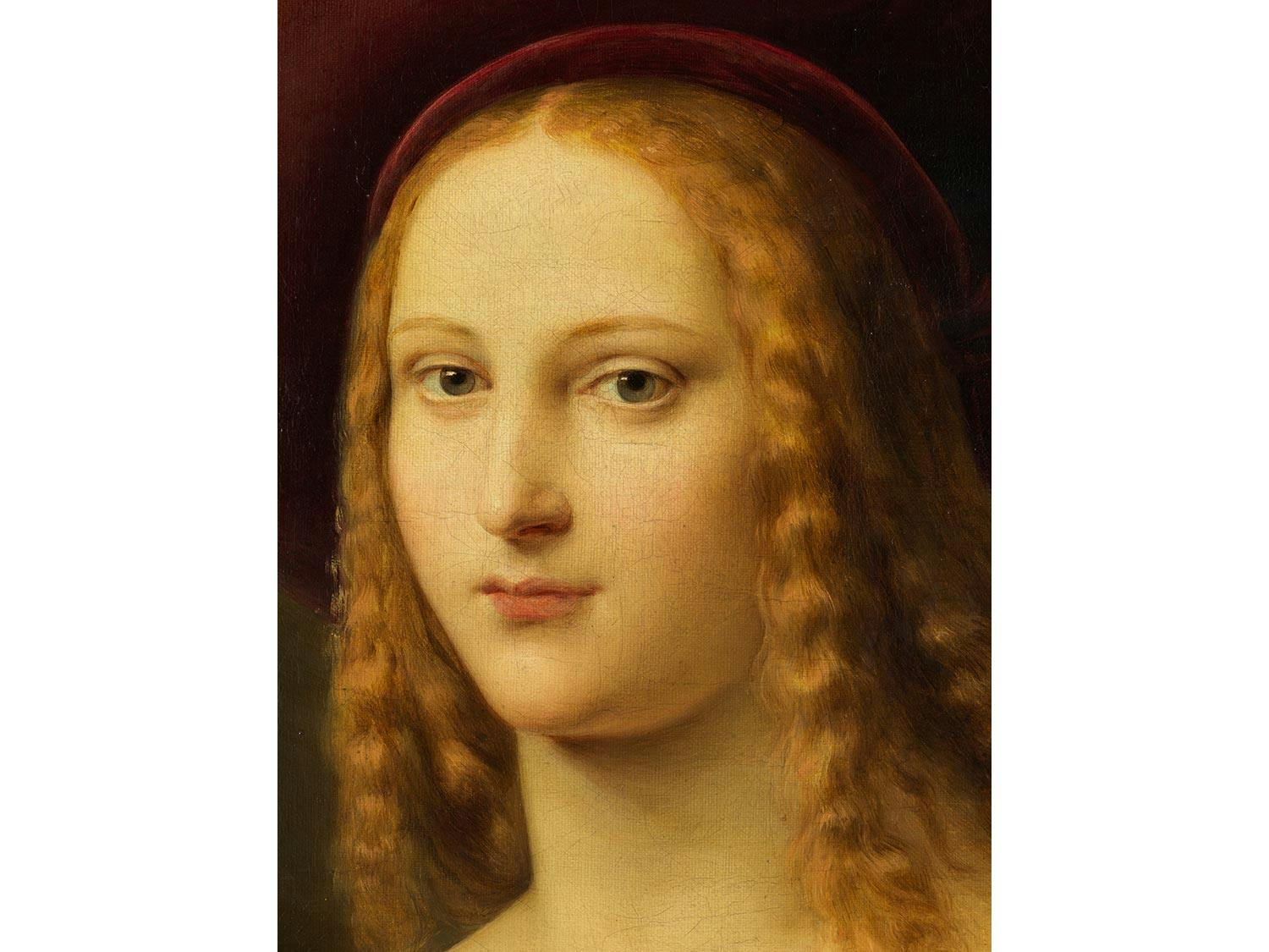 Das Brustbildnis der jungen Frau leicht nach links, in hochwertiger Samtkleidung. Sie hat ein feines zartes Gesicht und blickt mit ihren Augen aufmerksam aus dem Bild heraus. Auf ihren schulterlangen blonden Haaren trägt sie ein großes Samtbarett, das mit einer wertvollen Brosche verziert ist. Qualitätvolle Malerei, an Darstellungen der Maria Magdalena erinnernd. (14505715) (18)