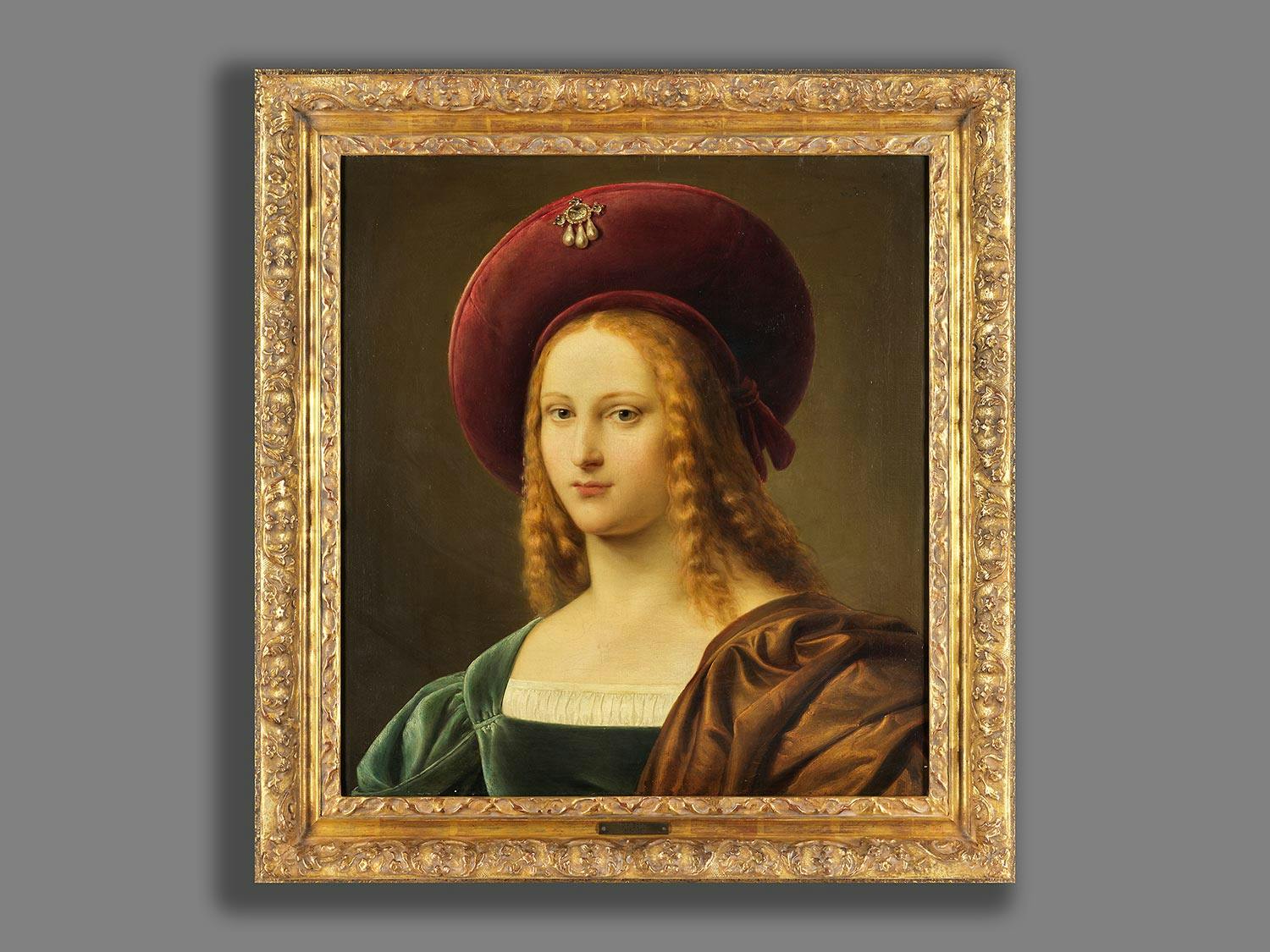 PORTRAIT EINER JUNGEN RÖMERIN MIT ROTEM SAMTBARETTÖl auf Leinwand.
