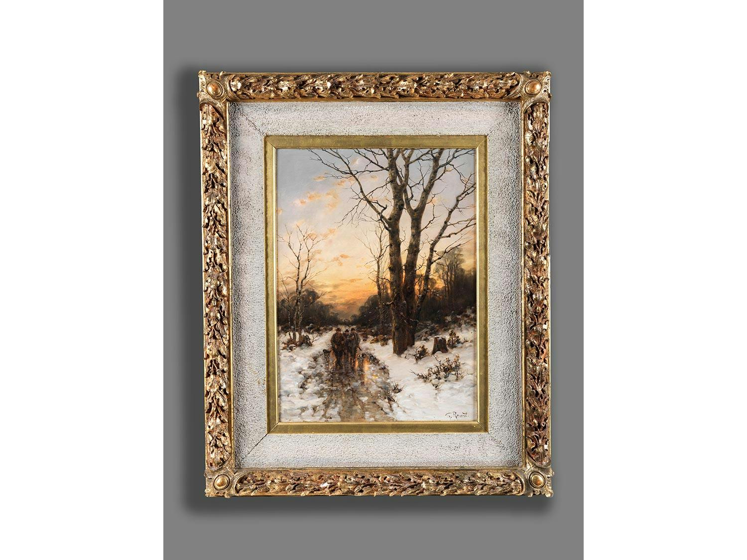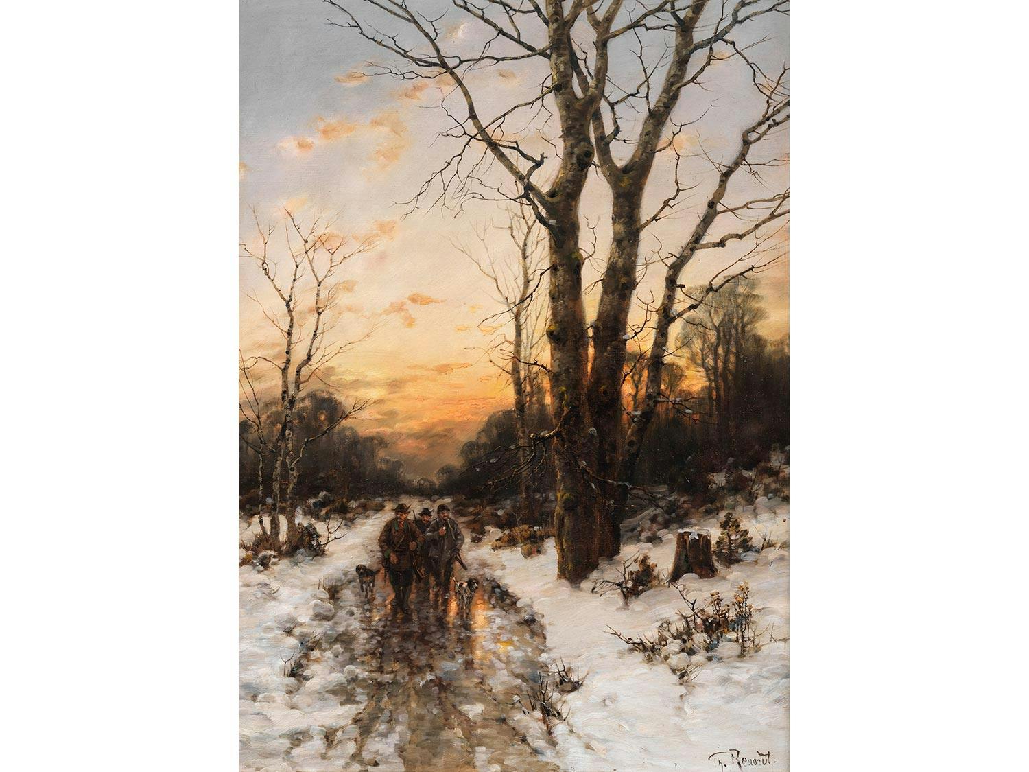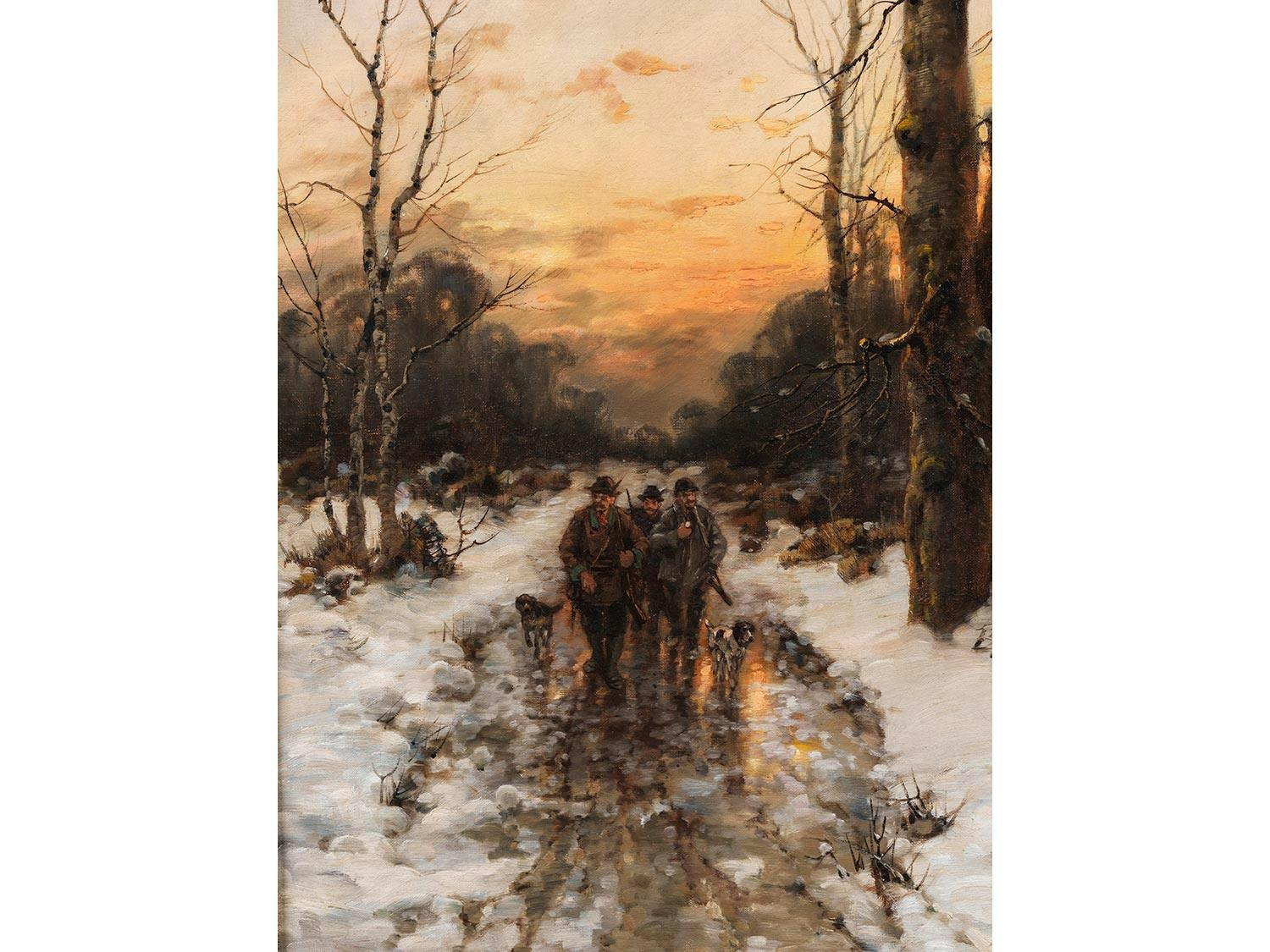 Durch eine bewaldete Landschaft führt ein verschneiter und vereister Weg vorbei an einigen kahlen Birken, deren Astwerk in den hohen Himmel reicht, im gelb-orangen Licht der untergehenden Sonne. Auf dem Weg sind gerade drei Jäger mit ihren Hunden unterwegs. Stimmungsvolle Darstellung in der typischen Manier des Künstlers. (1450156) (18)