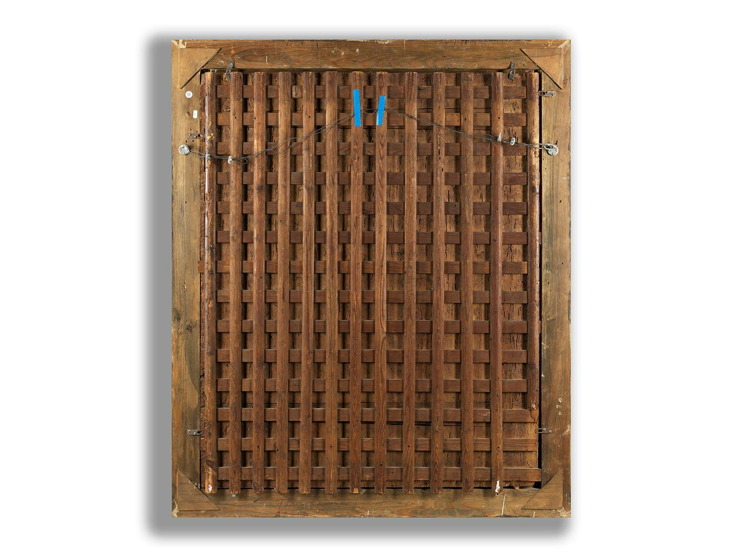 In einem Innenraum die sitzende Maria in rot-blauem Gewand, auf ihrem Knie den nackten, blond gelockten Jesusknaben haltend, der sich nach rechts dem auf einem kleinen Treppenvorsprung halb stehenden Johannesknaben zuwendet. Johannes der Täufer ist durch seine typischen Attribute gekennzeichnet: einen schmalen Kreuzesstab in seiner rechten Hand und einem Fellumhang, auf dem er steht. Alle drei Figuren zusätzlich durch einen Nimbus hervorgehoben, wobei der Nimbus Christi durch Kreuzlilien ausgezeichnet ist. Nach rechts führt eine große rechteckige Öffnung den Blick hinaus in eine hügelige Landschaft mit Fluss und zahlreichen Gebäuden, im Licht der untergehenden Sonne. Maria, mit feinem Inkarnat und dunklen, aus dem Bild blickenden Augen, zeigt eine schmerzliche Nachdenklichkeit, die sich aus dem Zusammenhang mit dem künftigen Leiden des Kindes erklären lässt. Das Jesuskind, in kindlich unbewusster Unbefangenheit, hat den Oberarm des jungen Johannes ergriffen. Der Künstler hat ein Werk geschaffen, das auch die menschlich-psychologischen Aspekte, die mit der Leidensgeschichte von Maria und Jesus in Verbindung stehen, zum Ausdruck bringt. Qualitätvolle Darstellung mit bravouröser Licht- und Schatteninszenierung.