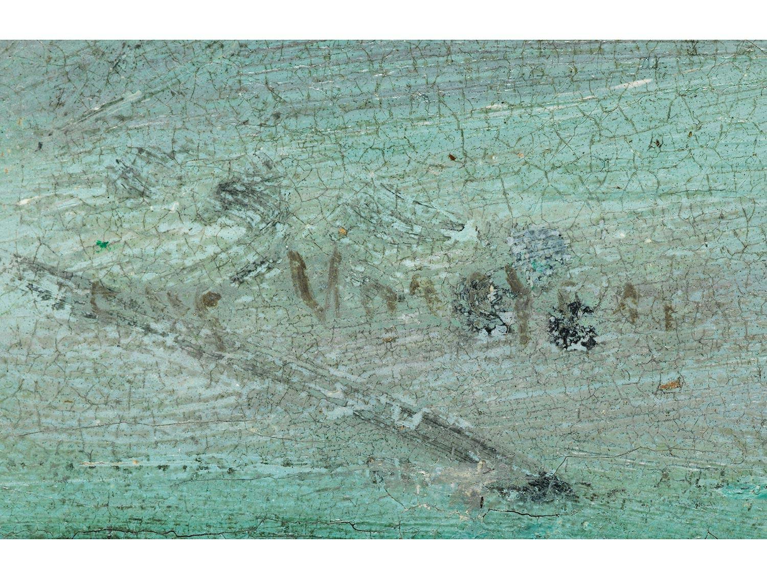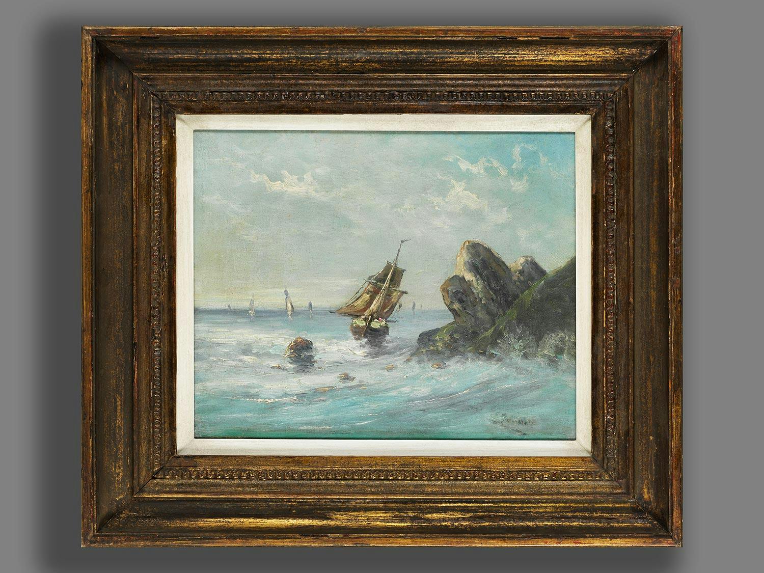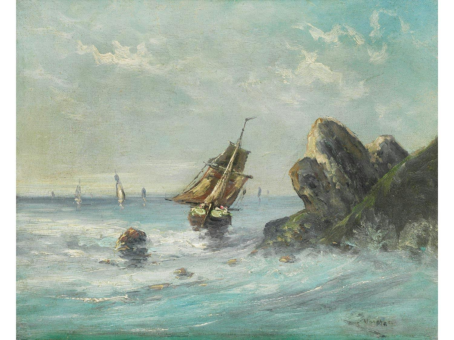 Unter hohem hellblauem Himmel das Segelschiff bei starkem Wellengang, bedrohlich nahe der felsigen Küste. Darstellung in vielen differenzierten Blautönen bei raschem Pinselduktus. (14514410) (18)