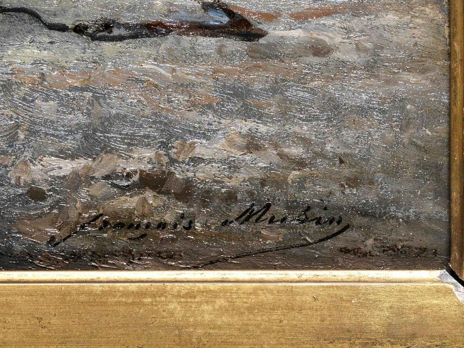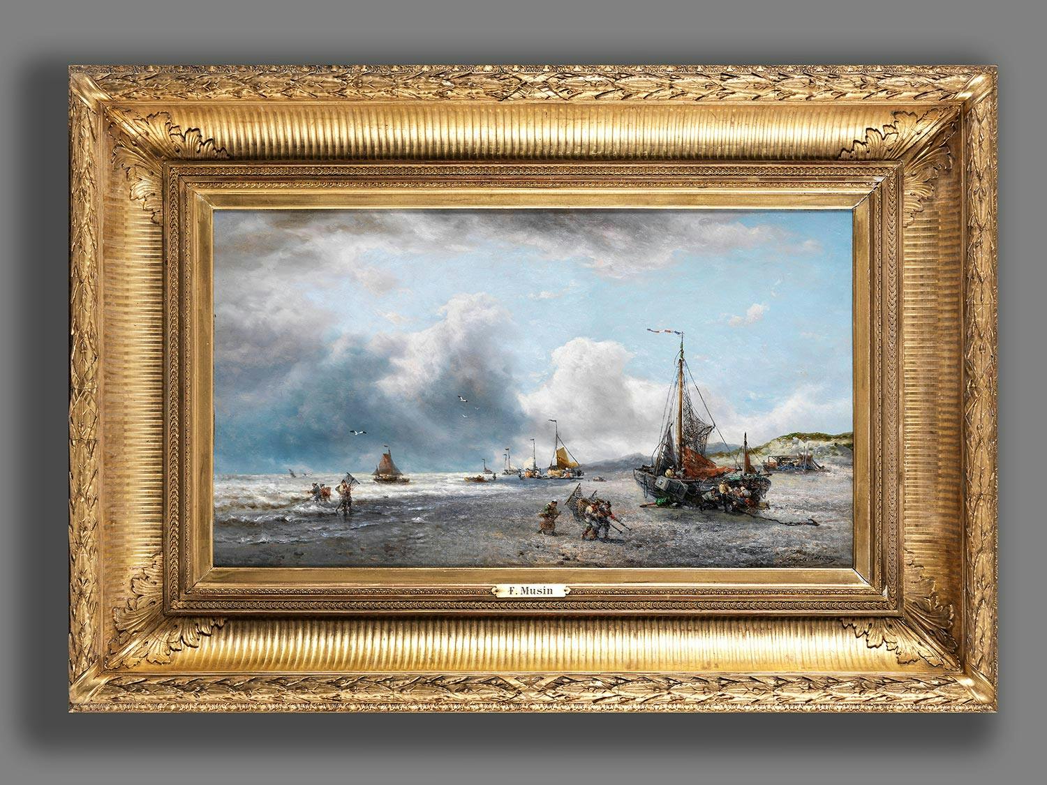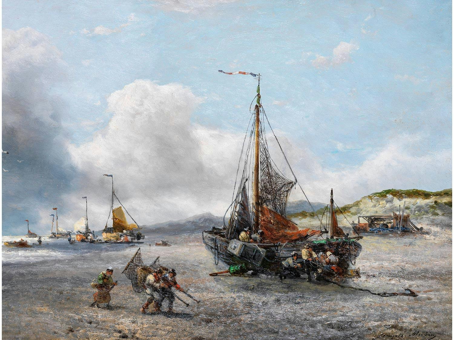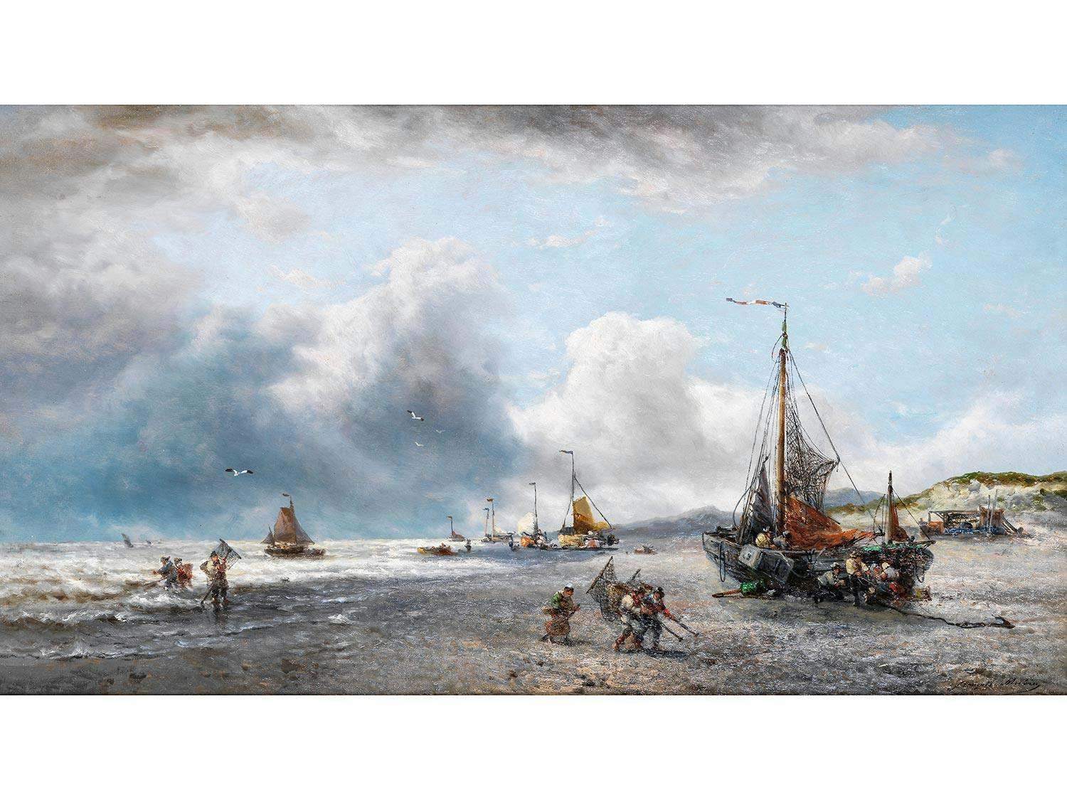 Unter hohem noch sonnigen Himmel mit von links aufziehenden Gewitterwolken mehrere Fischerboote am breiten, in die Bildtiefe führenden Strand mit Figuren bei ihrer Arbeit. Im Vordergrund kehren drei Fischer von ihrem Fang an den Strand zurück, während sich weitere mit ihren Fangnetz noch im flachen gischtigen und von der Sonne beschienenen welligen Wasser befinden. Qualitätvolle Darstellung mit feiner Lichtinszenierung. (1451341) (18)