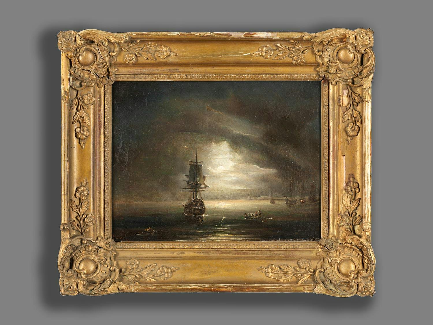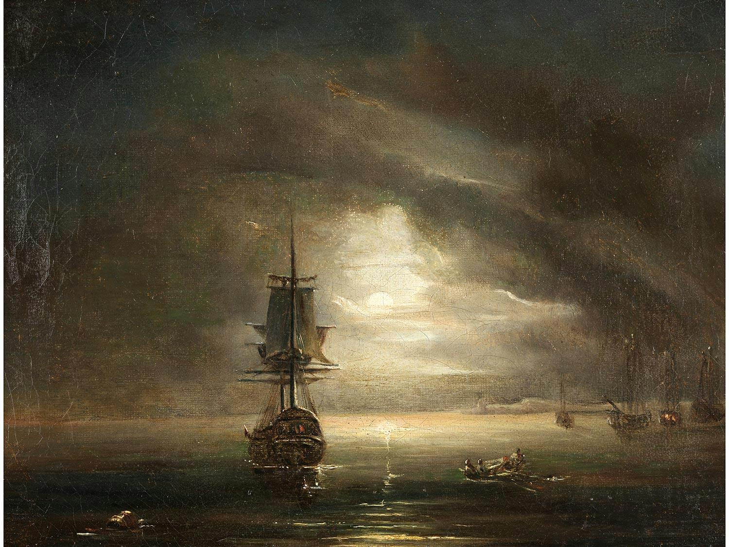 Zwischen sich von den Seiten ins Bildzentrum schiebenden Wolkenbänken bahnt sich der Schein des Vollmondes seinen Weg hin zu dem ruhigen Meeresspiegel, dessen Wellen in reizvoller Plastizität wiedergegeben sind. Links des Mondes, ein Zweimaster mit beleuchteter Kapitänskajüte, links davon ein schwimmendes Fass, rechts des Schiffes ein bemanntes Ruderboot sowie weitere Segelschiffe. (14409212) (13)