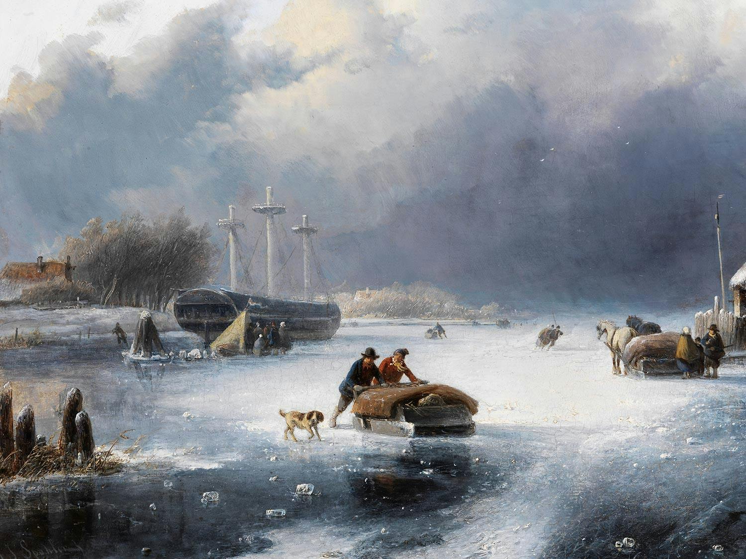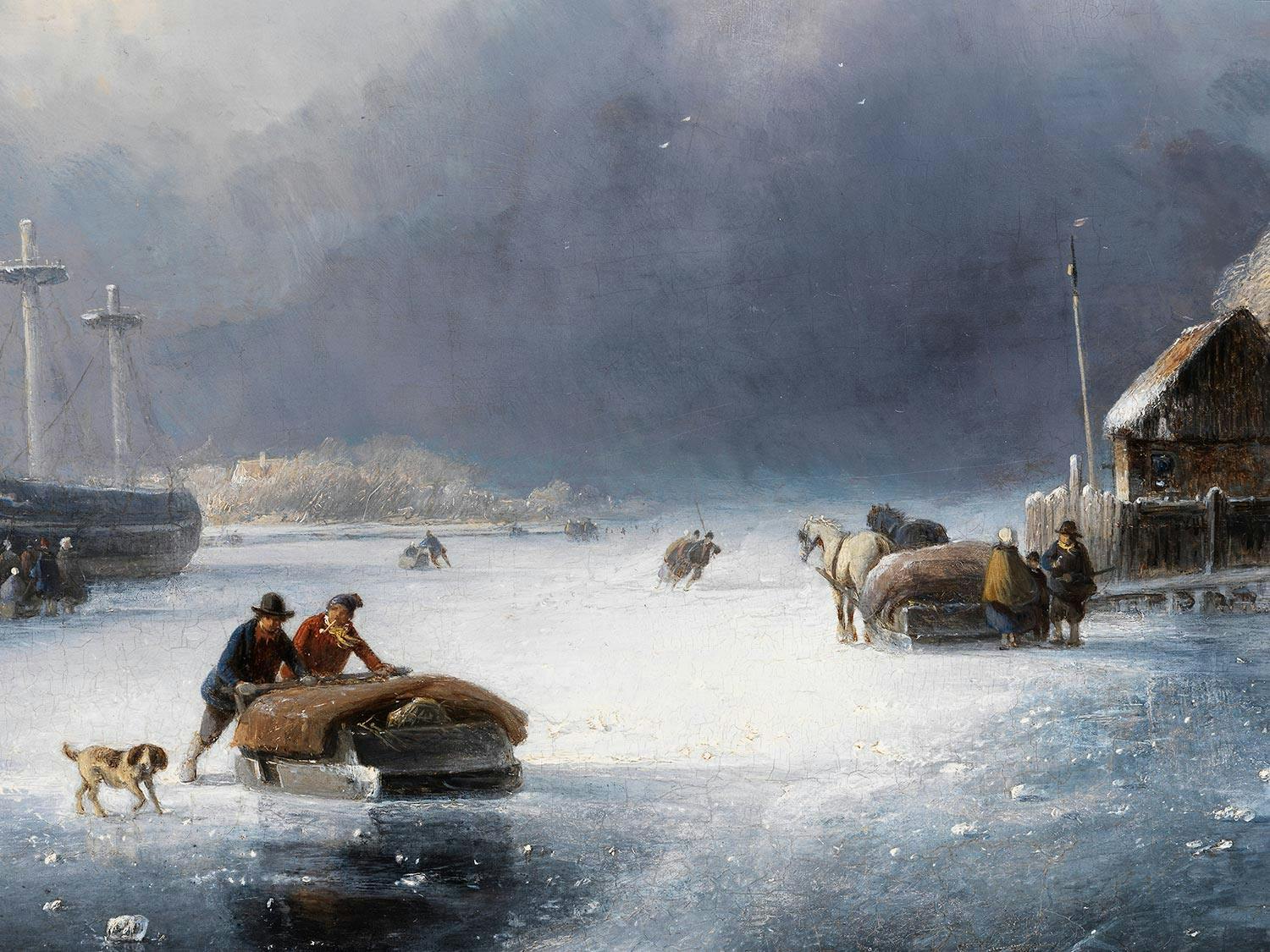 Figurenstaffage mit mehreren Gepäckschlitten, einem Schlittenfuhrwerk und Schlittschuhläufer auf dem Eis. Am Ufer ein Hausboot. Der hohe, vom Sonnenlicht aufgehellte Wolkenhimmel in kühlem Blau über einem gewittrigen Horizont vermittelt die kalte winterliche Stimmung.