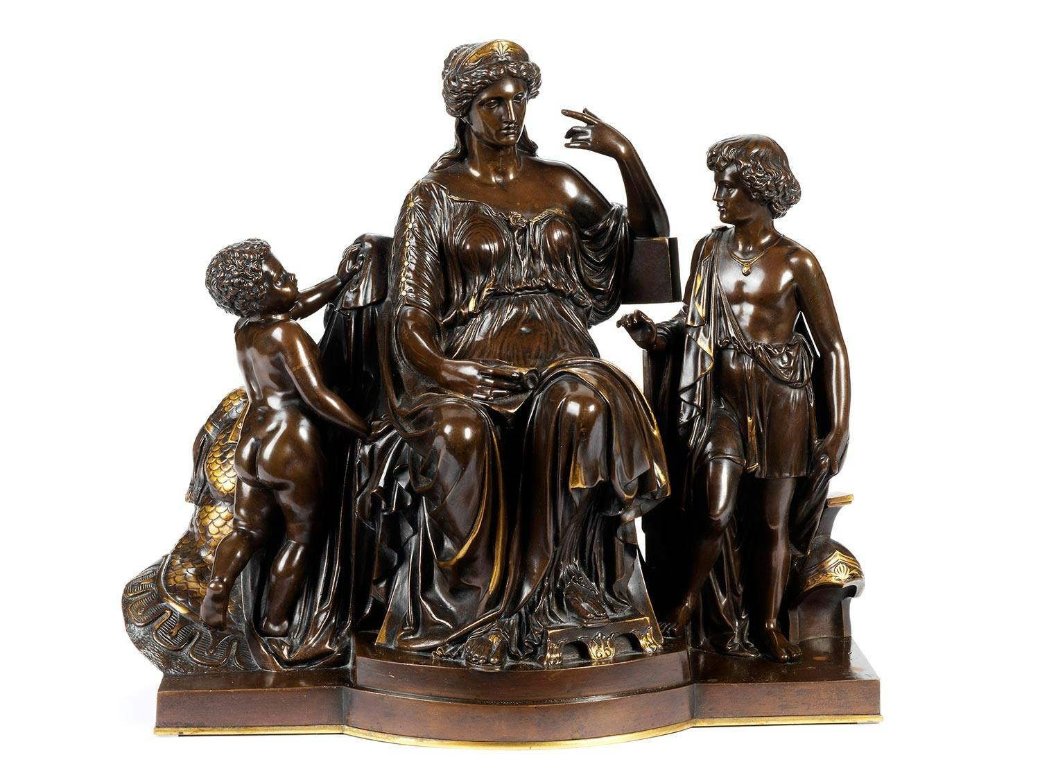 Bronze, gegossen, patiniert. Auf einer rechteckigen Basis mit zentraler Treppung sitzt Cornelia flankiert von ihren beiden Söhnen. Cornelia, geboren um 190 v. Chr. als Tochter des berühmten Feldherrn Scipio Africanus, trat vergleichsweise spät in die Ehe mit Tiberius Sempronius Gracchus ein. Trotz ihres Alters galt die Verbindung als glücklich – das Paar hatte insgesamt zwölf Kinder, von denen jedoch nur drei das Kindesalter überlebten: die Tochter Sempronia sowie die später als Reformpolitiker bekannt gewordenen Söhne Tiberius und Gaius Gracchus. Nach dem Tod ihres Ehemanns im Jahr 154 v. Chr. entschied sich Cornelia, nicht erneut zu heiraten – ungewöhnlich für ihre Zeit – und widmete sich ganz der Bildung und Erziehung ihrer Kinder. Besonders bei der geistigen Ausbildung ihrer Söhne spielte sie eine zentrale Rolle und wurde später als Idealbild der römischen Mutter stilisiert. Die politischen Karrieren ihrer Söhne endeten tragisch: beide fielen gewaltsamen Auseinandersetzungen in Rom zum Opfer. Nach diesen persönlichen Verlusten zog sich Cornelia aus dem öffentlichen Leben zurück und verbrachte ihre letzten Jahre in einer Villa in Misenum, fern vom Trubel der Stadt. (1450585) (13)