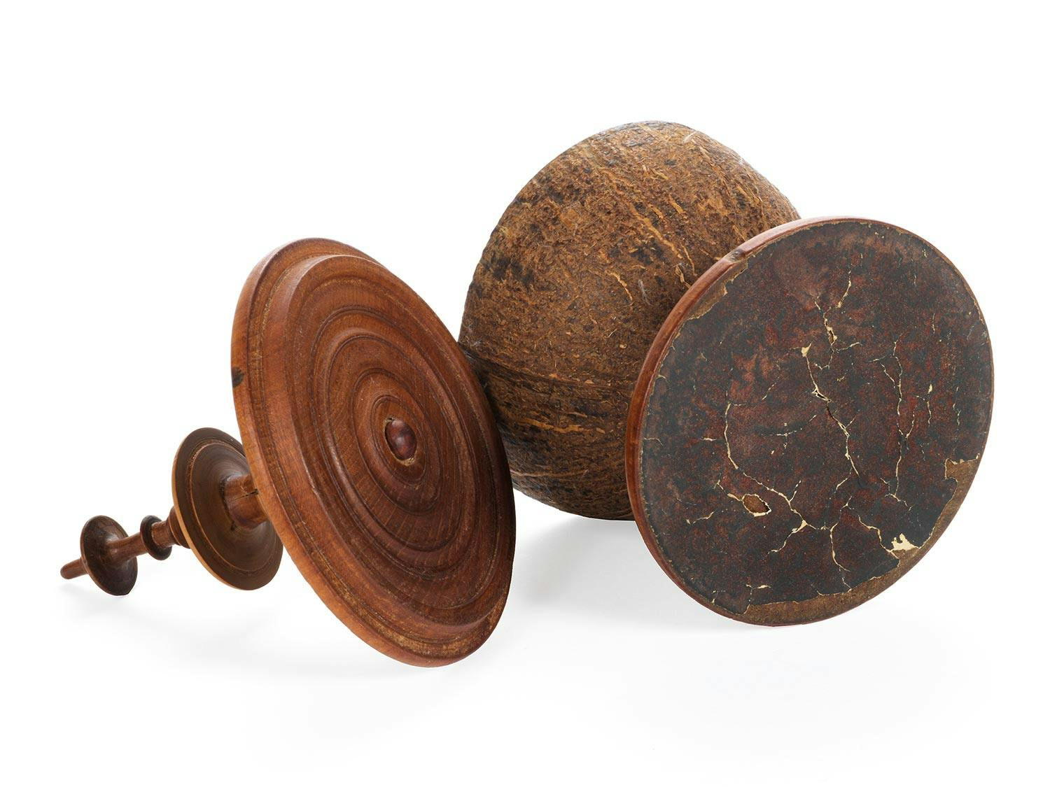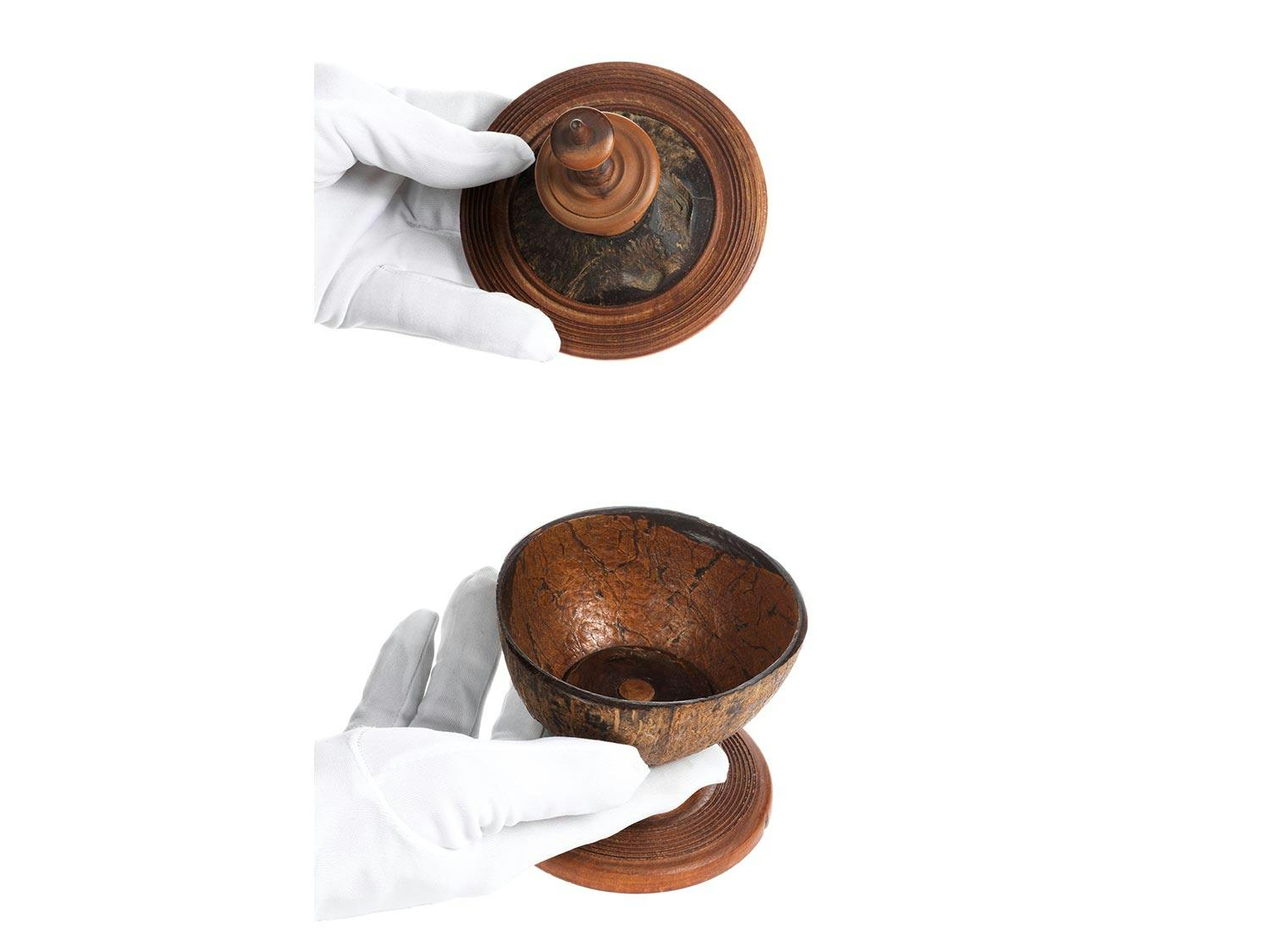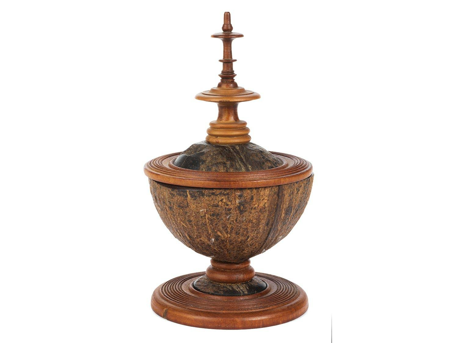 Korpus, Fuß und Deckel in Schale der Kokosnuss, gefasst in eine Montierung aus fein gerilltem, gedrechseltem Obstholz, mit einer in Polybaluster gestalteter Handhabe. Exotische Naturprodukte wie Nautilusmuscheln, Straußeneier und vor allem Kokosnüsse waren noch selten und – von Goldschmieden veredelt – Prunkstücke fürstlicher Wunderkammern, die nicht selten von den Fürsten selbst in ihren schlosseigenen Drechselwerkstätten an ausgefallenen Gerätschaften gefertigt wurden. (1440924) (13)