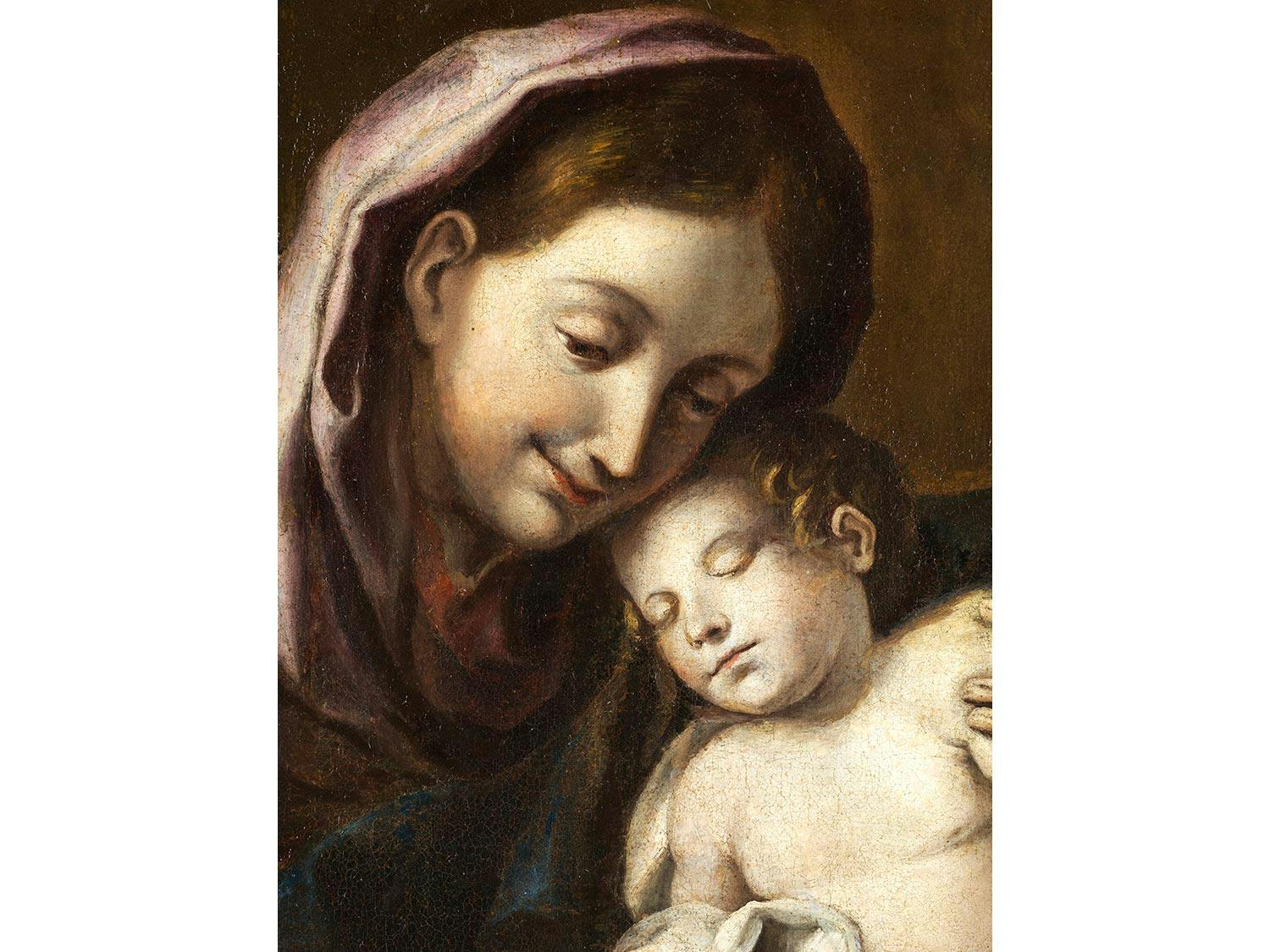 Vor braunem Hintergrund die etwas nach vorn gebeugte Madonna, die mit ihren Händen den nackten, nur leicht mit einem weißen Laken umhüllten Jesusknaben hält. Er sitzt auf einem ockergelben Kissen, hat die Augen geschlossen und seine rechte Hand ruht in der von Maria. Diese hat ihren Blick mit einem Lächeln nach unten gerichtet. Liebe einfühlsame Darstellung mit betonter Lichtführung.