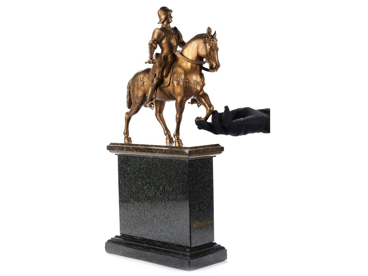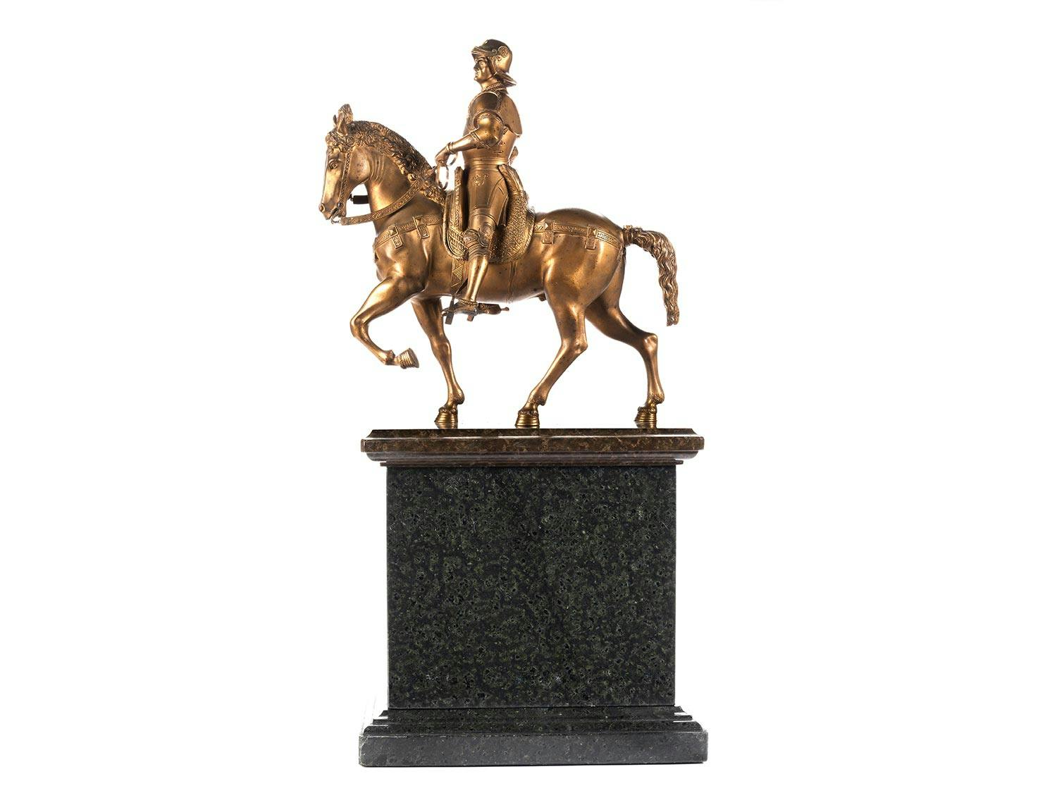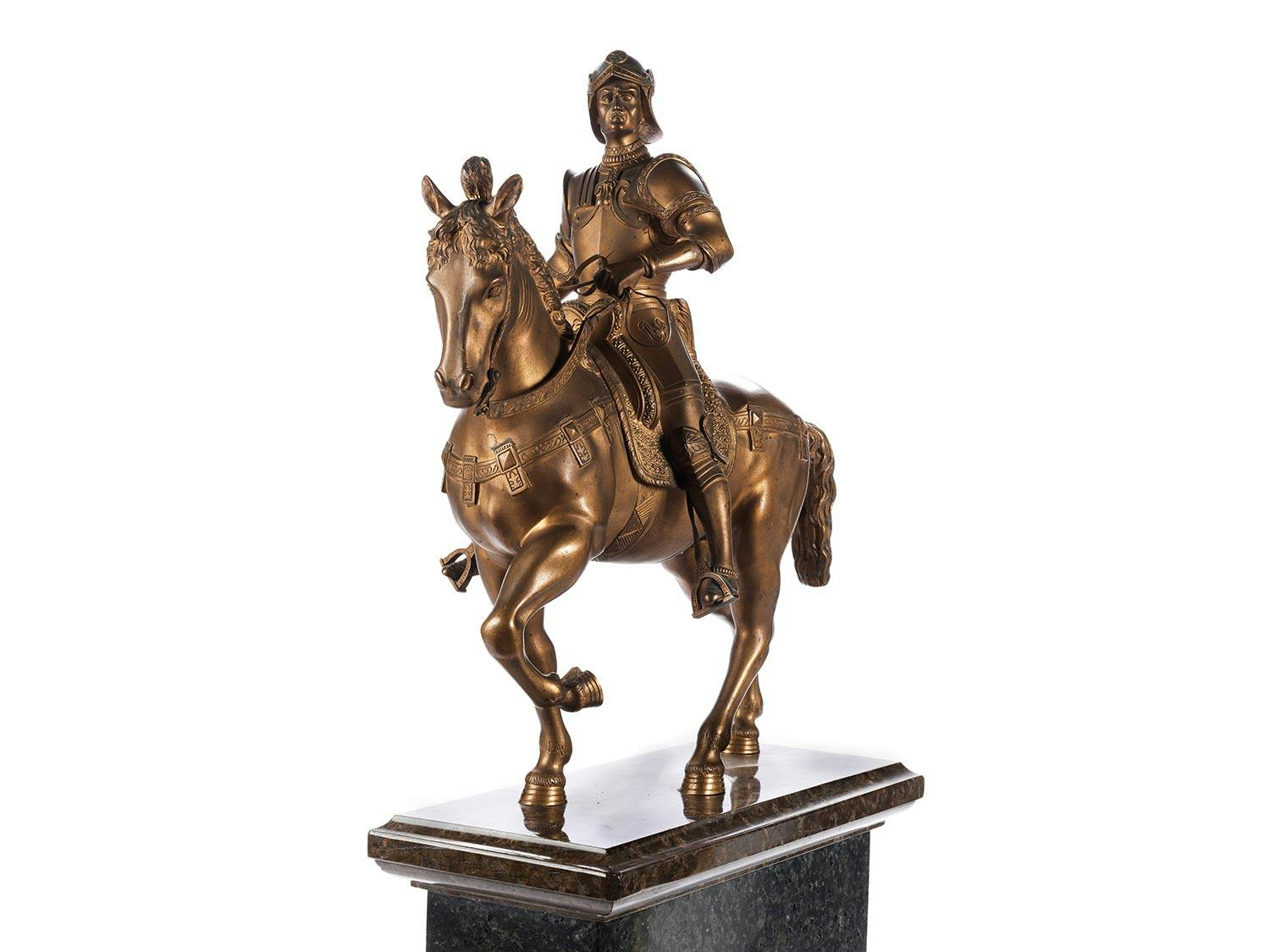 Das Reiterdenkmal, welches den Condottiere Colleoni darstellt, wurde von der Signoria in Venedig am 30. Juli 1479 an Andrea Verrocchio (1435 – 1488) in Auftrag gegeben, der Guss erfolgte durch A. Leopardi 1496, nachdem Verrocchio seinen Schüler Lorenzo di Credi mit der Vollendung des Werkes per Testament beauftragt hatte. Der Auftrag zur Fertigstellung ging jedoch nicht an Credi sondern an Alessandro Leopardi. Die Bedeutung dieser venezianischen Frührenaissance-Figur hat seither viele verkleinerte Nachbildungen hervorgebracht. (1440928) (13)