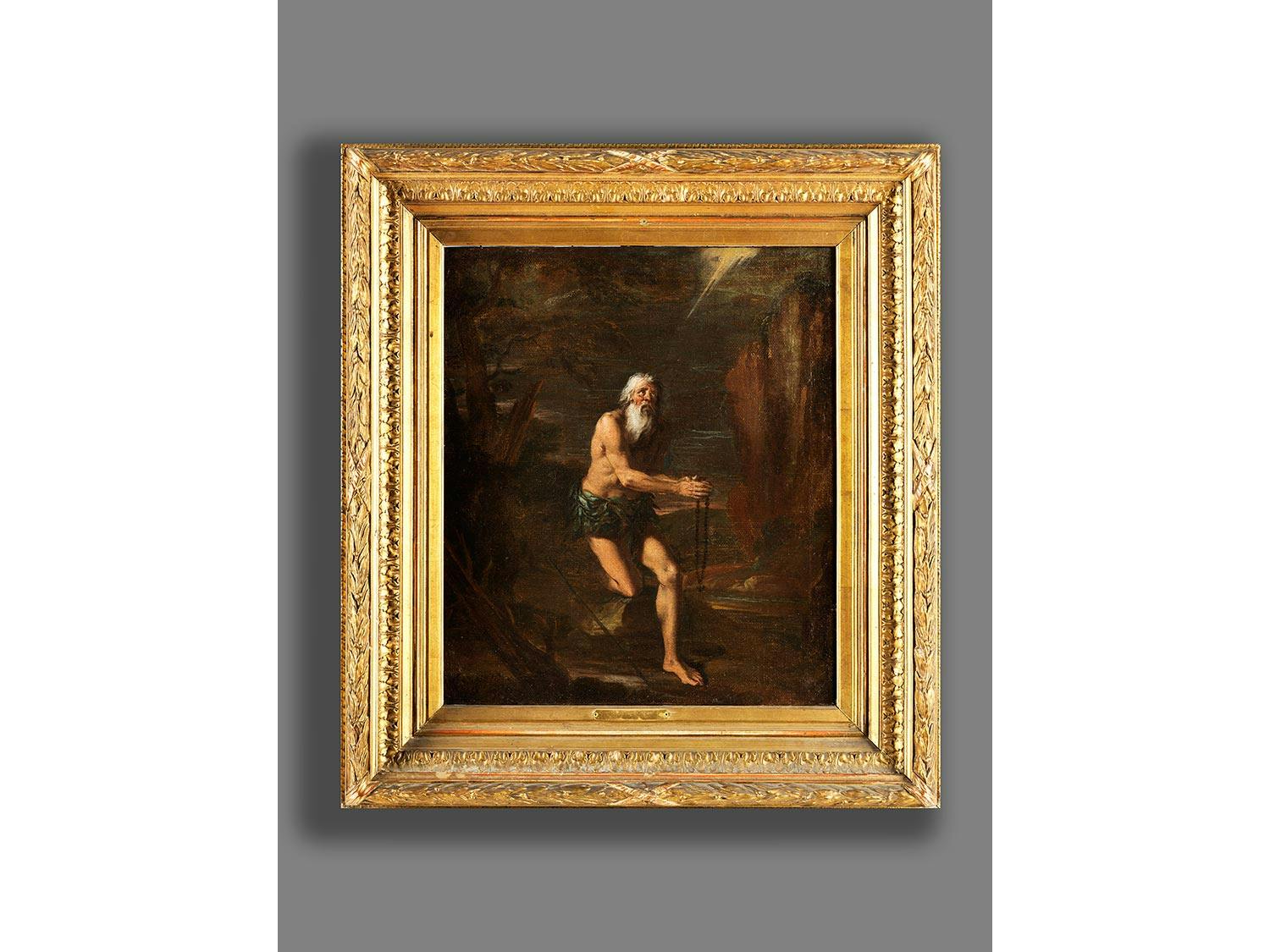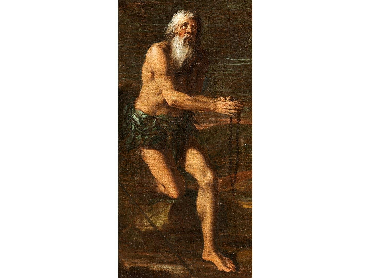 Das Gemälde zeigt eine Episode aus dem Leben des Heiligen Onuphrius, der um das 4. Jahrhundert als Einsiedler in der ägyptischen Wüste in völliger Einsamkeit lebte, nur mit Grasbüscheln bekleidet und unaufhörlich betete. Er wird hier als reifer bärtiger Mann dargestellt, sehr schlank und nur mit einem Lendenschurz aus Blättern bekleidet, wie er durch eine Landschaft geht und einen langen Rosenkranz in der Hand hält, wohl als Hinweis auf sein ständiges Beten. Der Gesamtcharakter des Werkes ist durch schnelle Striche und eine kräftige Betonung gekennzeichnet, sowie durch ein intensives Hell-Dunkel, typisch für Salvator Rosa und seine Werkstatt.