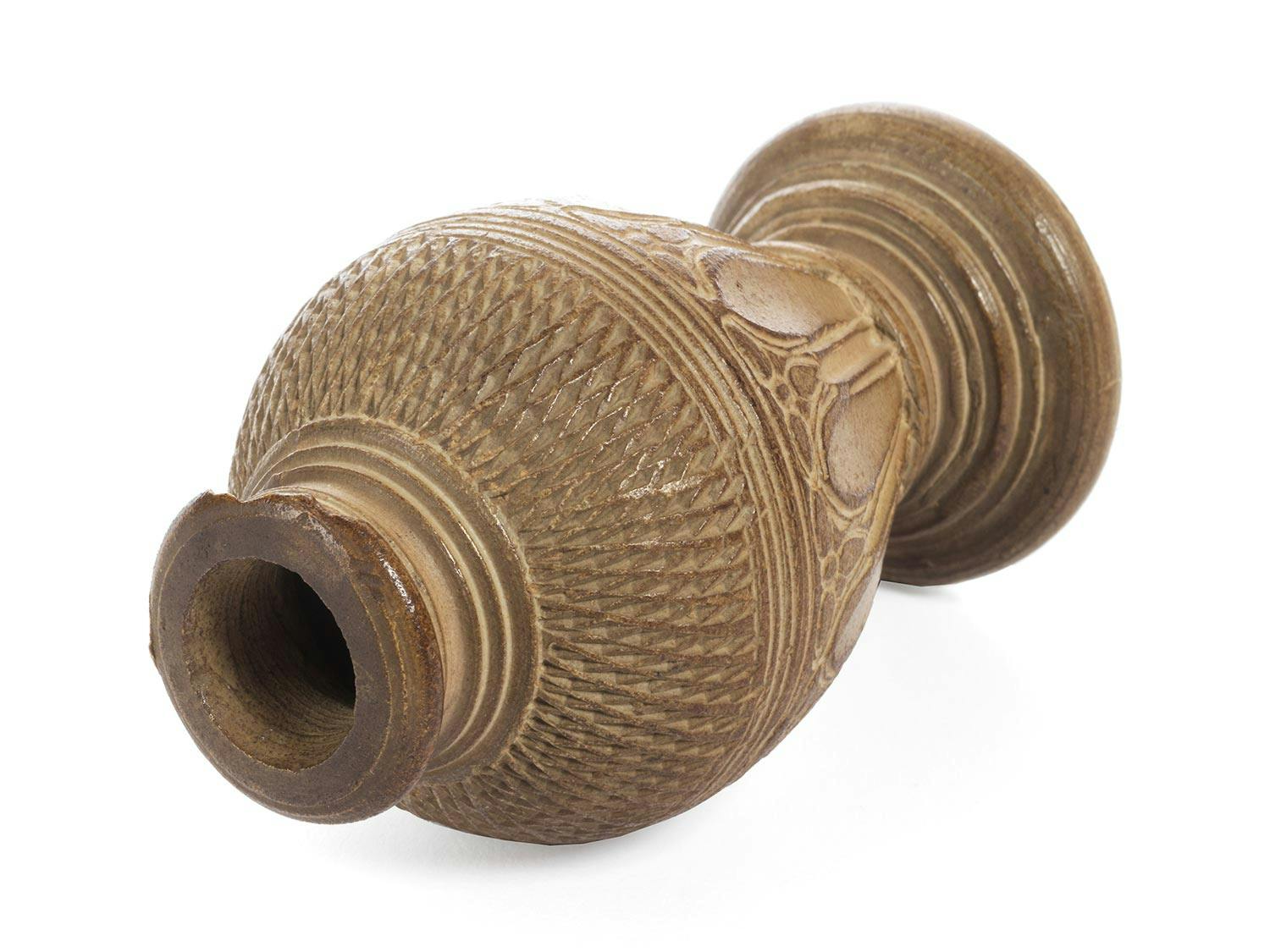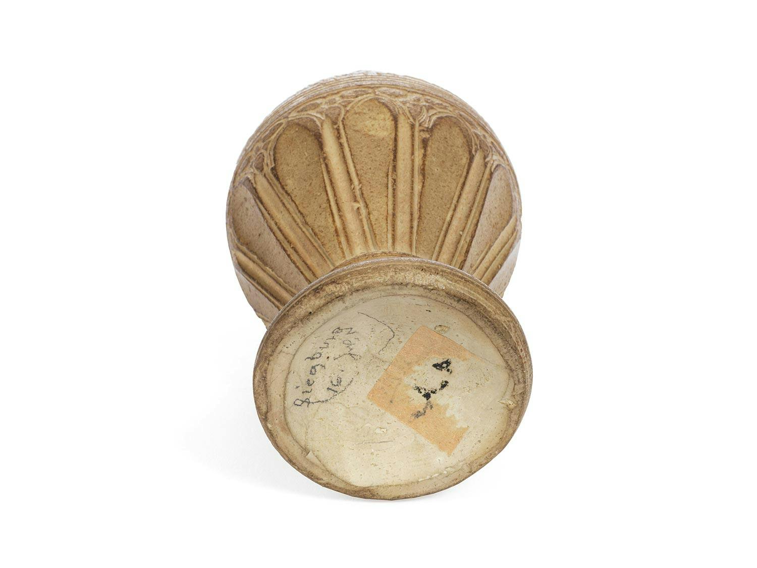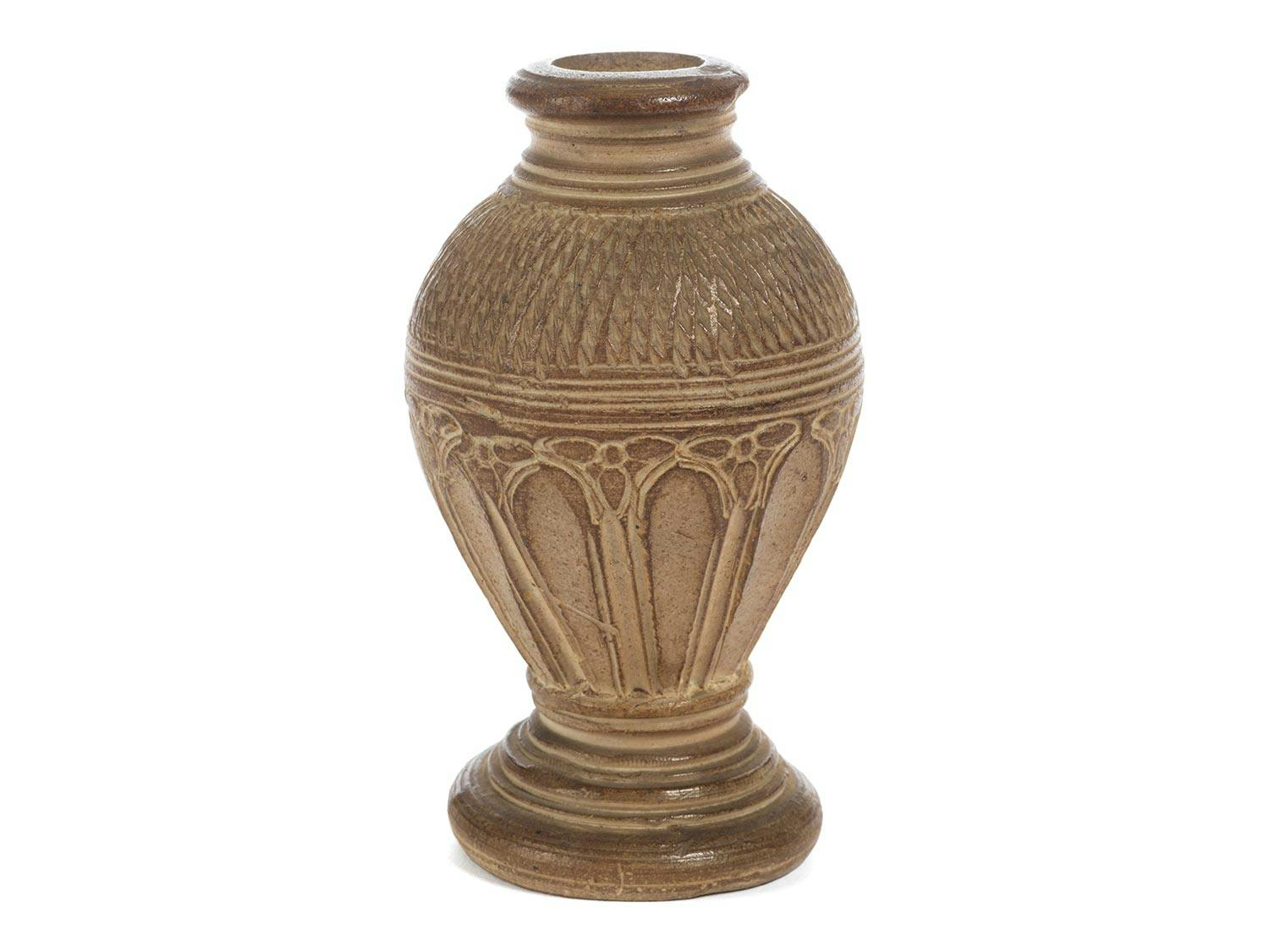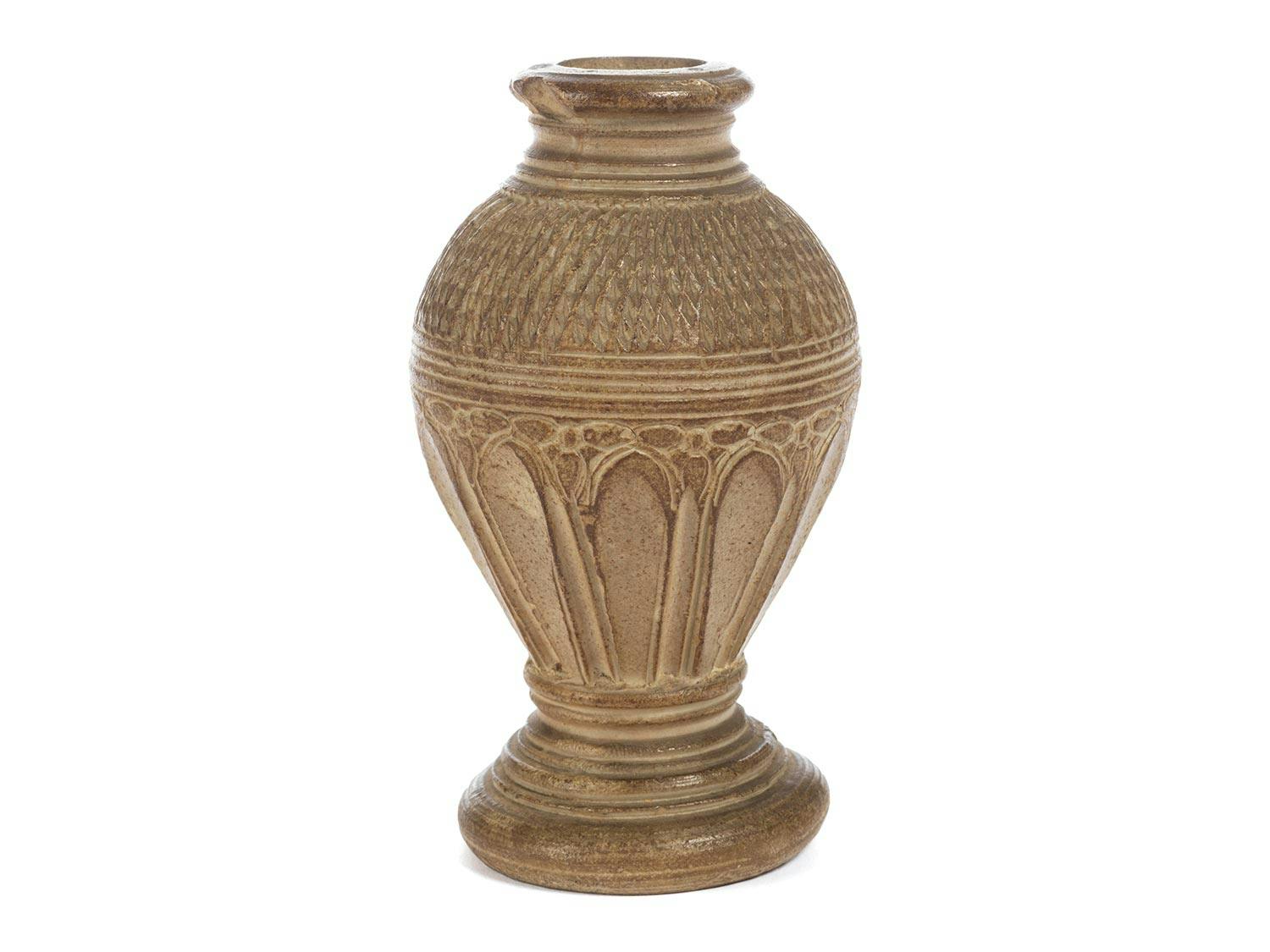 In Feinsteinzeug gearbeitete Balustervase als seltenes Formstück. Leicht erhabener Boden mit mehrfach profiliertem Fuß. Balusterkorpus mit Rundbogenkartuschen, Profilrillen auf der Schulter und Mattenrelief zur auskragenden Mündung führend. Diese durch Profilring stark betont und im Gegensatz zu den Krügen der Zeit keinen Trichter zeigend wie sie etwa bei zeitgenössischen Stillleben von Georg Flegel und anderen Künstlern vorkommen, sodass eine ursprüngliche Funktion als Vase angenommen werden kann. Minimal besch. (1440803) (13)