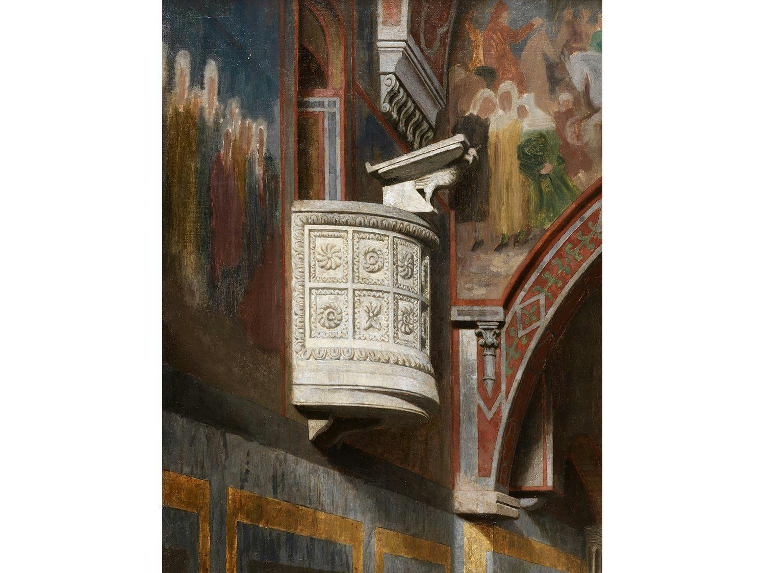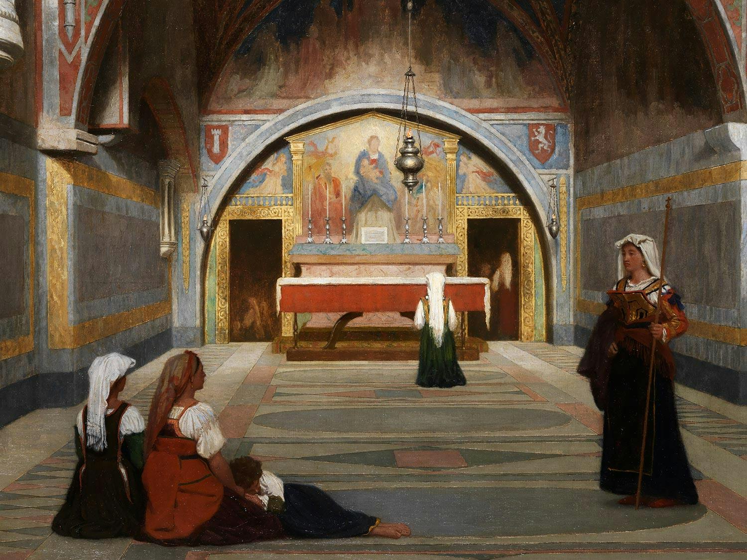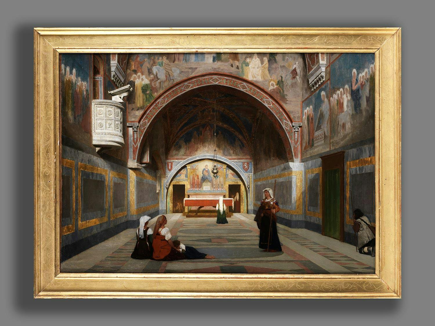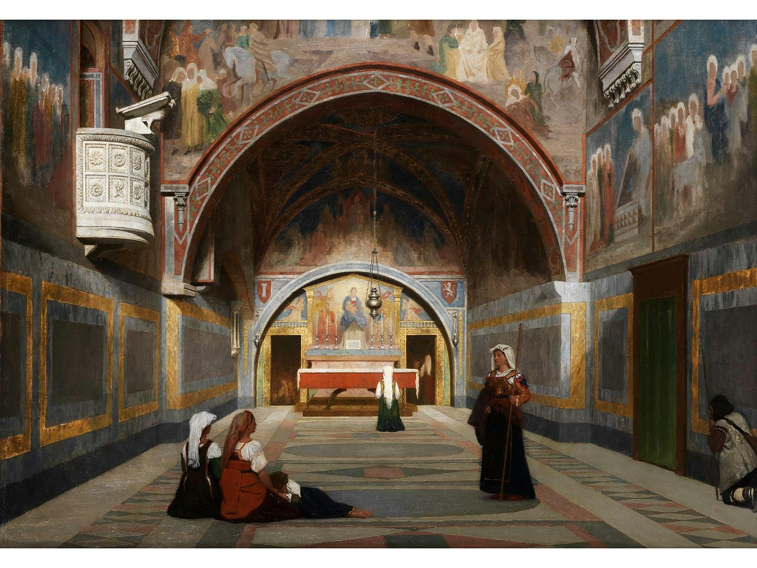 Blick in einen großen Altarraum mit vollständig bemalten Wänden und einer auf der linken Wand eingelassenen steinernen Kanzel. In der Mitte des Hintergrundes der Altar, vor dem eine Frau kniet; jeweils links und rechts davon eine Tür. Im Vordergrund zwei sitzende Frauen mit Kind, eine stehende Frau in kostbarer Tracht mit einem langes Kreuzstab in der linken Hand sowie ein kniender Mann an der rechten Wandseite. Harmonische, Ruhe ausstrahlende Darstellung mit feiner Licht- und Schattenführung. (1451171) (3) (18)