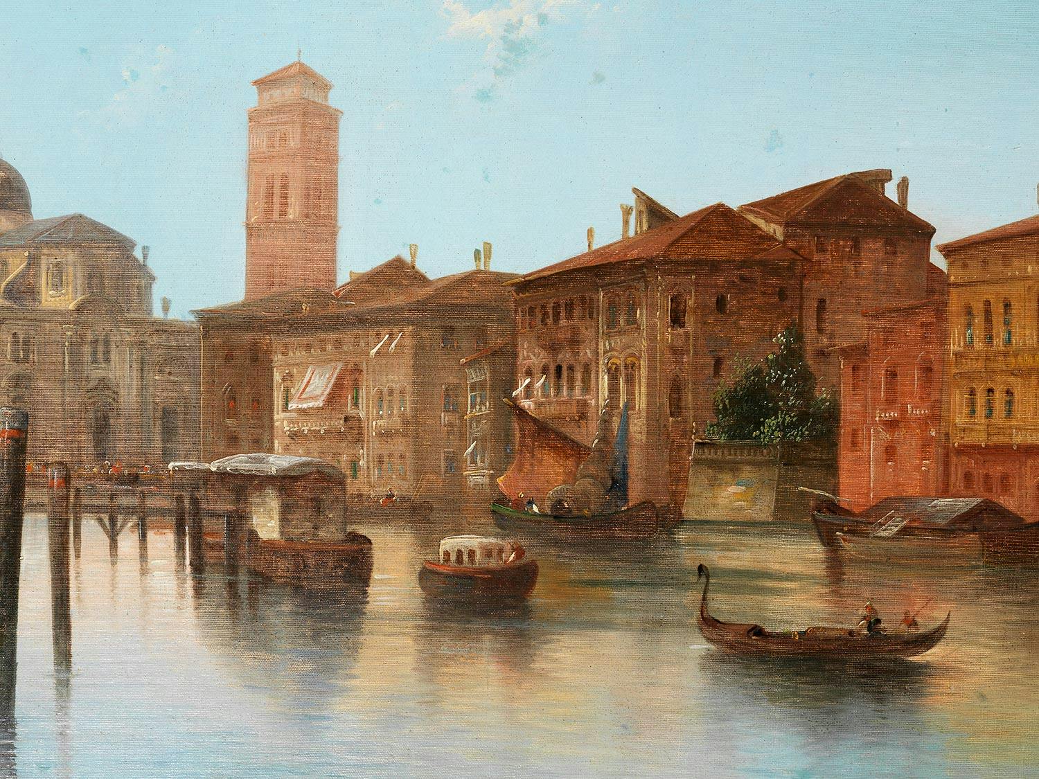 Blick über ruhiges Kanalgewässer mit reizvoll akzentuierter Figurenstaffage und nach hinten abschließender barocker Kirchenfassade und Campanile.