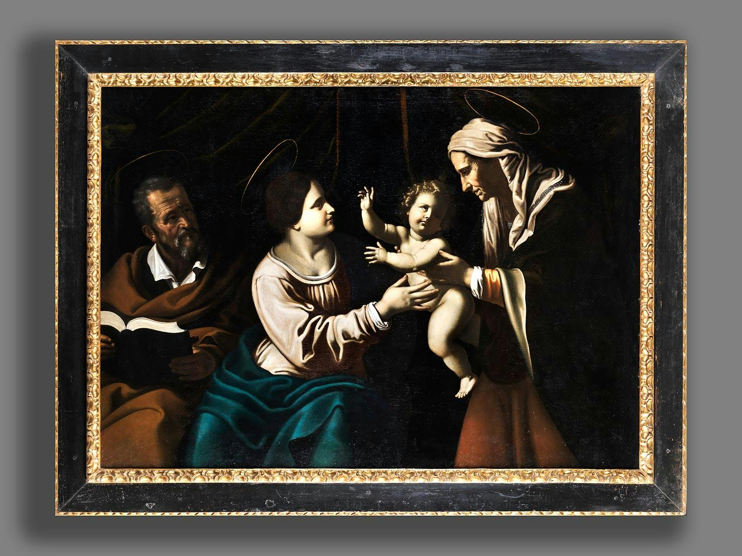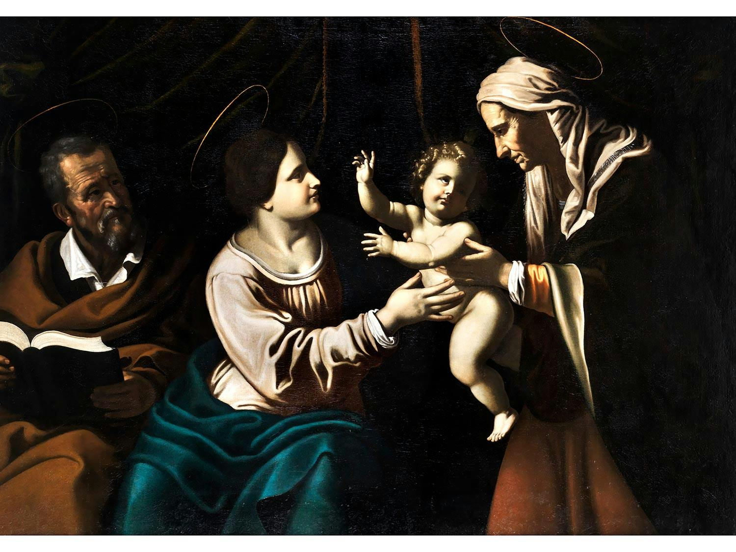 Vor unbestimmtem Grund, der nur durch einige Architekturstreben das Raumgefüge eines ruralen Gebäudes erhält, sitzen im Zentrum die caravaggesk erhellten Maria mit dem Kinde, zu ihren Seiten der in einem Buch lesende Josef oder Joachim, rechts die Heilige Anna. Die Figuren bis auf das Jesuskind mit einem Ringnimbus bedacht. Eine weitere Version, in der Josef ins hintere Zentrum gerückt ist (115 x 147) wird in der Staatlichen Kunsthalle Karlsruhe (Inv.Nr. 458) verwahrt. Durch die Figurenvariation wird die Wahrscheinlichkeit erhöht, dass es sich bei dem vorliegenden Gemälde um eine eigenhändige Variante handelt.