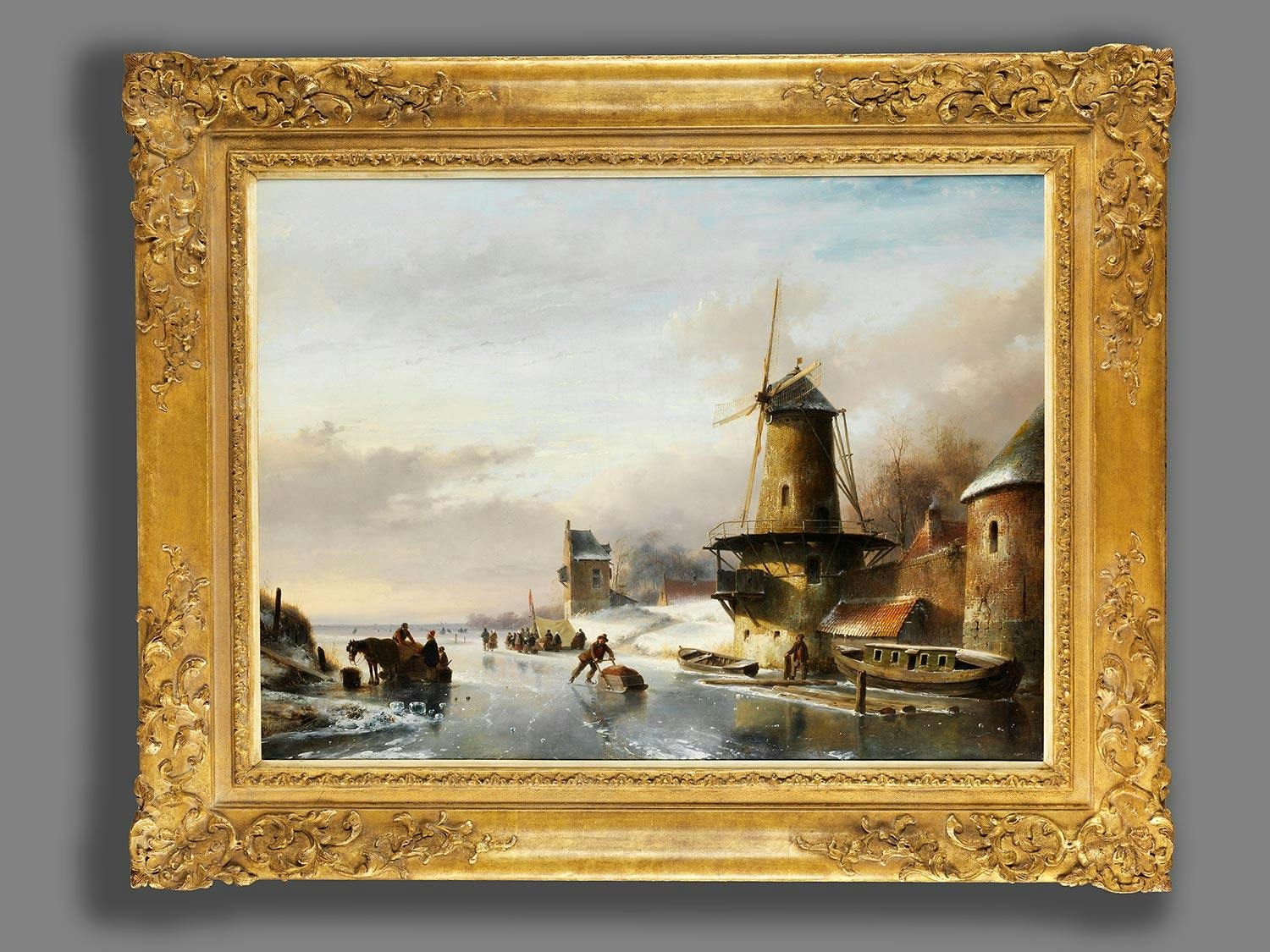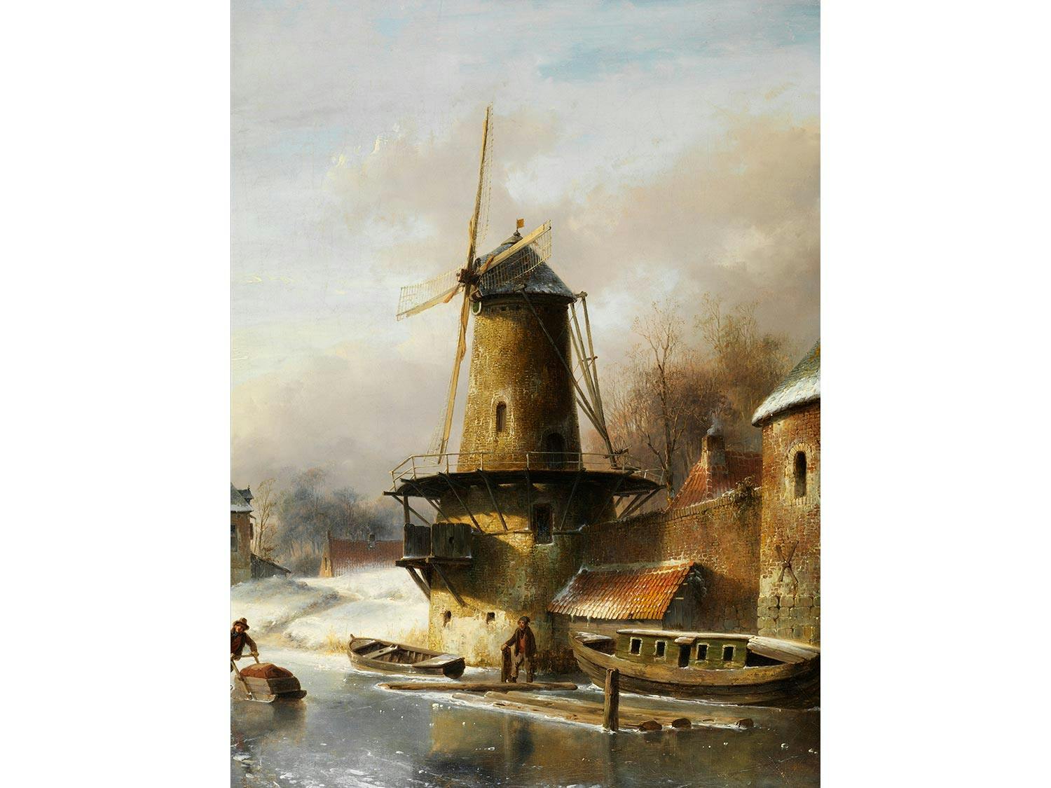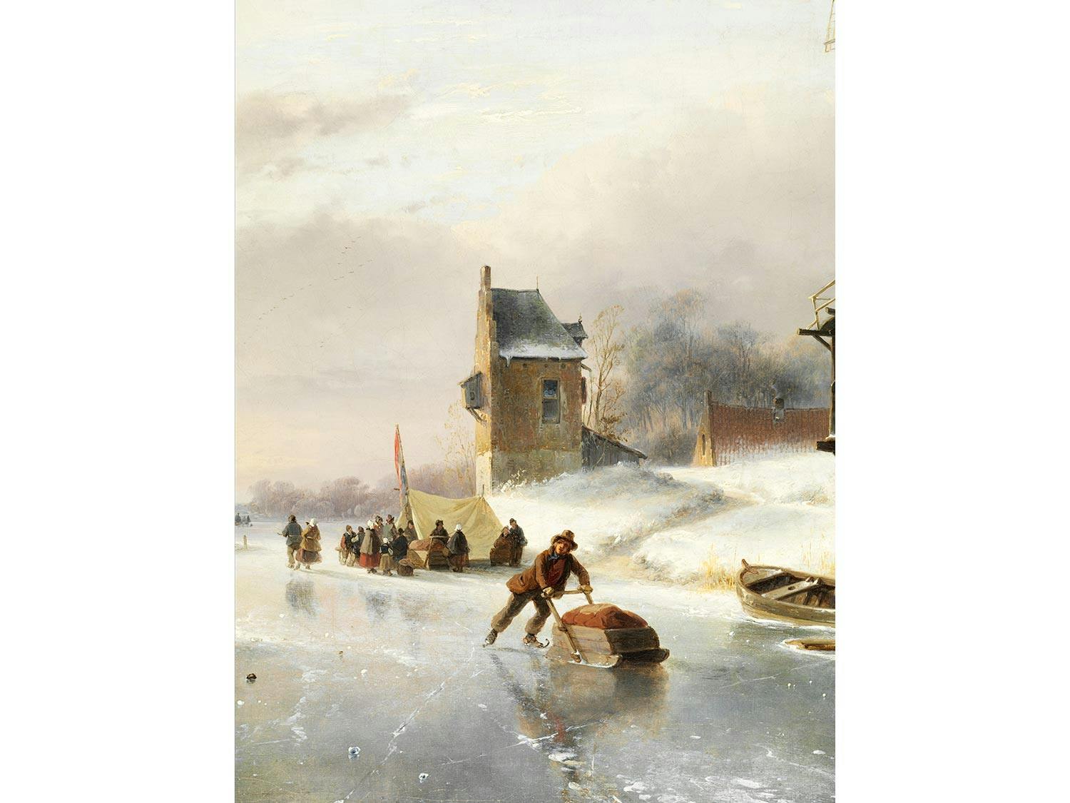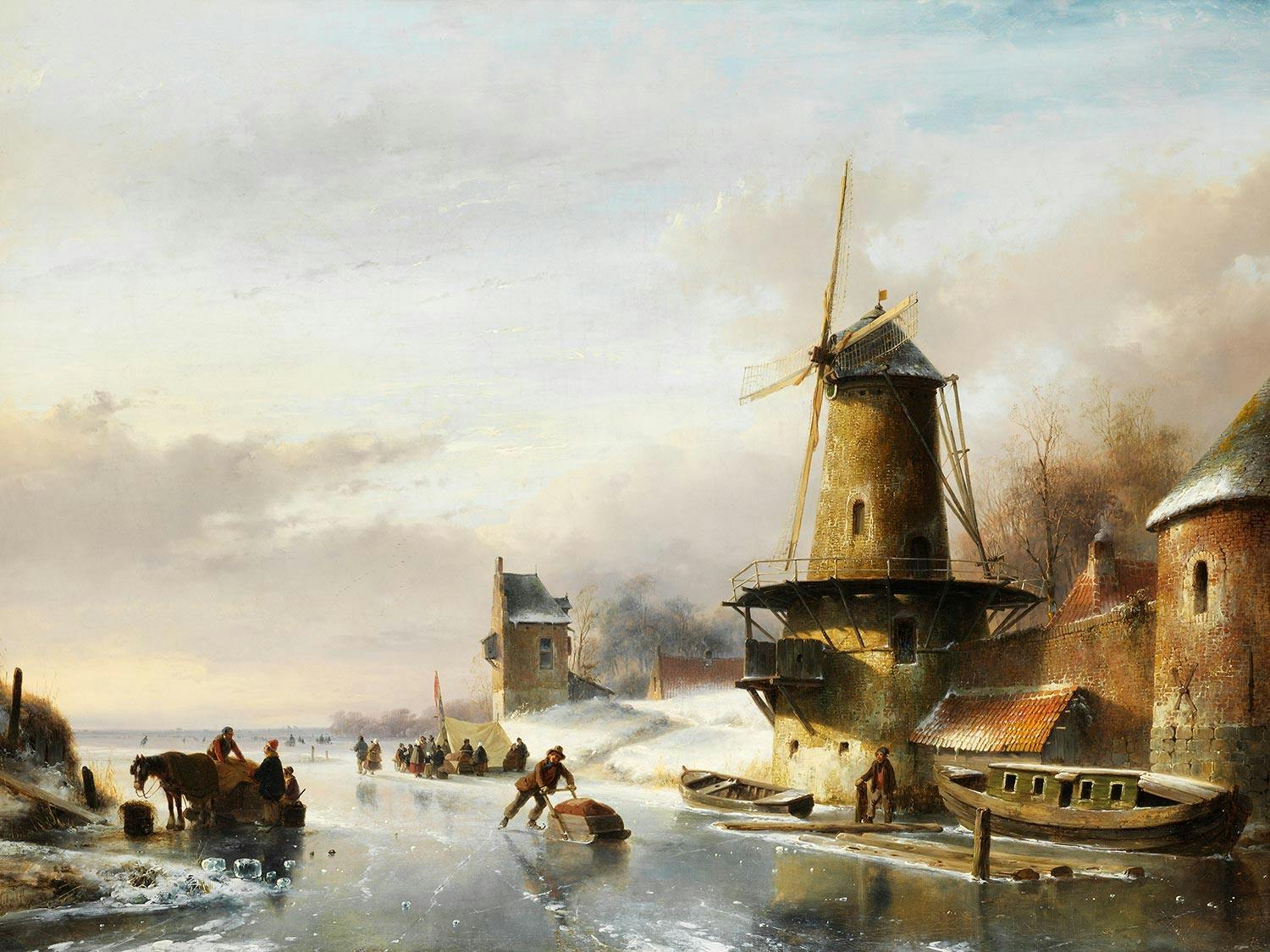 Das in der Sonne glitzernde Poldergewässer vor einer befestigten Stadt bietet nicht nur als Transportweg die Möglichkeit Waren auf rasche Weise zu befördern, sondern es wird auch von Figuren für Winterfreuden genutzt – im Mittelgrund ein Zelt, aus dem Waren verkauft werden. Rechts am Rande der Stadt steht zudem eine Windmühle, deren Tücher abgenommen sind und die so auf den nächsten Wind wartet.