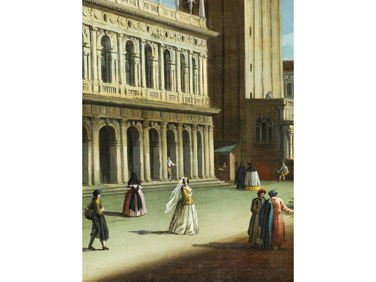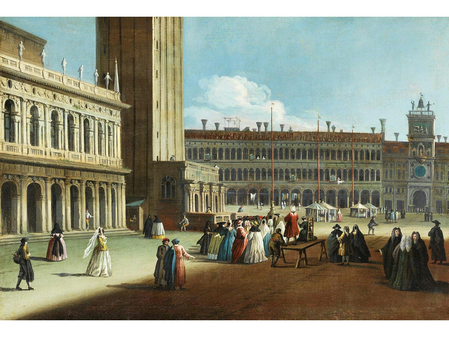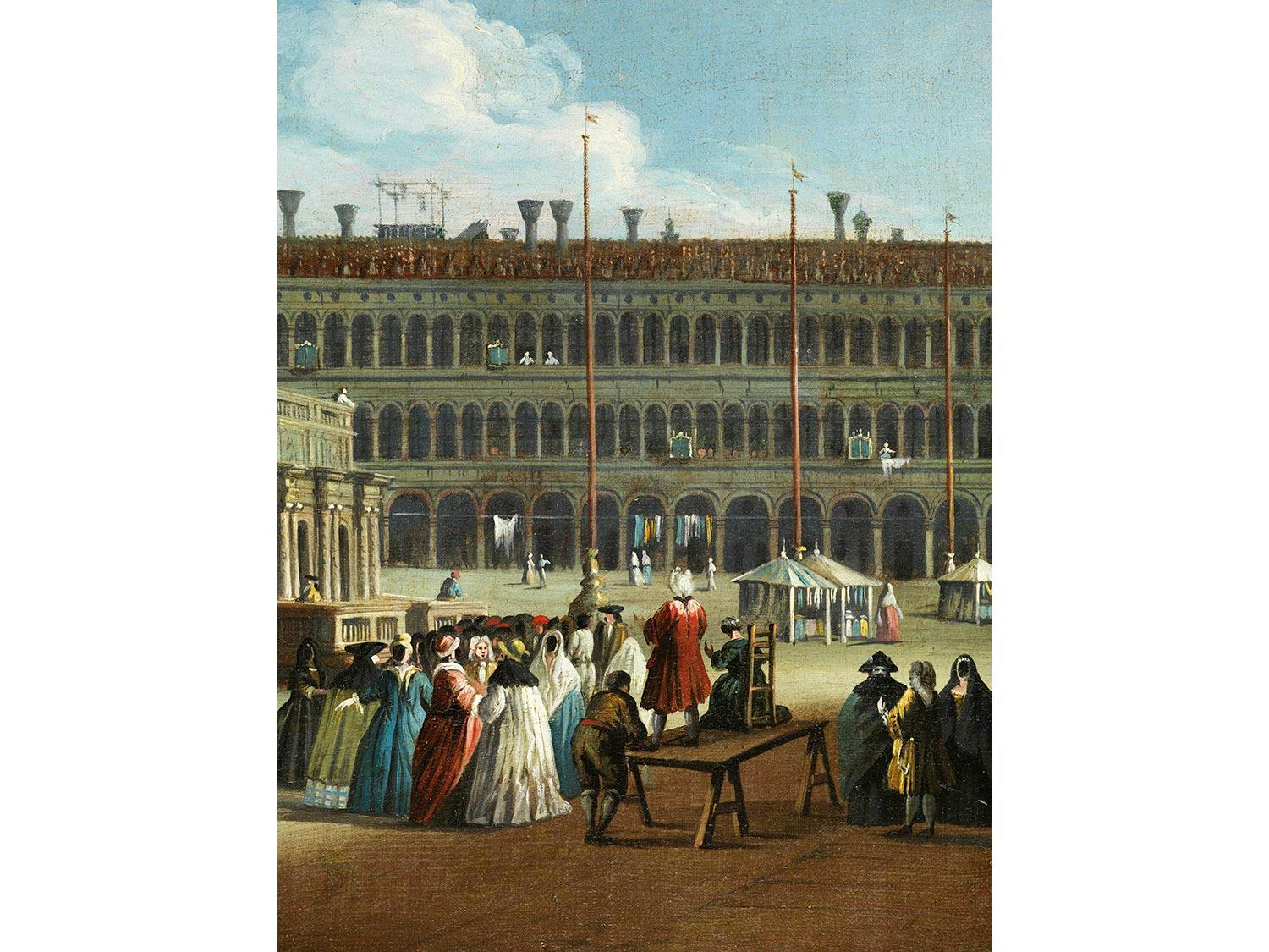 Darstellung des Markusplatzes mit dem unteren Teil des Campanile und dem hinten abschließenden Torre dell’Orologio. Zahlreiche davor befindliche Figuren und ein Schausteller. Der in Stockholm geborene Richter verließ 1665 seine Heimat und zog nach Venedig. Er begann, sich auf das Genre der Veduten zu spezialisieren, die besonders bei Ausländern auf großes Interesse stießen. Richter blieb bis an sein Lebensende in der Lagunenstadt und spezialisierte sich auf topografische Ansichten und Capriccios, die sich durch leuchtende Farben, bewegte Figuren im Vordergrund sowie durch Boote und Gondeln auszeichnen, die den Raum zwischen den perspektivischen Ebenen akzentuieren. Er war ein Meister im Zusammenfügen von Fantasielandschaften und real existierenden Orten zu originellen Capricci. Seine Ansichten wurden häufig von Luca Carlevaris (1663/65 – 1729/31) inspiriert. (1451053) (13)