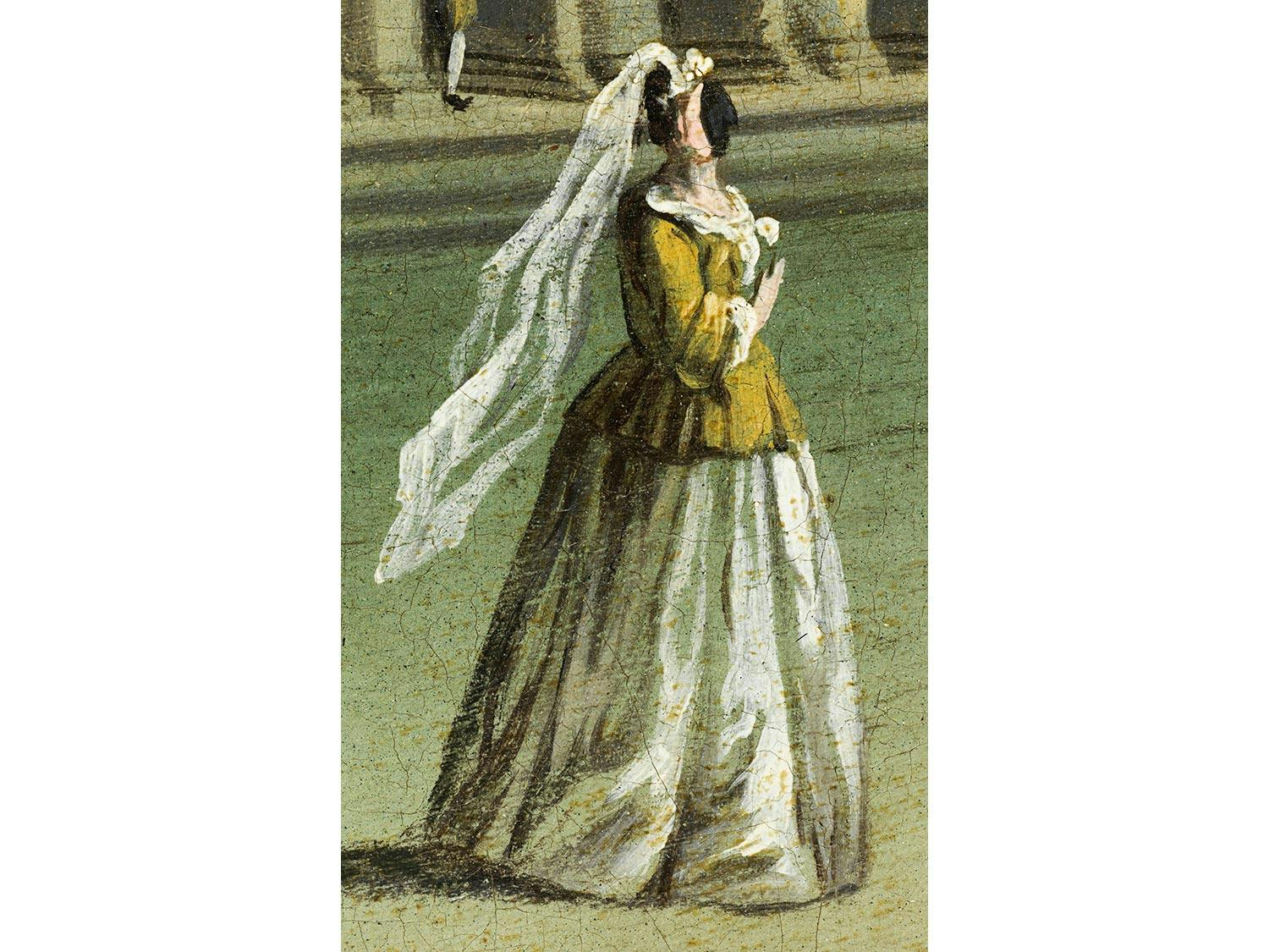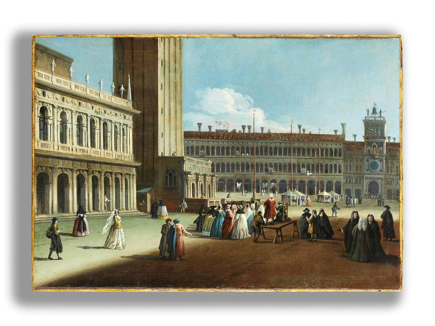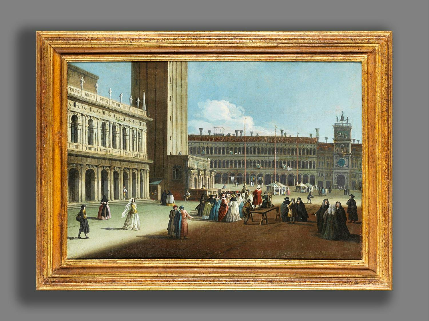 Darstellung des Markusplatzes mit dem unteren Teil des Campanile und dem hinten abschließenden Torre dell’Orologio. Zahlreiche davor befindliche Figuren und ein Schausteller. Der in Stockholm geborene Richter verließ 1665 seine Heimat und zog nach Venedig. Er begann, sich auf das Genre der Veduten zu spezialisieren, die besonders bei Ausländern auf großes Interesse stießen. Richter blieb bis an sein Lebensende in der Lagunenstadt und spezialisierte sich auf topografische Ansichten und Capriccios, die sich durch leuchtende Farben, bewegte Figuren im Vordergrund sowie durch Boote und Gondeln auszeichnen, die den Raum zwischen den perspektivischen Ebenen akzentuieren. Er war ein Meister im Zusammenfügen von Fantasielandschaften und real existierenden Orten zu originellen Capricci. Seine Ansichten wurden häufig von Luca Carlevaris (1663/65 – 1729/31) inspiriert. (1451053) (13)