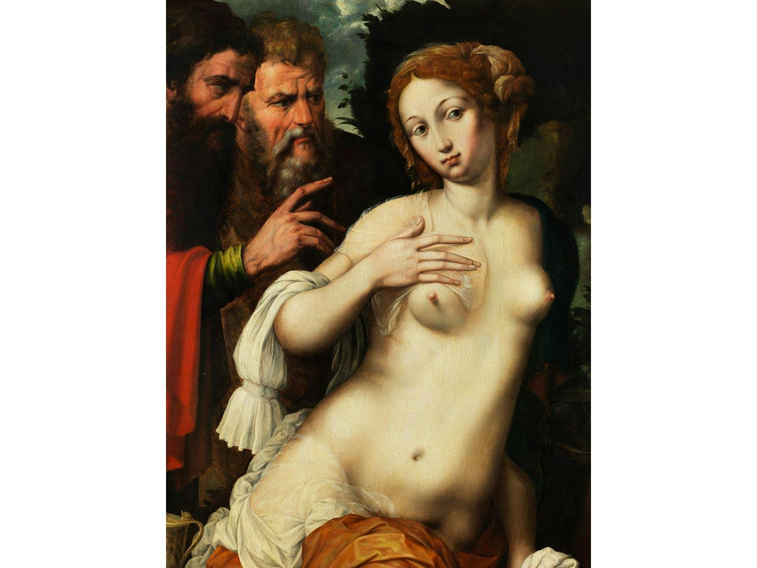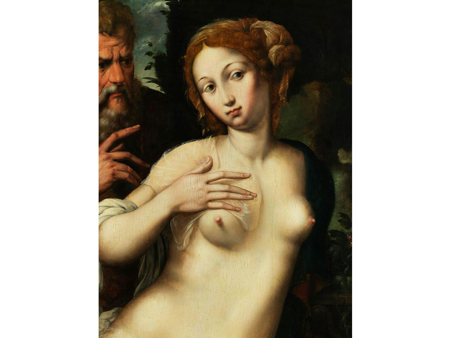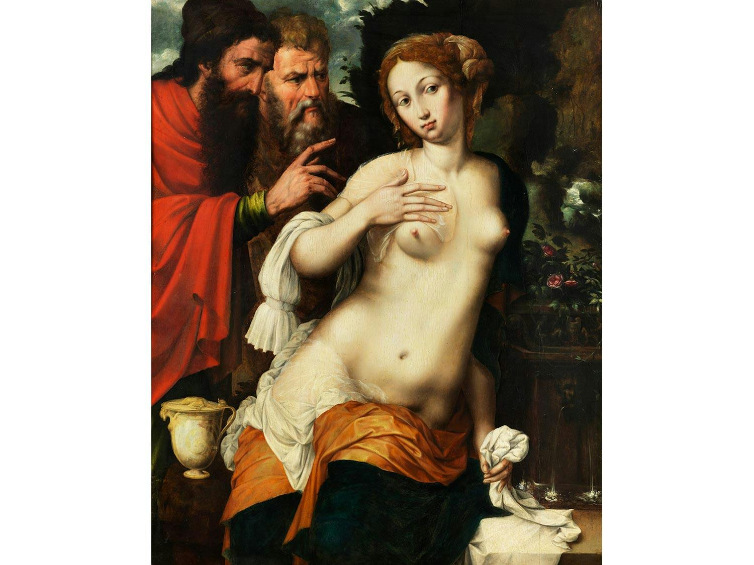 SUSANNA UND DIE BEIDEN ALTENÖl auf Holz. Verso breite Parkettierleisten.