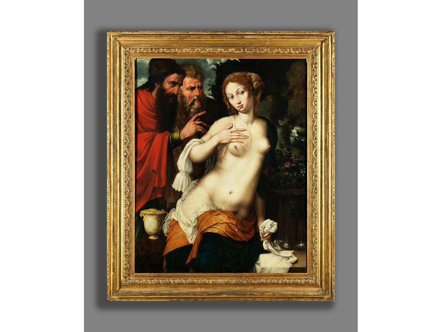 Das Thema des Alten Testaments hier in hoher malerischer Qualität vorgeführt. Susanna im Vordergrund mit entblößtem Oberkörper, das Kleid bedeckt lediglich den Ansatz der Scham und zieht zum rechten Knie herab. Ihre S-bogig leicht gedrehte Haltung zeigt sich gänzlich im Stil des Manierismus. Das Inkarnat in betonter Leuchtkraft hervorgehoben vor dem Hintergrund und den beiden, etwas dunkler wiedergegebenen, bärtigen Männergestalten links im Bild. Links unten ein Alabaster-Badegefäß, rechts die Bronzewandung eines Brunnens mit Löwenmaskaron, aus dem Wasser in ein tieferes Becken rinnt. Darüber Rosenblüten zwischen Strauchblättern sowie ein in kleinen Kaskaden herabführender Wasserlauf. Susanna legt ihre rechte Hand mit betont langen Fingern über die Brust, ihre linke hält ein Badetuch. In Gesichtsausdruck und Körperhaltung ist sie gezeigt, als ob sie nachdenklich innehält, bevor sie das drängende Angebot der Alten – dem Bibeltext gemäß – ablehnt. Der Malstil steht durchaus in Nähe der so bedeutenden Maler wie Jan Massys oder Jan und Cornelis Quentin. Wie so häufig ist auch hier bei dem flämischen Maler neben seiner stilistischen flandrischen Herkunft der Einfluss Italiens stark spürbar. Letztlich ist das Gemälde eines der bedeutenden Beispiele der italo-flämischen Malerei des ausgehenden 16. Jahrhunderts.