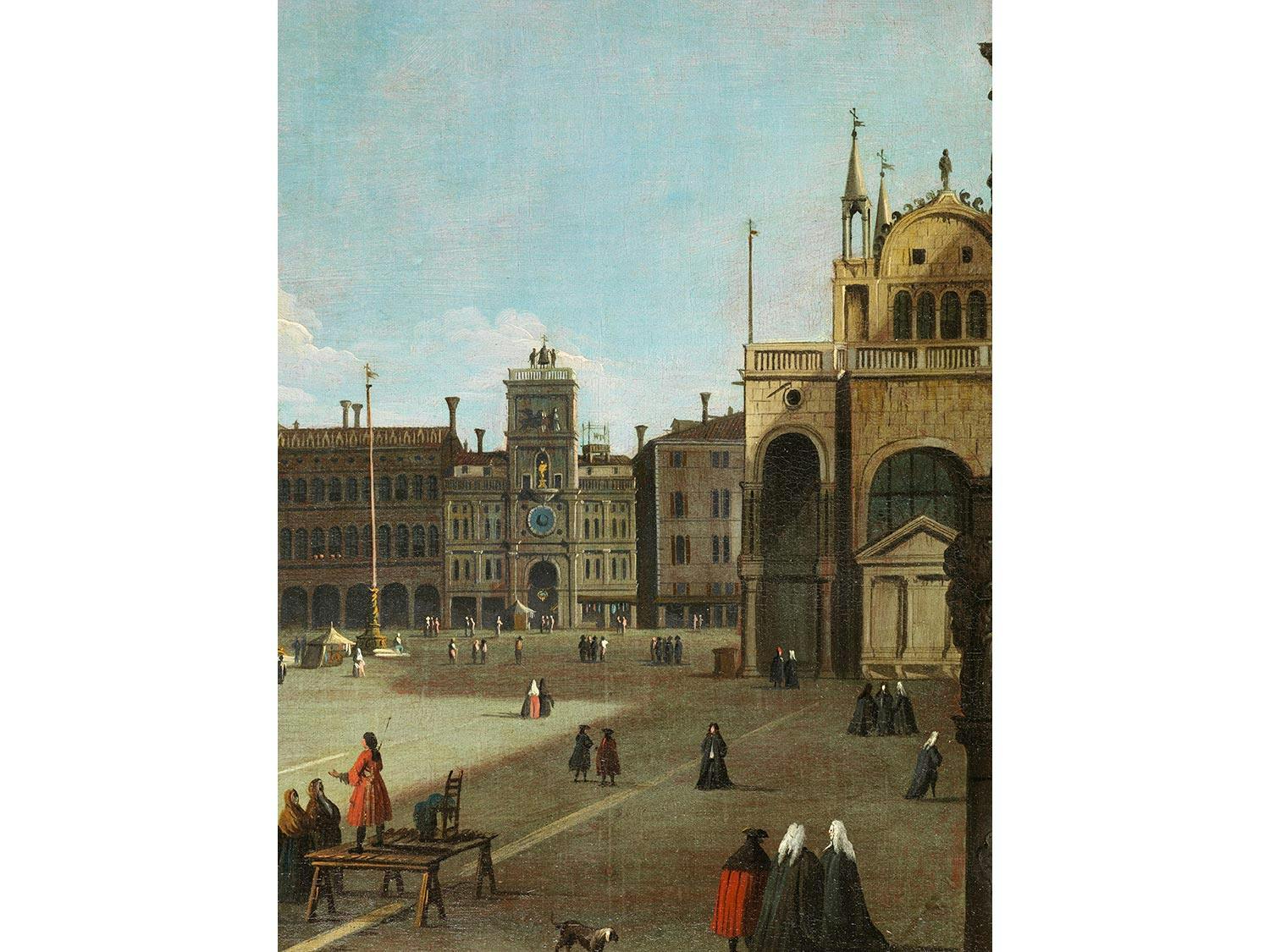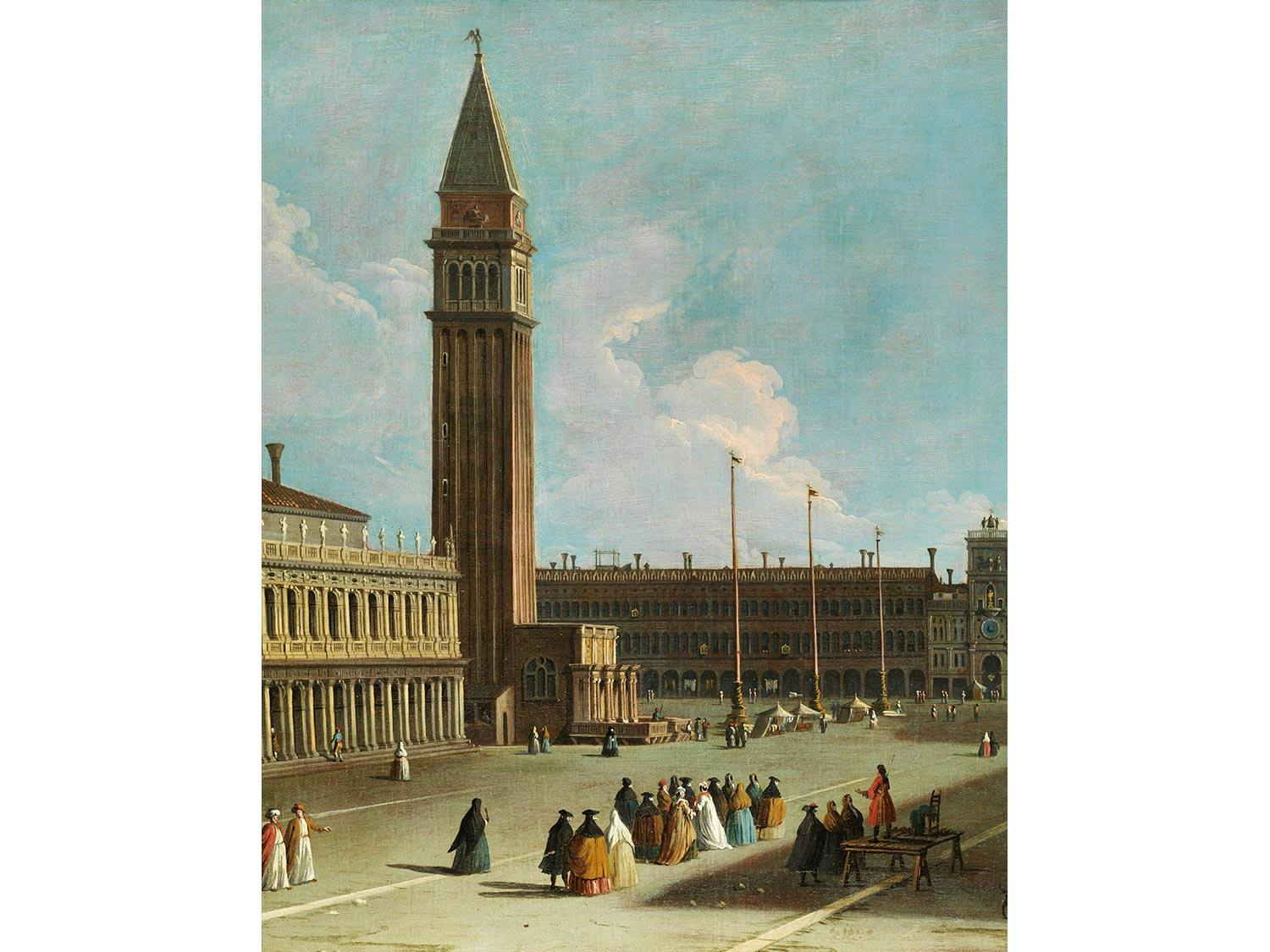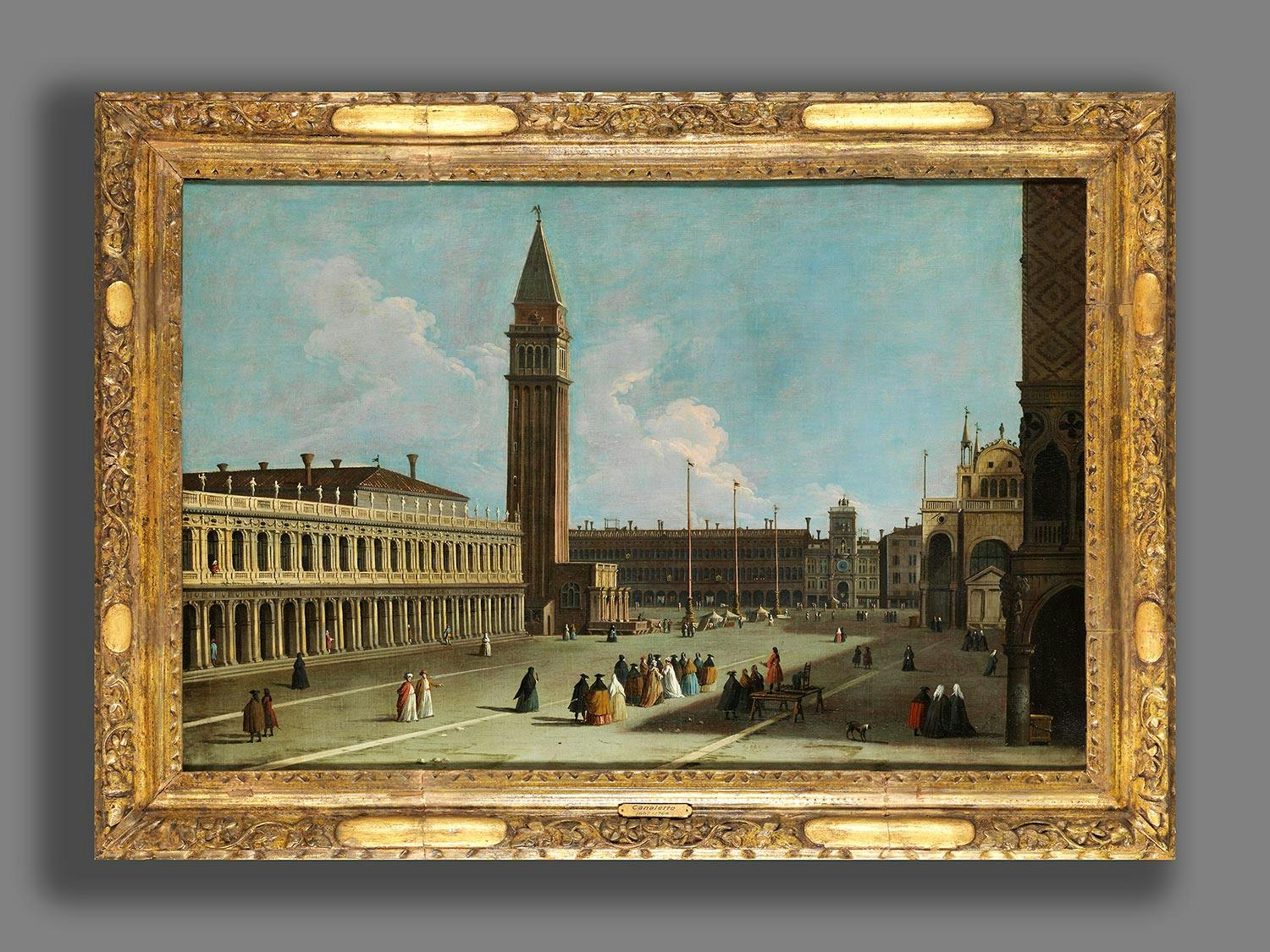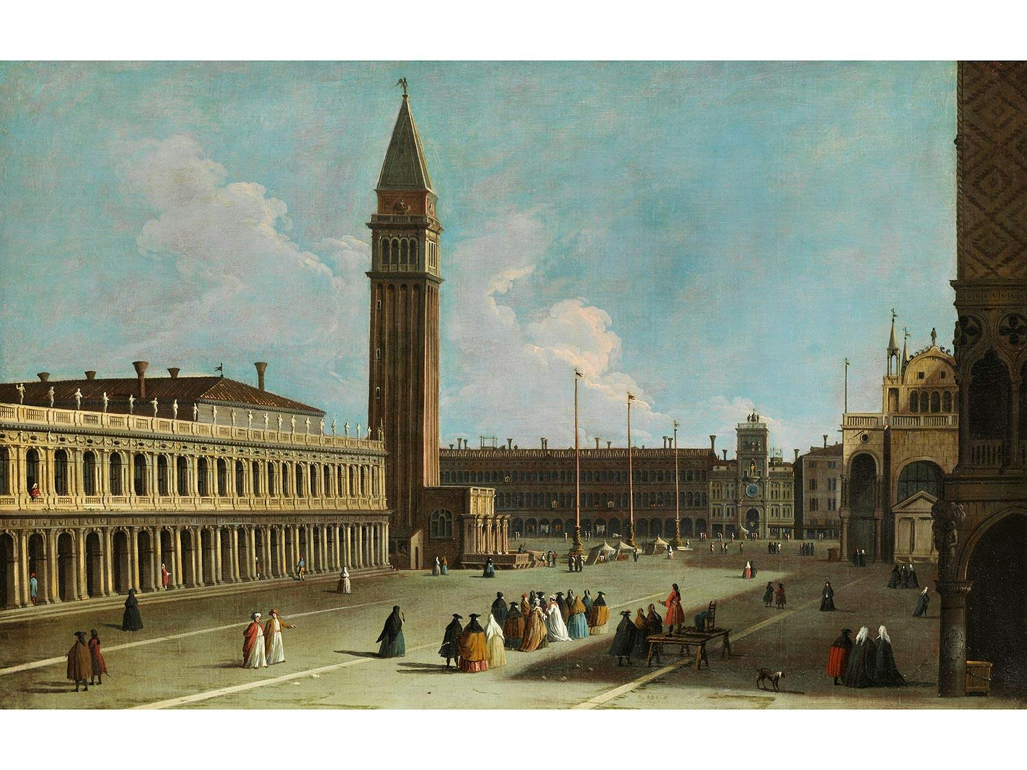 Unter strahlend blauem Himmel mit einer Wolkenstaffage, welche das intensive Blau des Himmels als Kontrastmittel betont, gleitet der Blick des Betrachters hinweg über die Piazetta hin zum Torre dell’Orologio. Zur Linken die Libreria, dann der Campanile und die Logetta des Jacopo Sansovino; die Procuratie Vecchie und rechts die Basilica di San Marco.